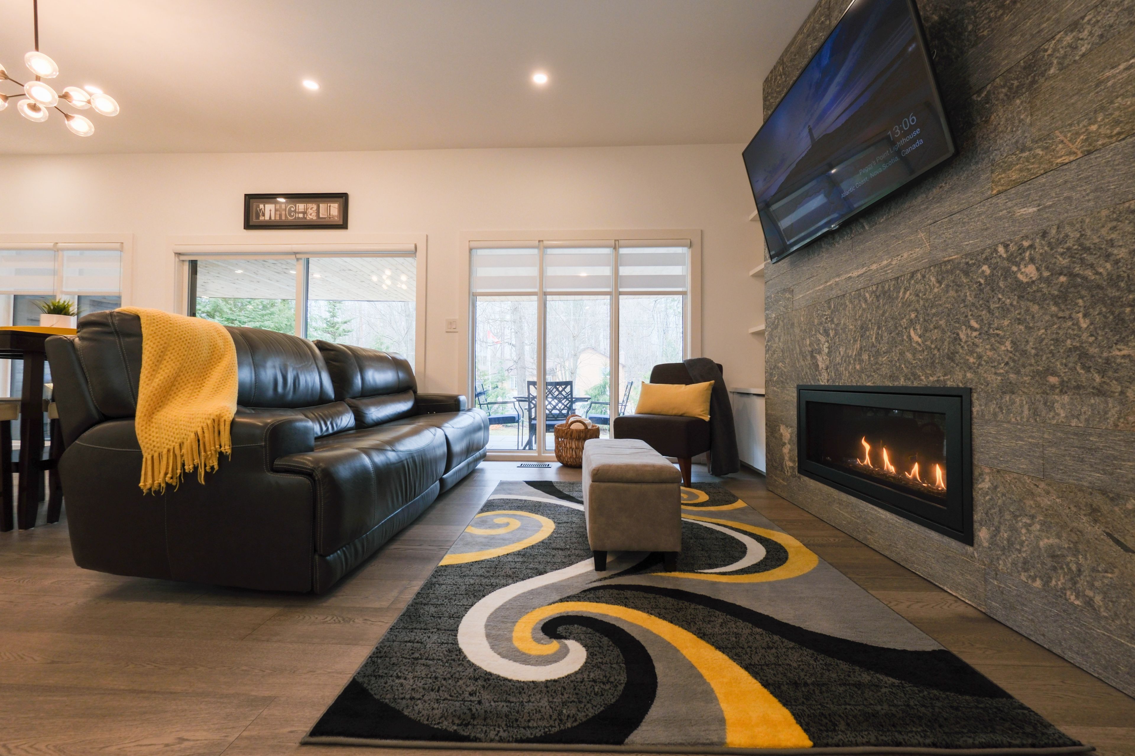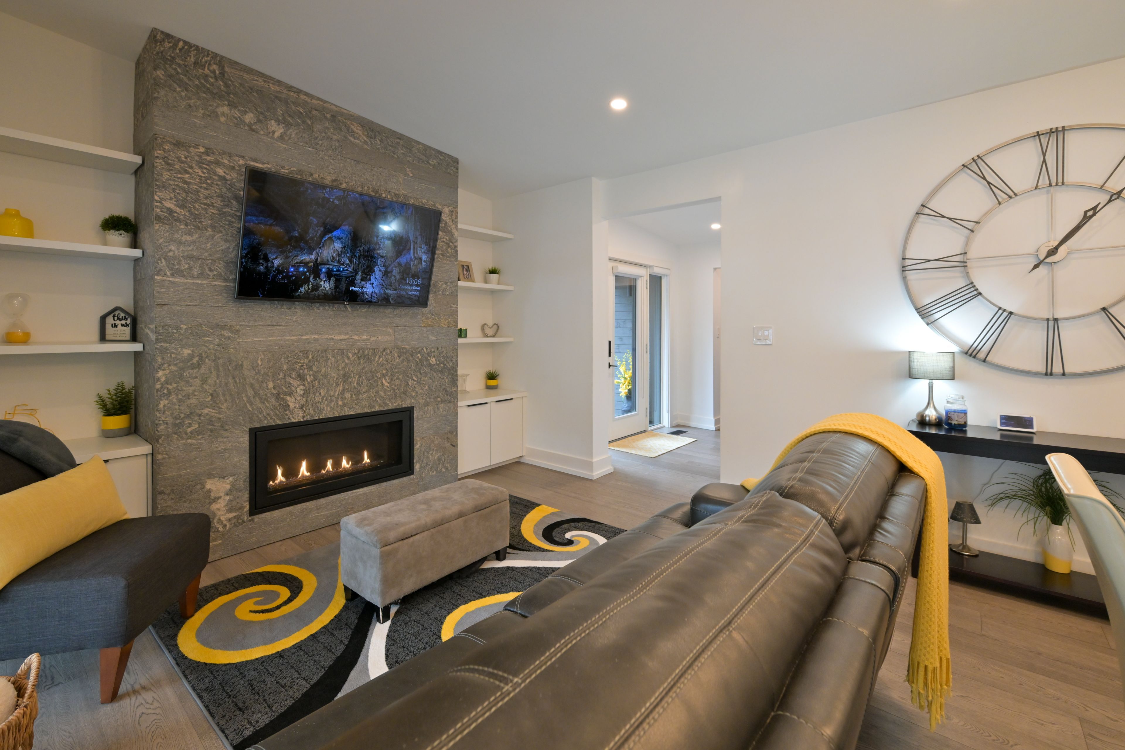 • Open-concept living space with gas fireplace and natural light.