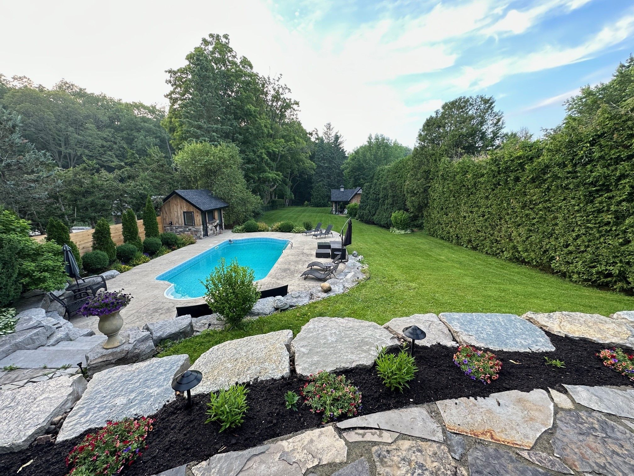 Tucked away amid a lush forest backdrop, this exquisite estate harmoniously blends modern sophistication with the timeless serenity of nature. A true private sanctuary, the expansive grounds offer endless possibilities for grand entertaining and relaxed family living. Sprawling lawns flow seamlessly into a resort-style outdoor oasis featuring a heated pool and lounge area, a cabana with a kitchenette, and a secluded courtyard for intimate gatherings. Inside, over 4,700 sq. Ft. Of above-grade living space (plus an additional 2,000+ sq. Ft. Below) unfolds in dramatic fashion-defined by soaring vaulted ceilings, bespoke finishes, and abundant natural light. The great room showcases a magnificent floor-to-ceiling stone fireplace beneath 11-foot ceilings, while the chef's kitchen impresses with marble countertops, 20-footceiling heights, and an expansive window wall overlooking the private rear grounds. A loft-style recreation area overlooks the kitchen and dining spaces, offering a perfect retreat for family leisure. The elegant primary suite features 13-foot ceilings, a cozy fireplace, a private sitting area, and a spa-inspired five-piece ensuite. Additional highlights include a separate guest or office suite with kitchenette and full bath, a finished lower level with a gym and games room, and an oversized workshop ideal for conversion to a studio, office, or garden house. This remarkable property delivers the tranquility of country living with the refinement of a luxury resort while been locationed in one of aurora's most sought after neighbourhoods.