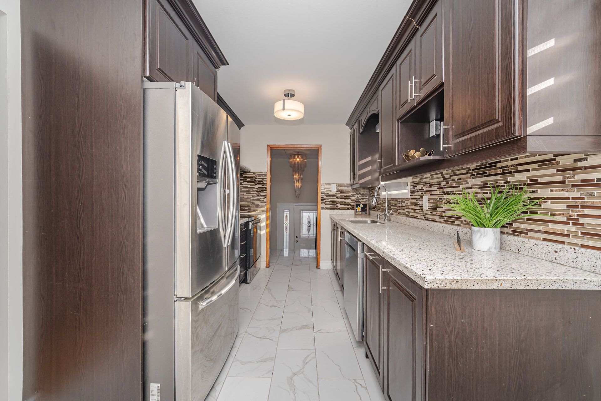Beautiful and spacious 4-bedroom, 5-level backsplit home located in a quiet, family-friendly neighborhood. Features hardwood floors throughout, a large living and dining area with a bright picture window, and an upgraded kitchen with quartz countertops, stainless steel samsung appliances, and a double sink. Enjoy a spacious family room with a fireplace and walkout to a covered solarium and private backyard-perfect for relaxing or entertaining. Includes 3 full 4-piece bathrooms for added convenience. The finished 2-bedroom basement with a separate entrance offers an excellent income-generating opportunity or space for extended family. Situated on a rarely found 150ft deep lot with no rear neighbors, this home provides exceptional privacy and outdoor space. Conveniently located near highways 427, 407, and 401,schools, parks, shopping, the airport, and the go station. A rare find combining comfort, location, and investment potential!
