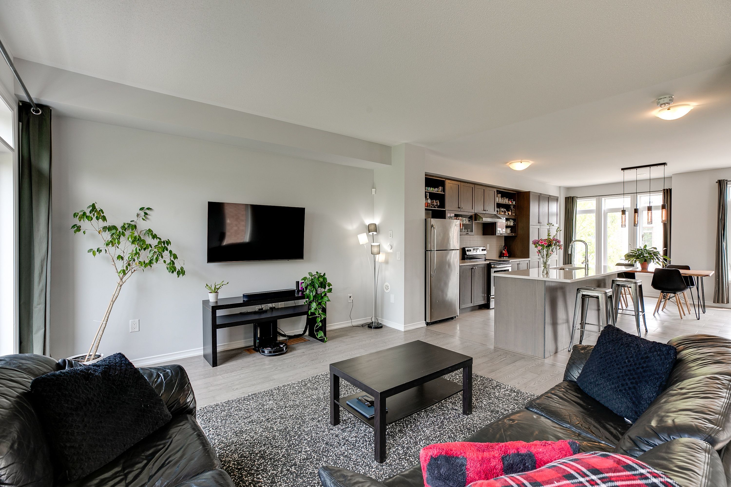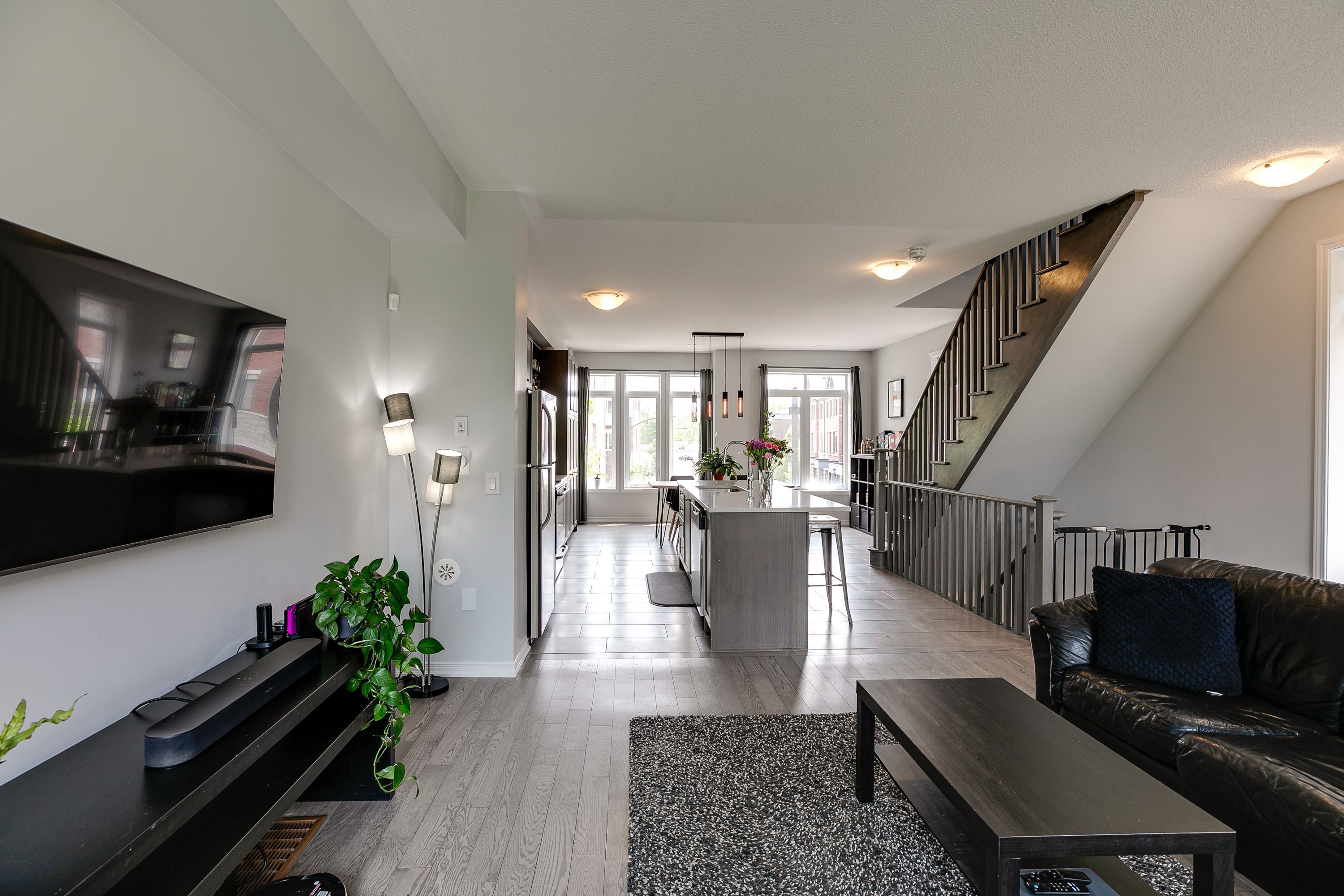 • Open concept living and dining area with 9 ft. ceilings and hardwood flooring.
