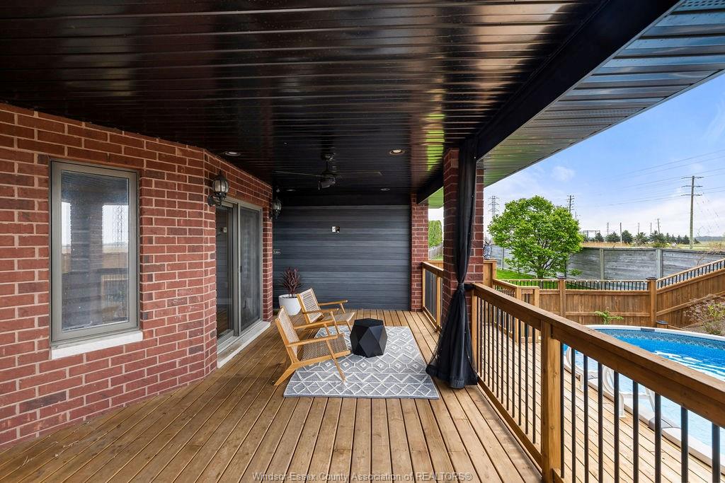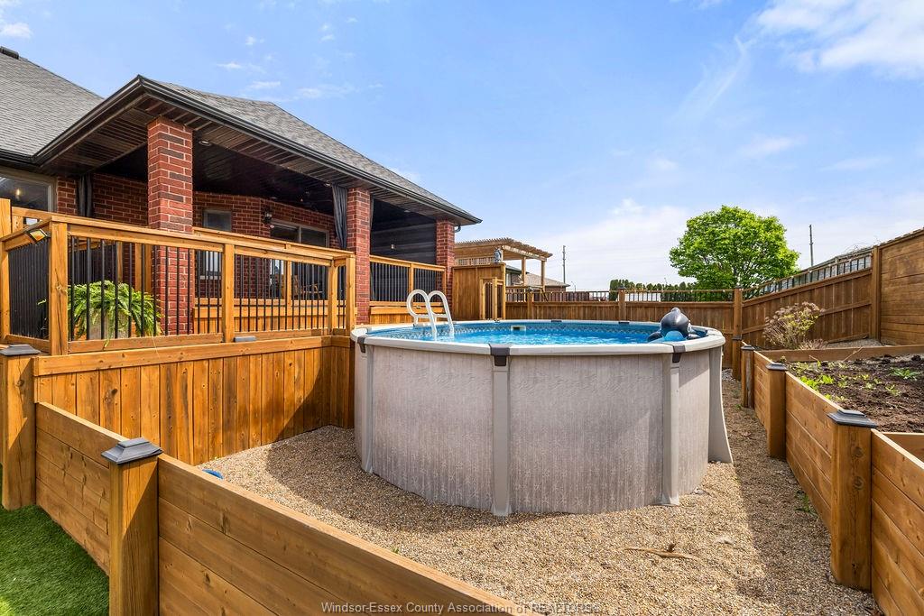 • Maintenance-free yard with a covered porch and heated above-ground pool.