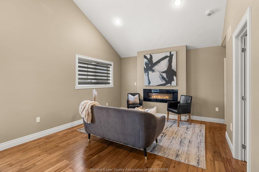 • Spacious living room with hardwood floors and a cozy gas fireplace.