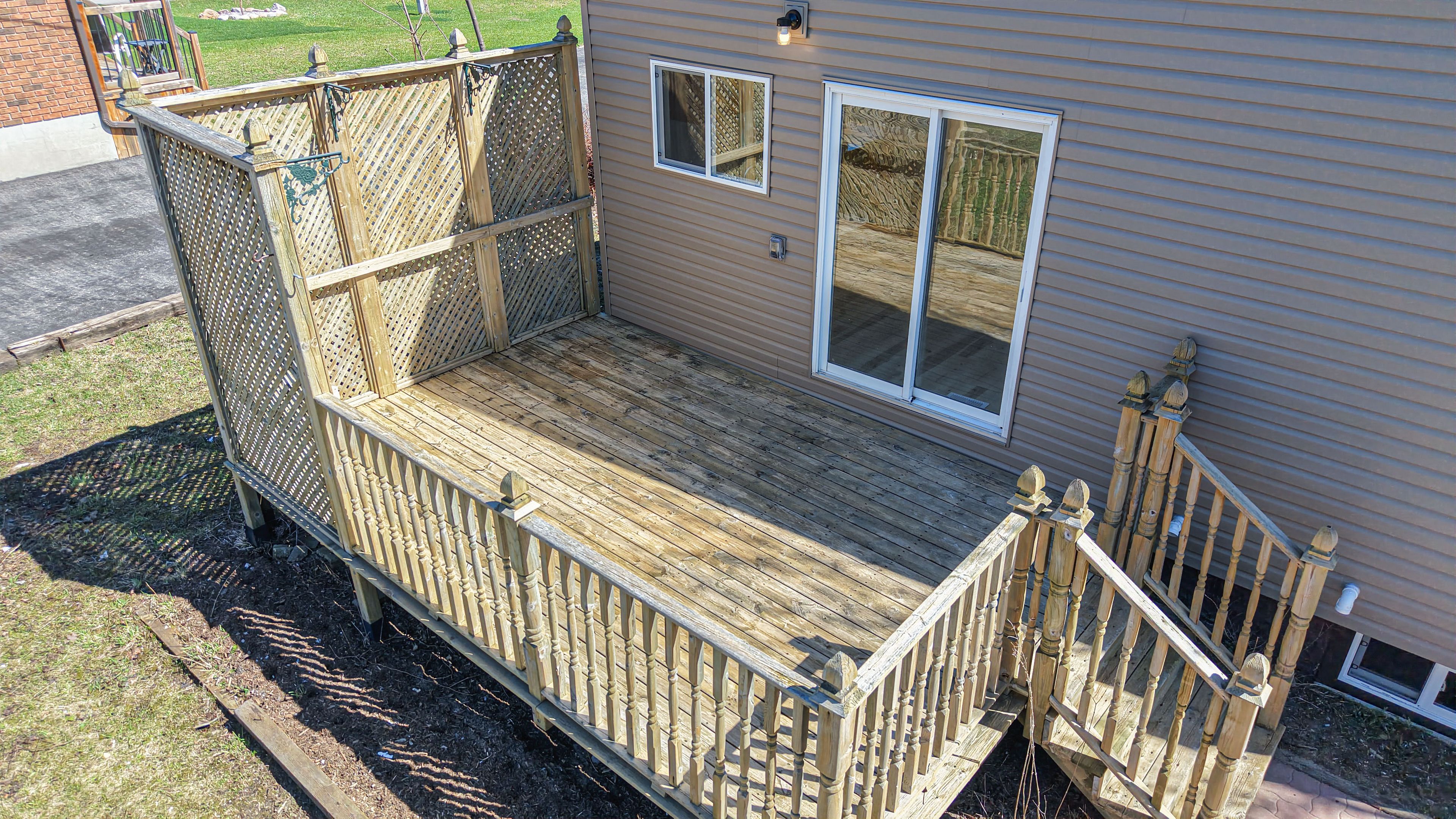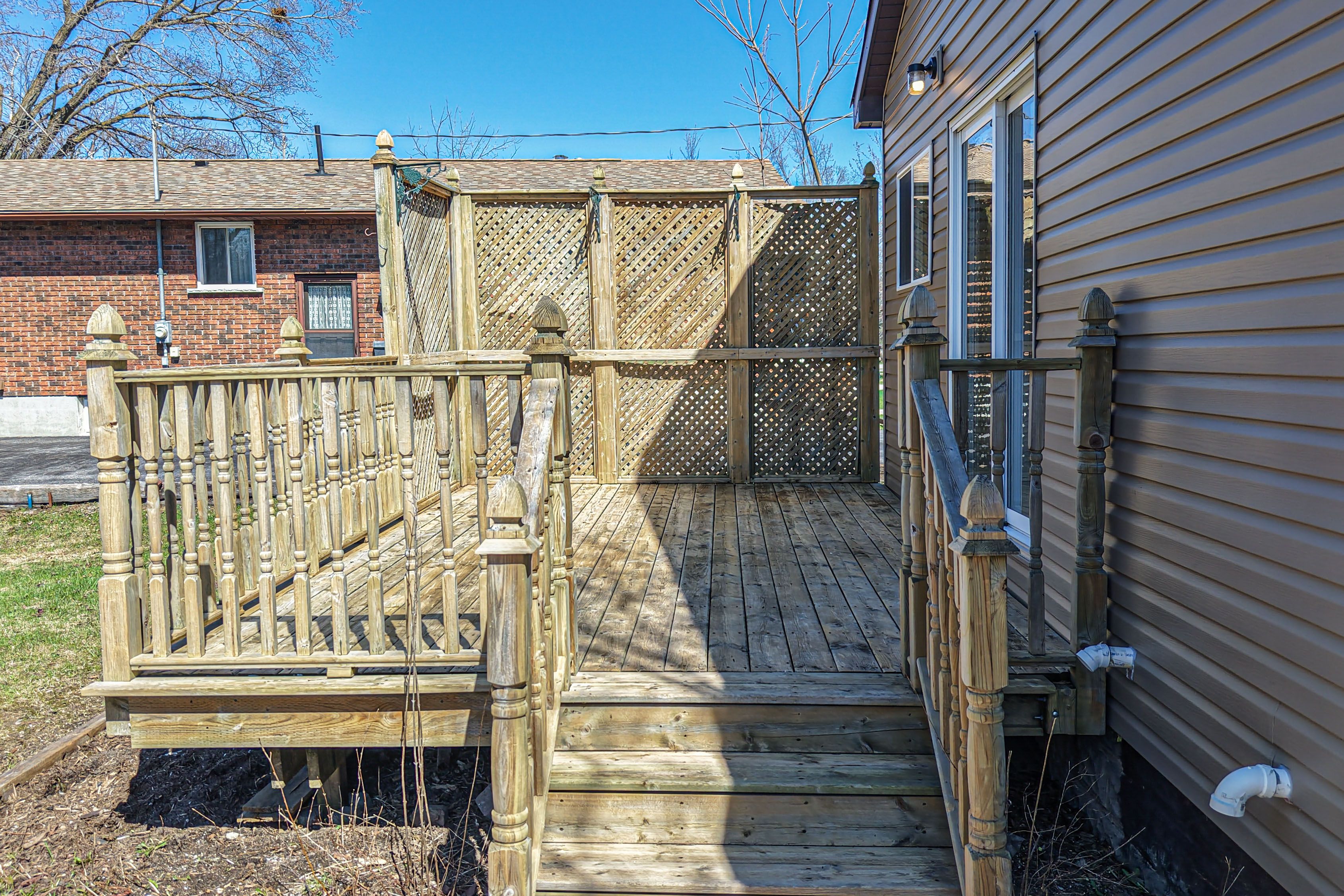 • Expansive fenced backyard with a large deck and custom stone patio.