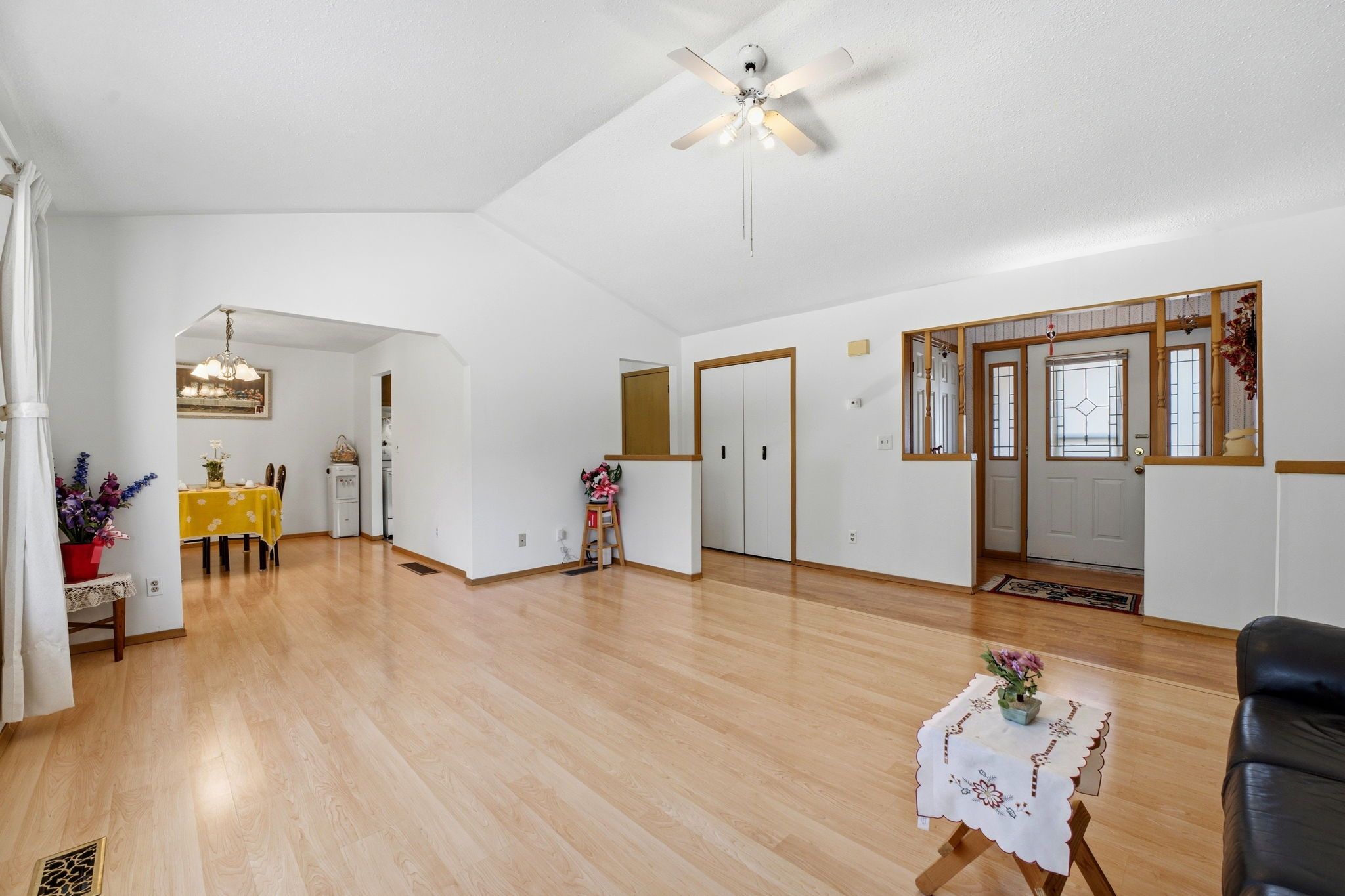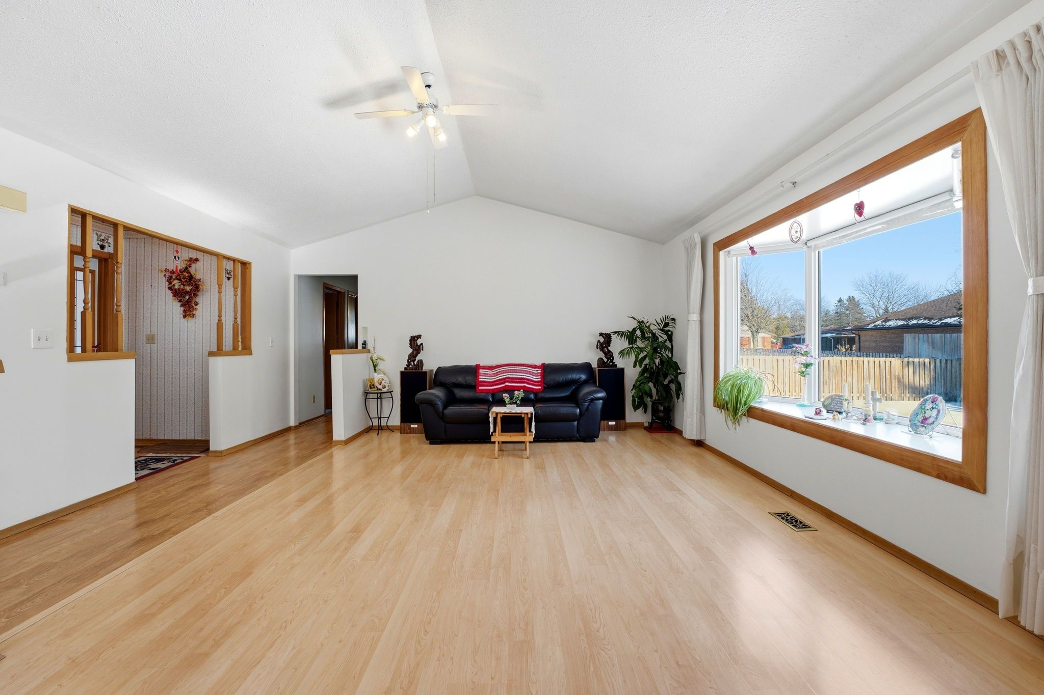 • Spacious open-concept living room with a cathedral ceiling for a bright atmosphere.