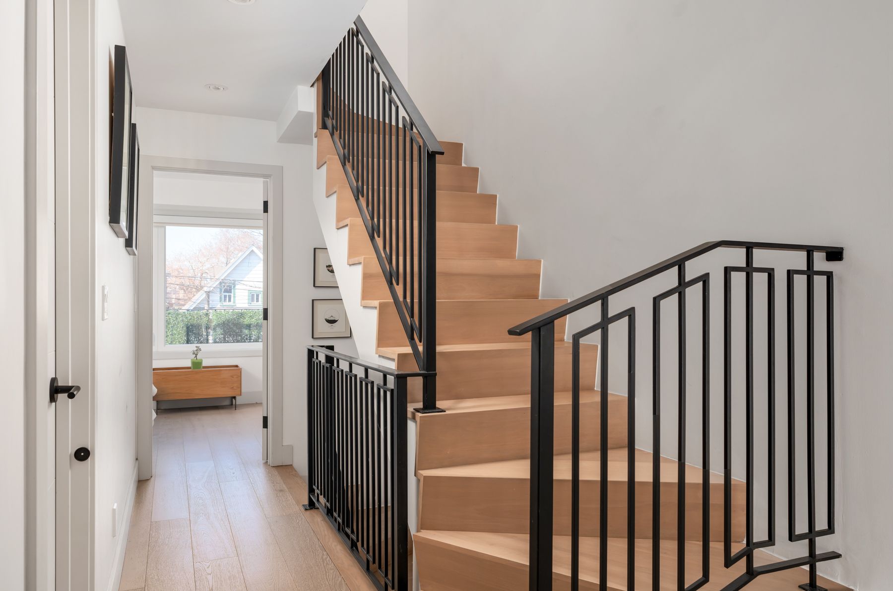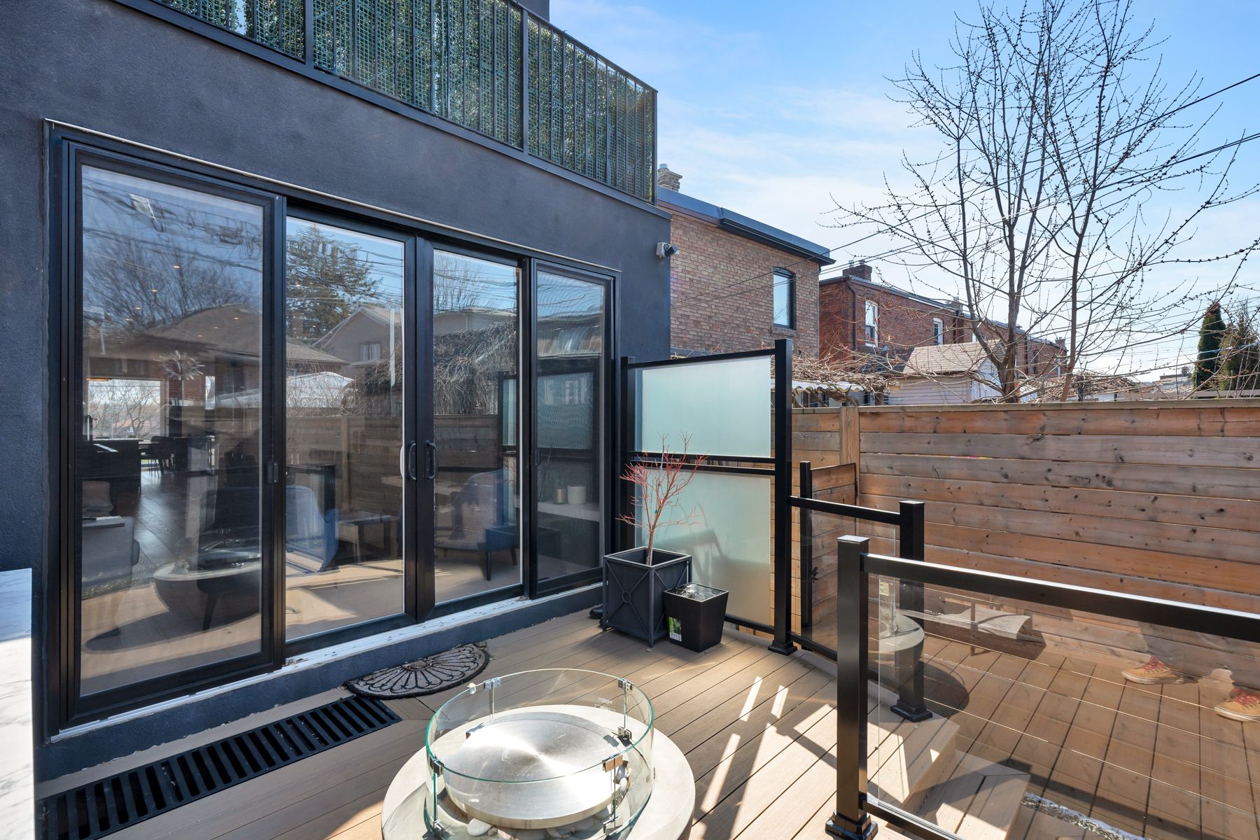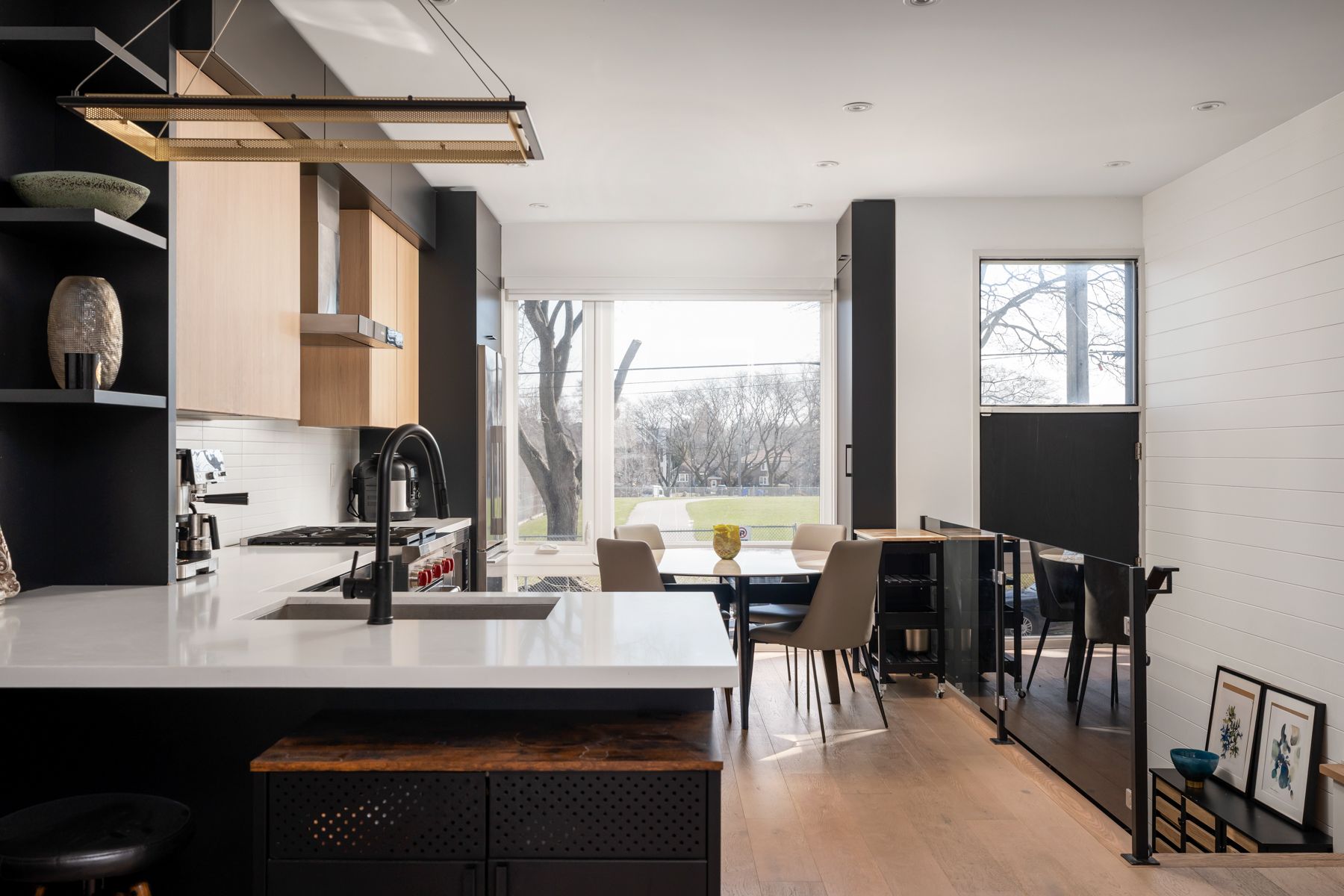 38 alameda avenue delivers clean design, a smart layout, and the kind of space you actually want to live in-just steps from cedarvale park. Featuring high-end finishes and modern functionality, this home offers exceptional living space for families and professionals alike. The main floor welcomes you with a stylish foyer featuring tile flooring, shiplap accents, and a convenient front closet. A few steps up-above the rare built-in garage-you'll find the stunning kitchen, showcasing a sophisticated blend of white oak and black cabinetry, complemented by quartz countertops, a porcelain backsplash, and premium appliances, including a wolf 30-inch range. A large window overlooking the front yard fills the space with natural light. The dining area features wide-plank white oak hardwood flooring, carried throughout the home, along with access to a chic powder room with marble tile finishes. A striking wrought iron staircase adds architectural character, while the living room is warm and inviting, highlighted by a modern herringbone accent wall and a sleek, eco-friendly ethanol fireplace-creating a sophisticated focal point with the beauty of real flame, without the smoke. French sliding doors lead to the backyard, offering seamless indoor-outdoor living. The third-floor primary retreat is a luxurious sanctuary, complete with custom built-ins, a private balcony overlooking the park, and a walk-in closet with integrated drawers. The spa-inspired 5-piece ensuite features double sinks with moen faucets, a soaker tub, bubble tile flooring, and a walk-in rain shower with herringbone tile detailing. The second level offers well-appointed bedrooms. One features a south-facing exposure, a built-in closet, and a private walkout balcony. Another is ideal as a home office, with hardwood flooring and generous closet space. Additional bedrooms include hardwood floors, built-ins, and beautiful park views.