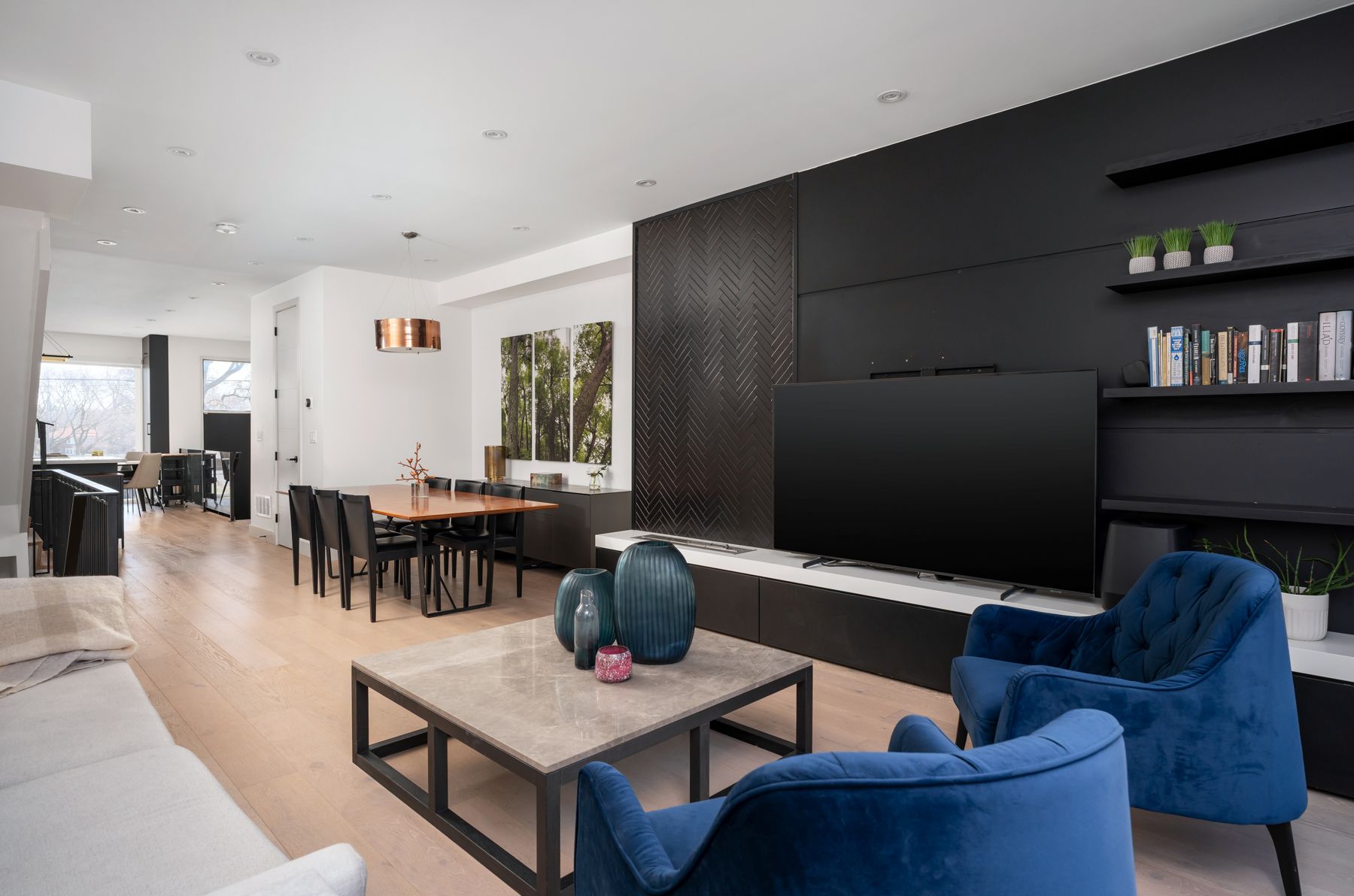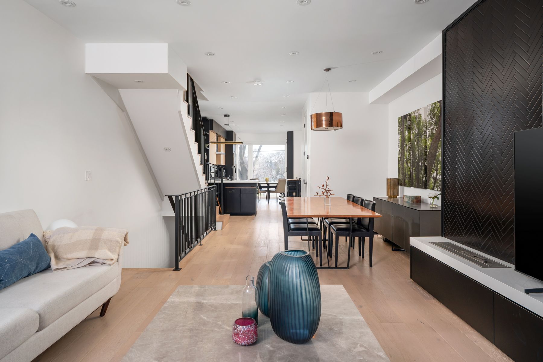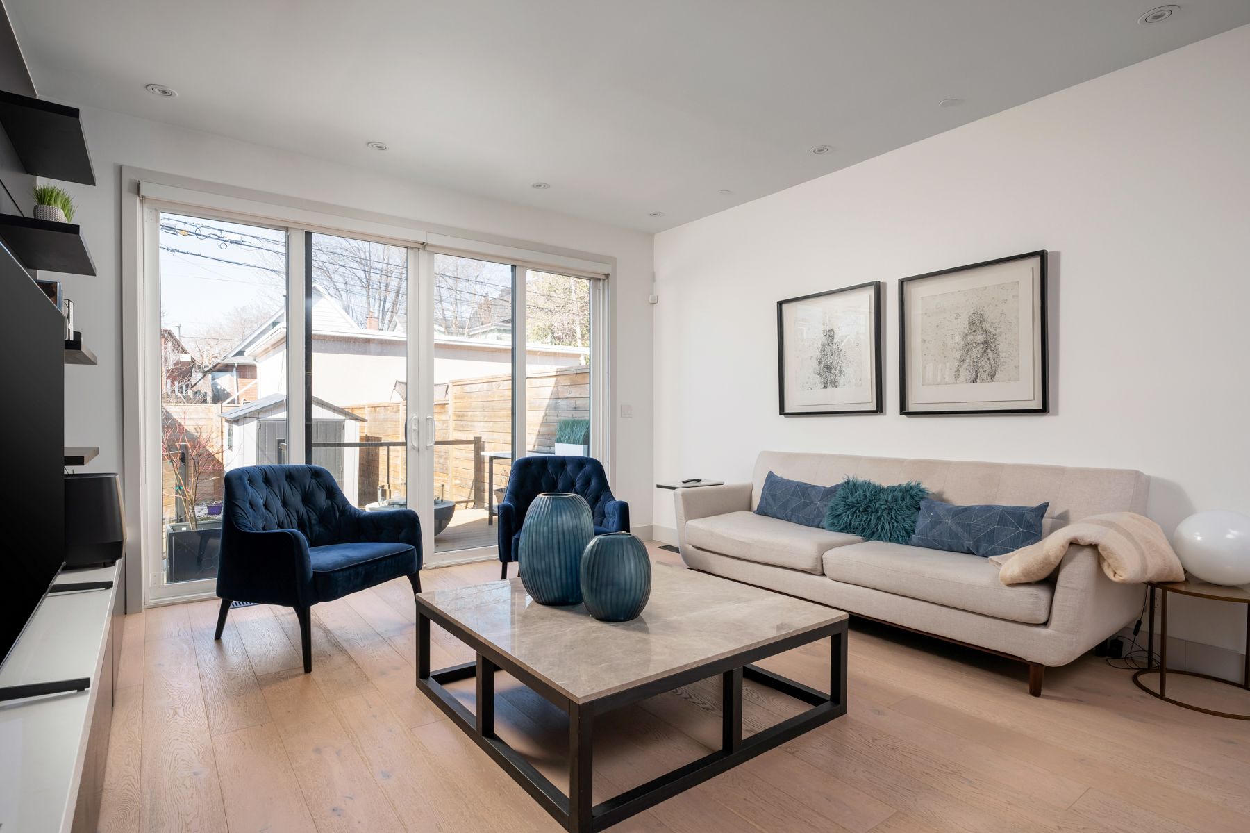 38 alameda avenue delivers clean design, a smart layout, and the kind of space you actually want to live in-just steps from cedarvale park. Featuring high-end finishes and modern functionality, this home offers exceptional living space for families and professionals alike. The main floor welcomes you with a stylish foyer featuring tile flooring, shiplap accents, and a convenient front closet. A few steps up-above the rare built-in garage-you'll find the stunning kitchen, showcasing a sophisticated blend of white oak and black cabinetry, complemented by quartz countertops, a porcelain backsplash, and premium appliances, including a wolf 30-inch range. A large window overlooking the front yard fills the space with natural light. The dining area features wide-plank white oak hardwood flooring, carried throughout the home, along with access to a chic powder room with marble tile finishes. A striking wrought iron staircase adds architectural character, while the living room is warm and inviting, highlighted by a modern herringbone accent wall and a sleek, eco-friendly ethanol fireplace-creating a sophisticated focal point with the beauty of real flame, without the smoke. French sliding doors lead to the backyard, offering seamless indoor-outdoor living. The third-floor primary retreat is a luxurious sanctuary, complete with custom built-ins, a private balcony overlooking the park, and a walk-in closet with integrated drawers. The spa-inspired 5-piece ensuite features double sinks with moen faucets, a soaker tub, bubble tile flooring, and a walk-in rain shower with herringbone tile detailing. The second level offers well-appointed bedrooms. One features a south-facing exposure, a built-in closet, and a private walkout balcony. Another is ideal as a home office, with hardwood flooring and generous closet space. Additional bedrooms include hardwood floors, built-ins, and beautiful park views.