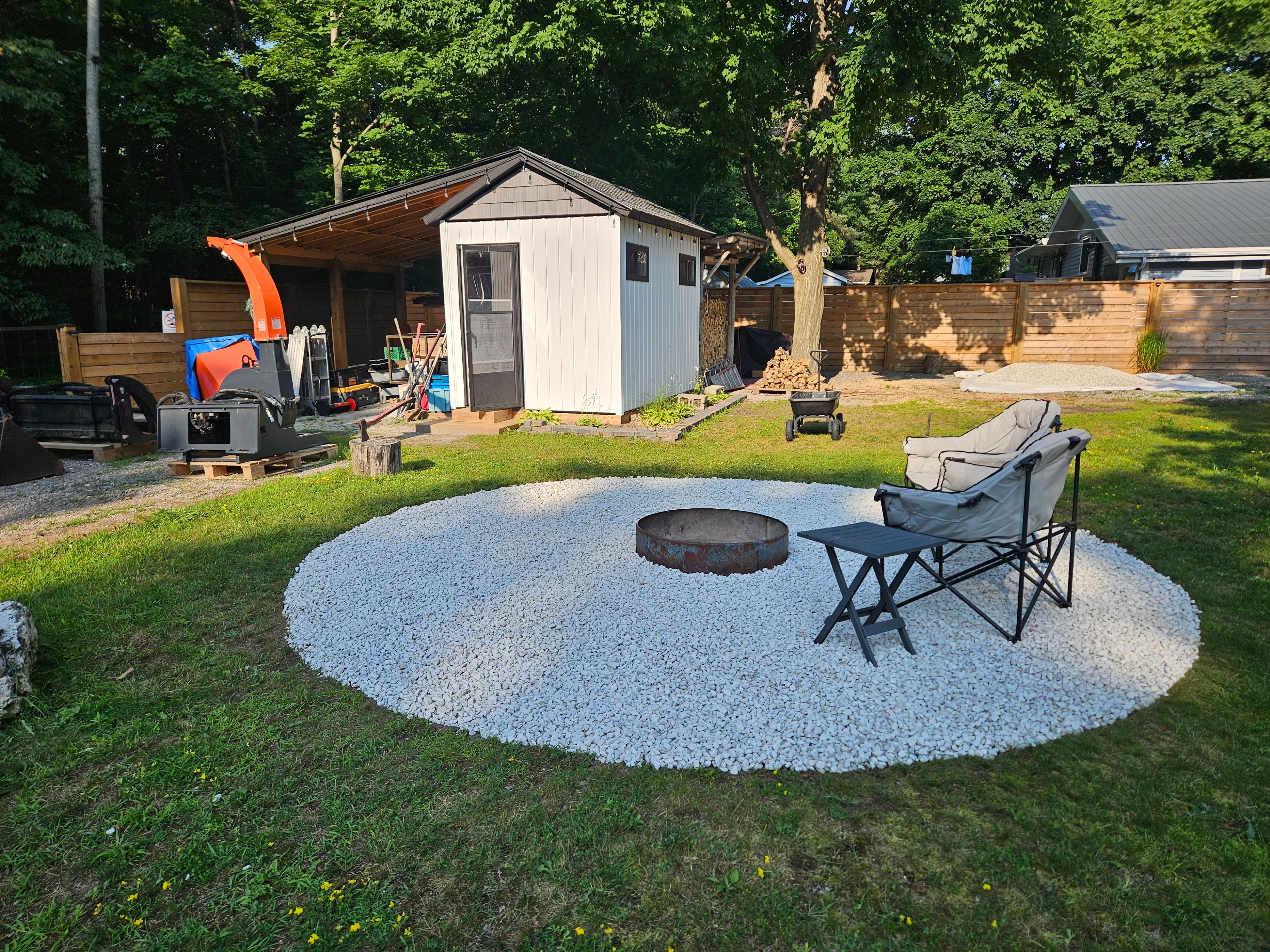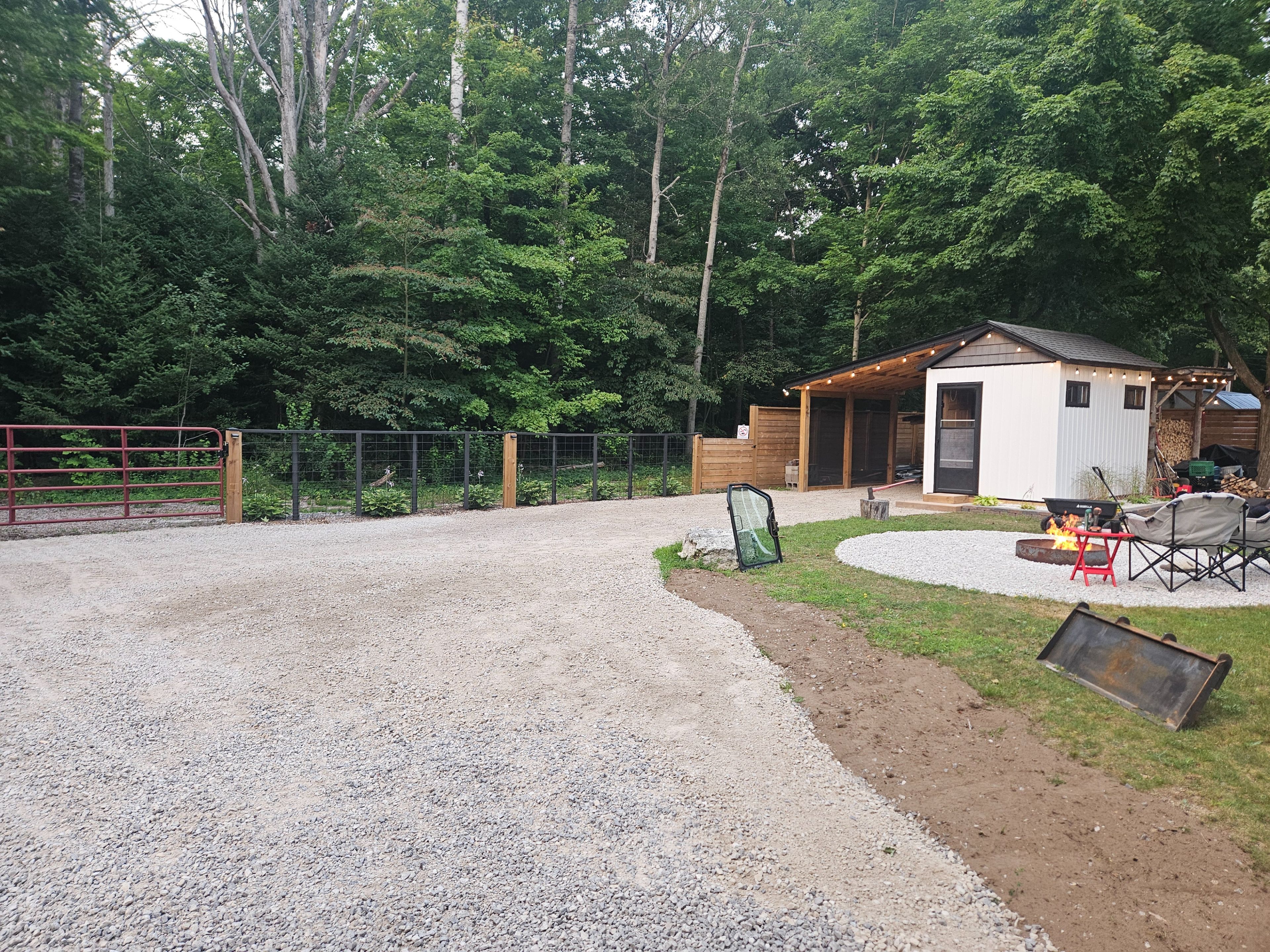 • Large fenced yard with a covered hot tub and fire pit.