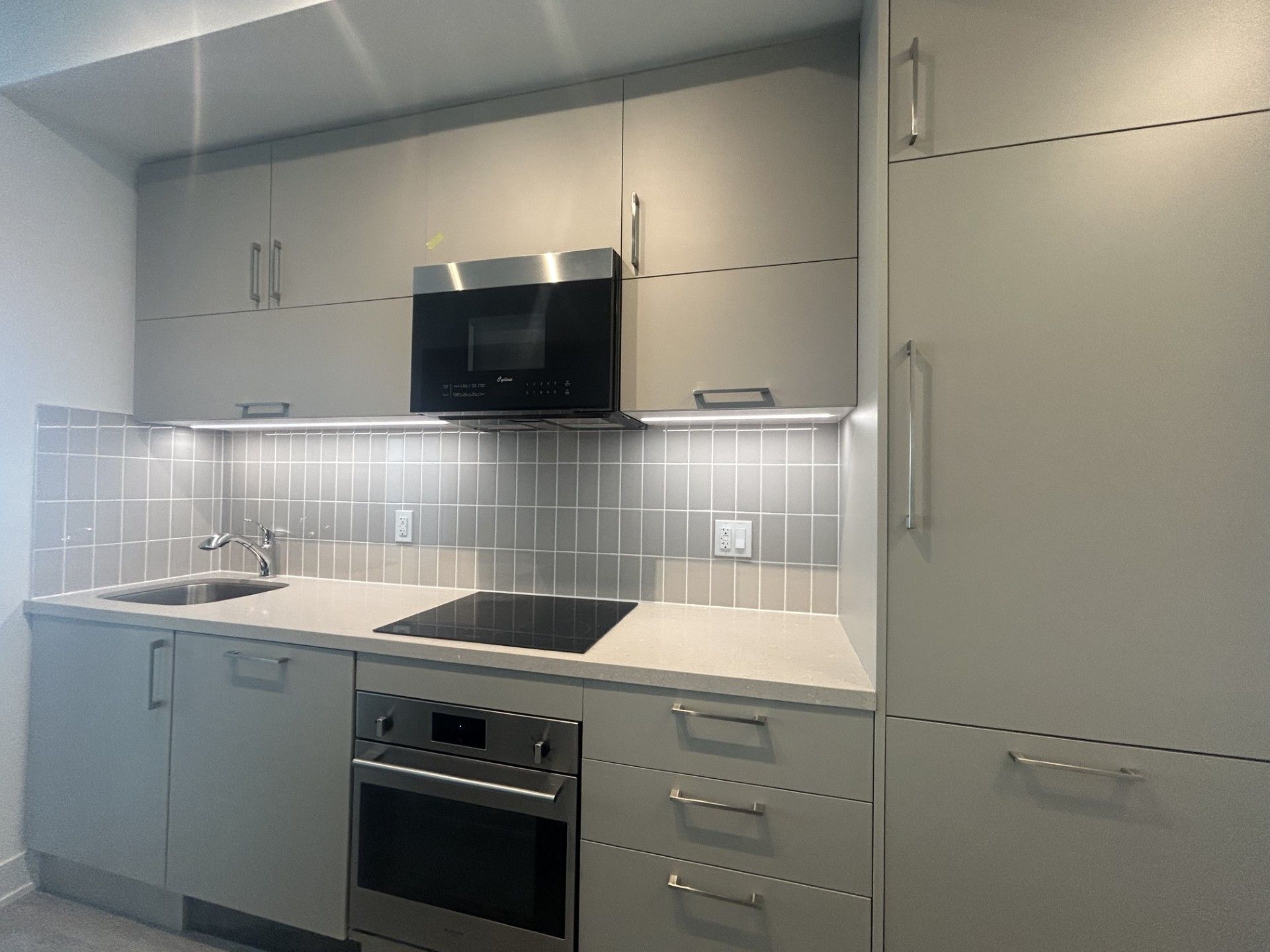 • Bright modern kitchen featuring quartz counters and built-in appliances.