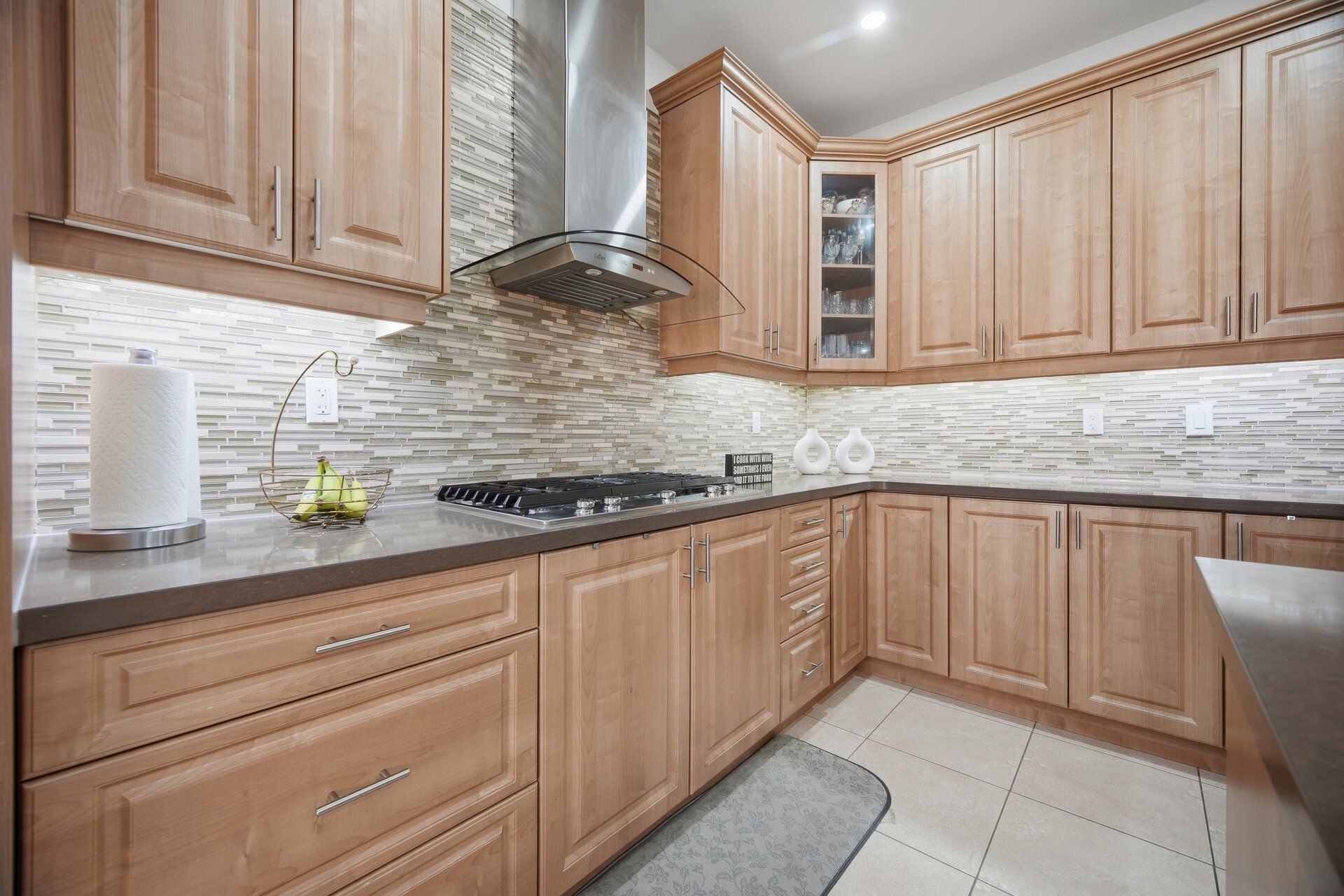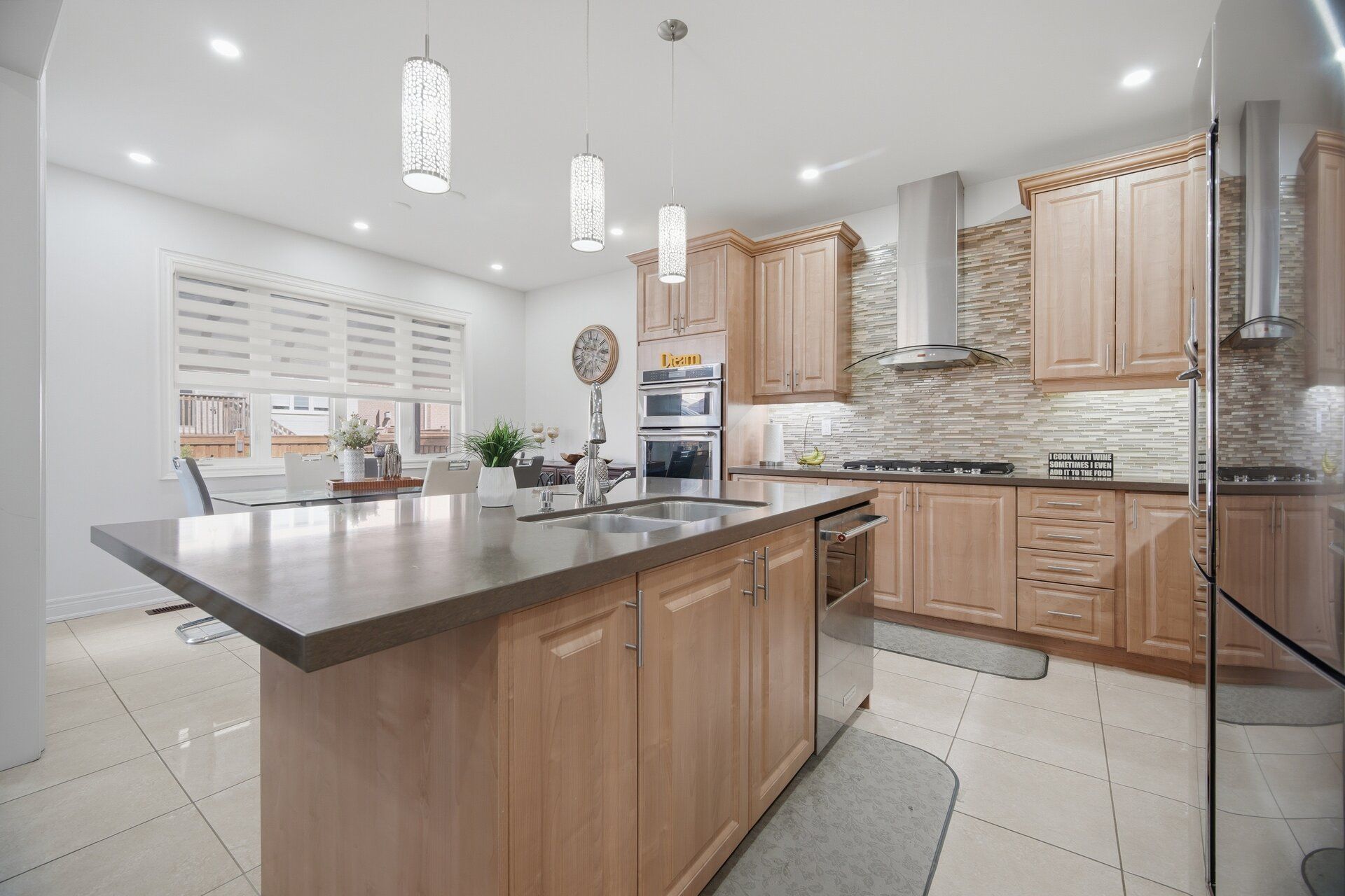 • Family-sized kitchen featuring quartz countertops and built-in appliances.