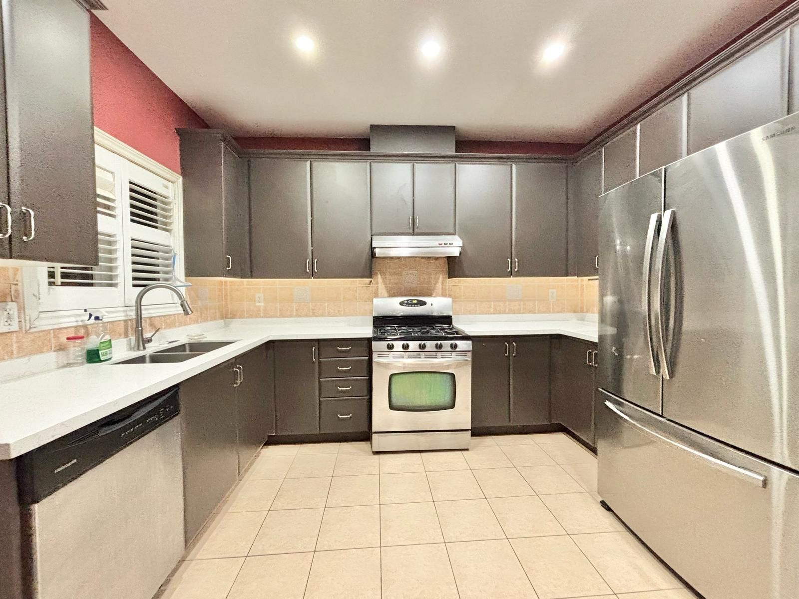 • Modern kitchen featuring stainless steel appliances and ample space.