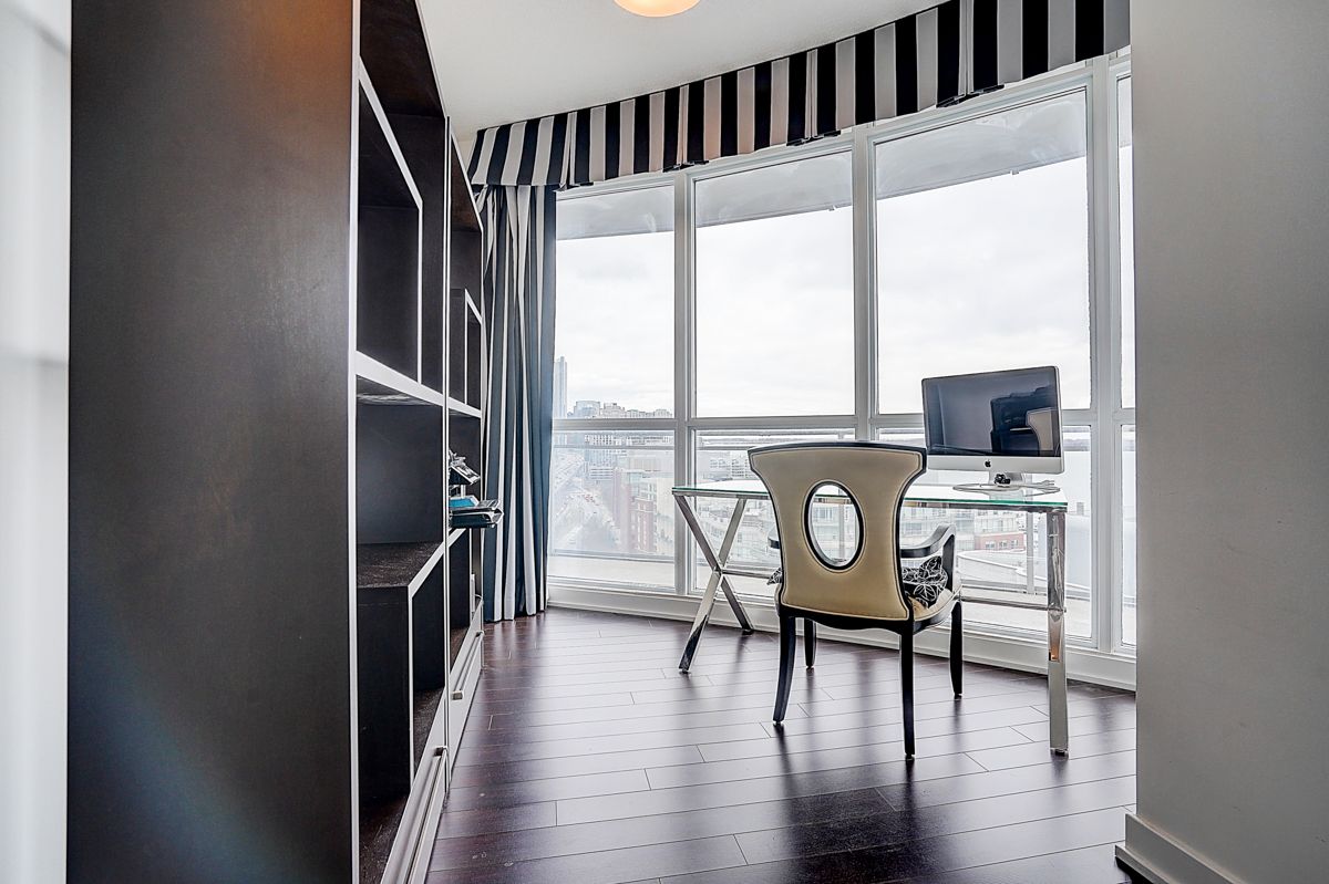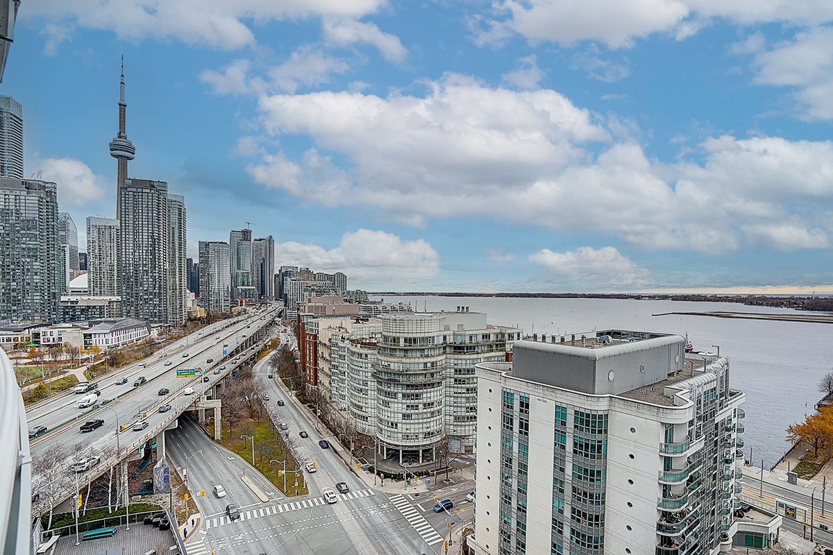 Very bright & unique 2+den, 2 bathroom corner suite offers unobstructed lake and city skyline views from every room, with a stunning wrap-around that perfect for morning coffees or evening sunsets. Bright and inviting with floor-to-ceiling windows, featuring a modern open-concept layout, two full bathrooms, and a versatile den that works perfectly as a home office or guest room. Along with million-dollar views, the building also offers great amenities, and with the waterfront, parks, transit, grocery stores, and downtown toronto's finest attractions right at your doorstep, this is truly a must-see condo that blends lifestyle, comfort, and convenience.