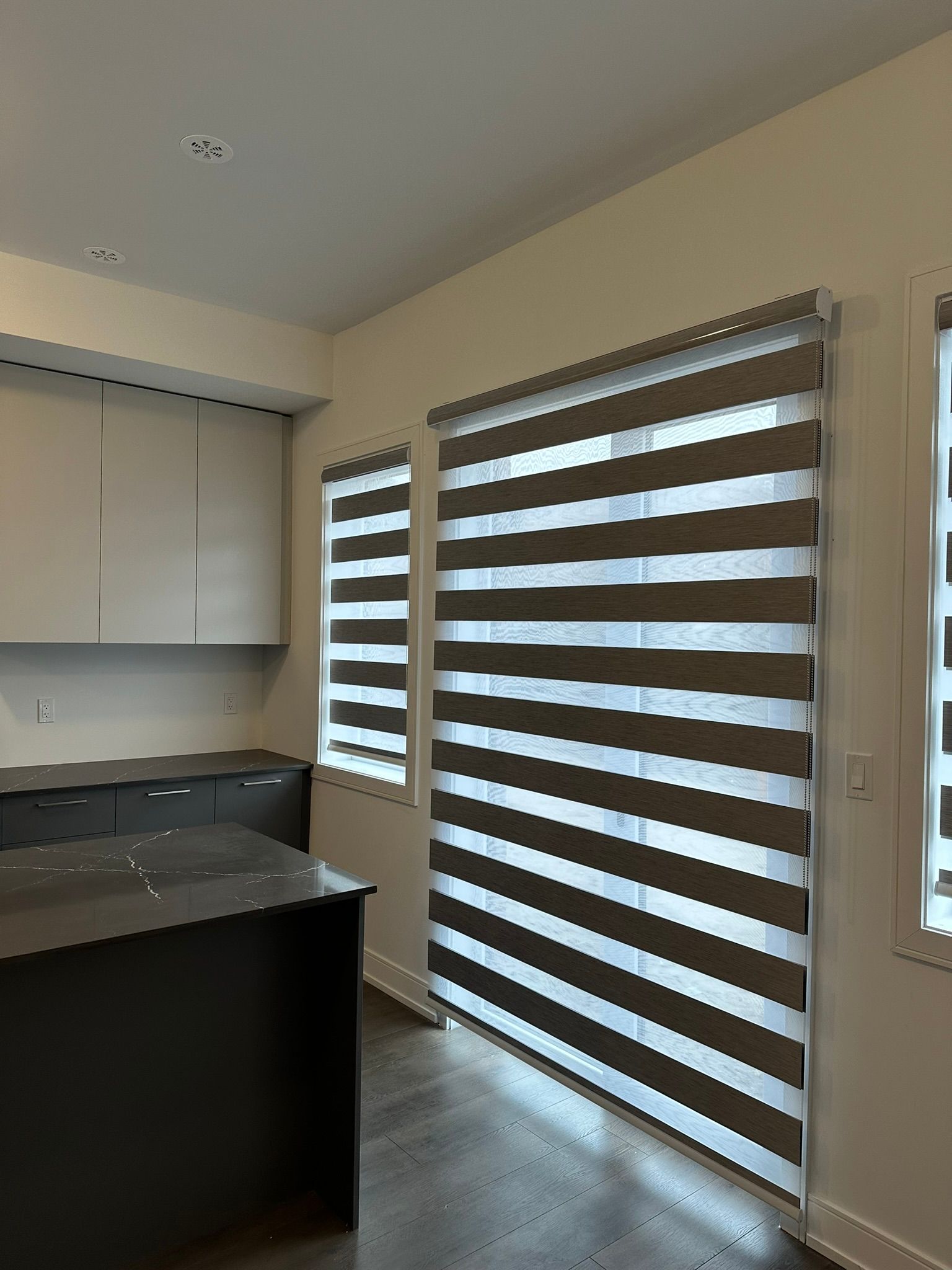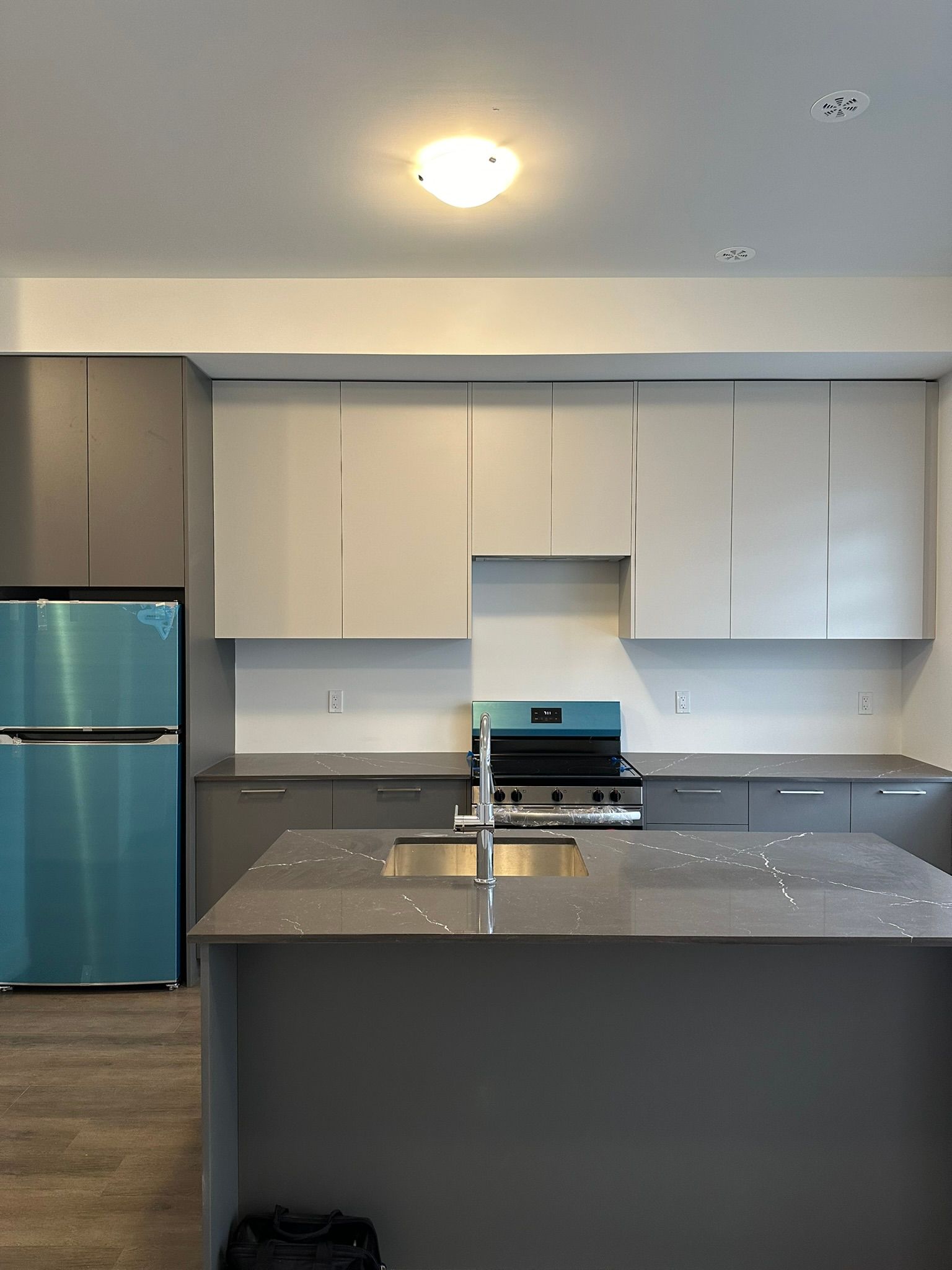 • Open kitchen features quartz countertops and stainless steel appliances.