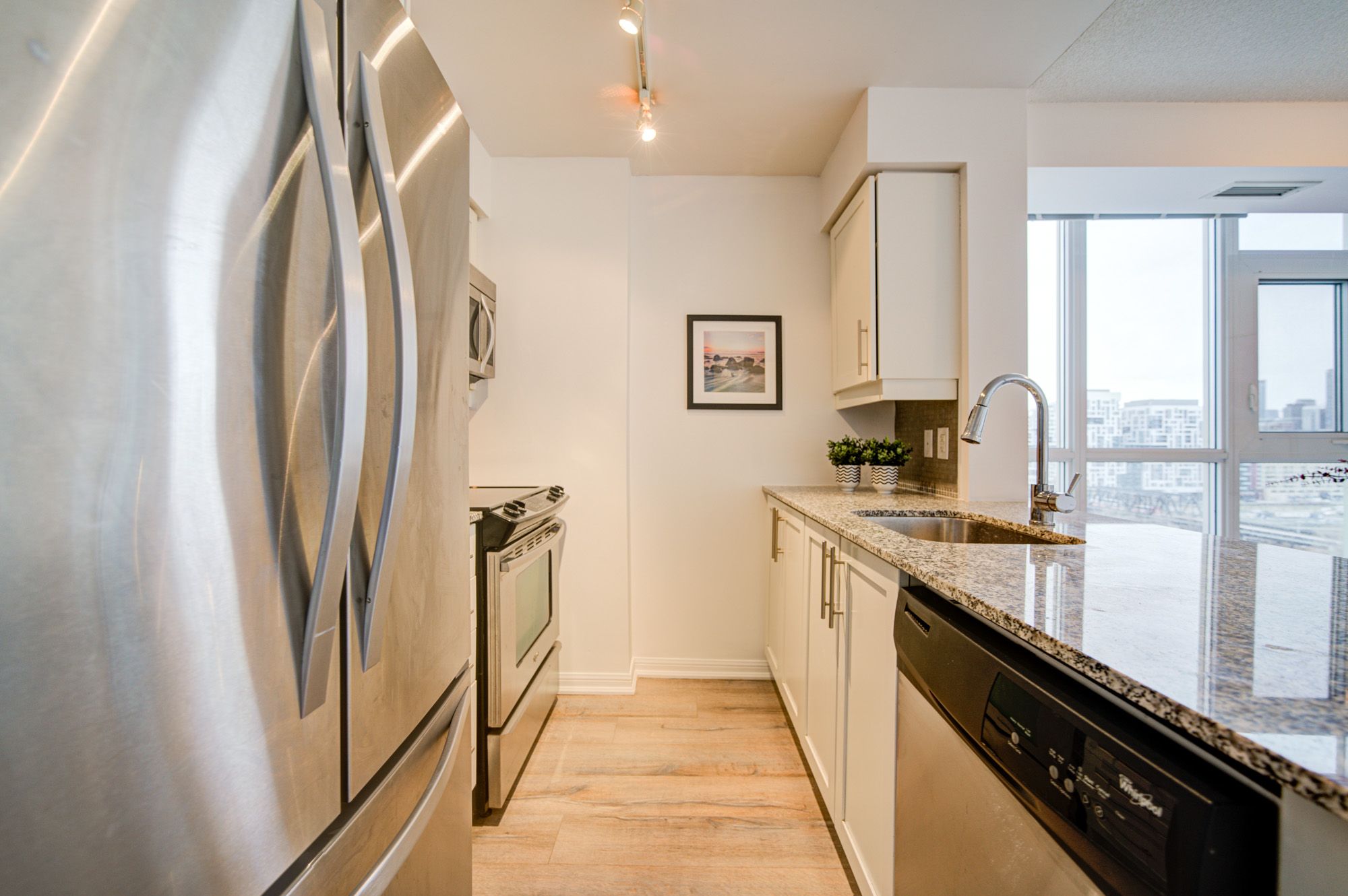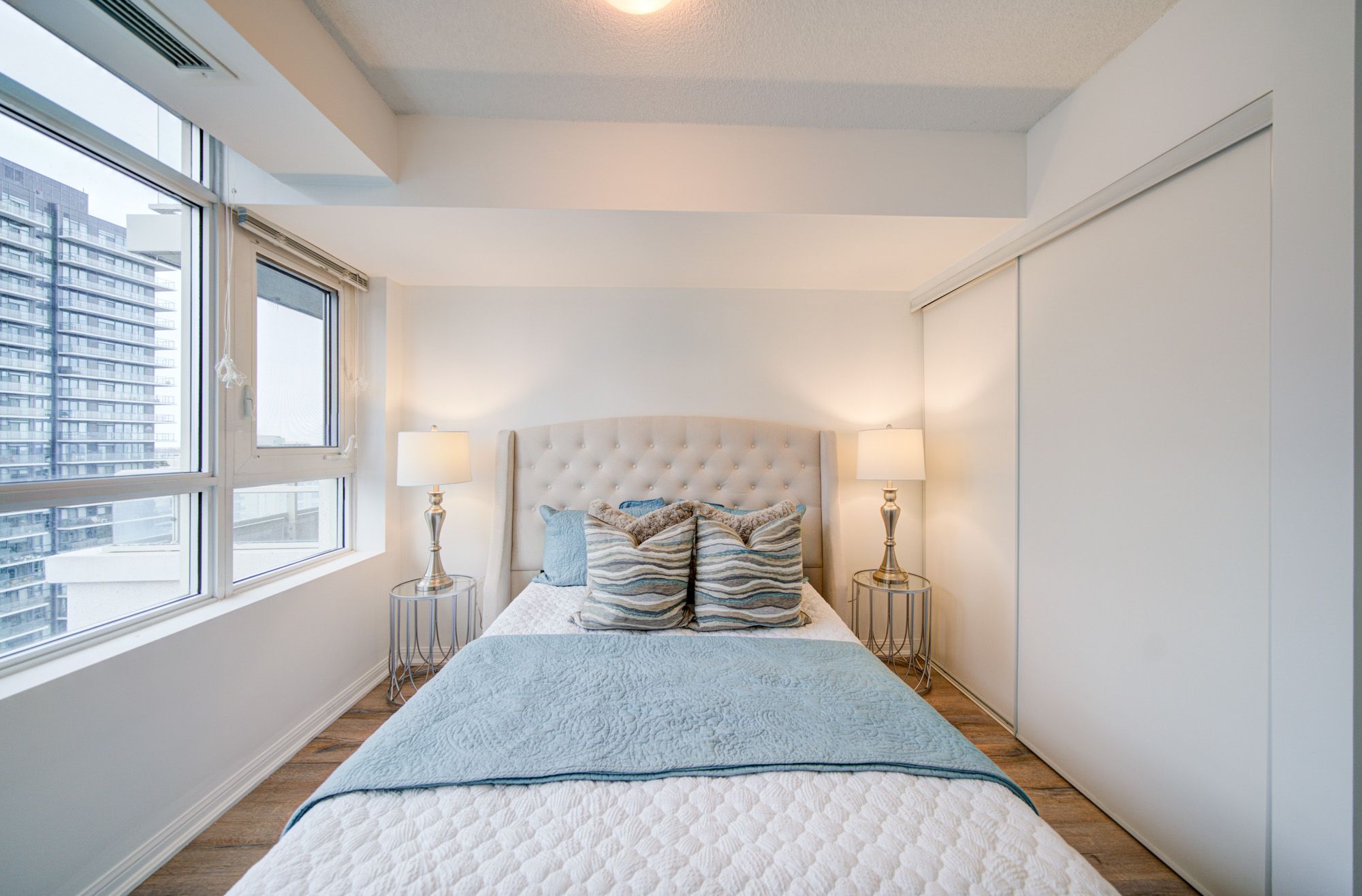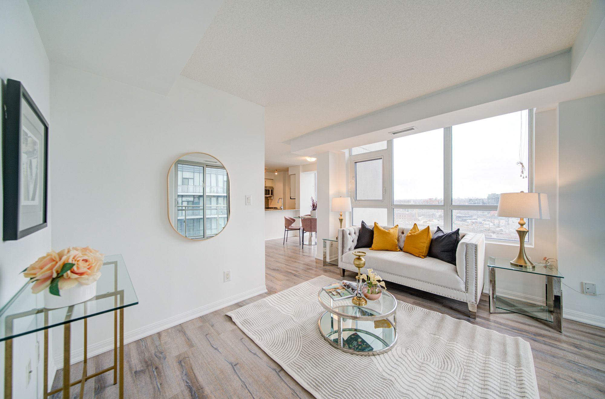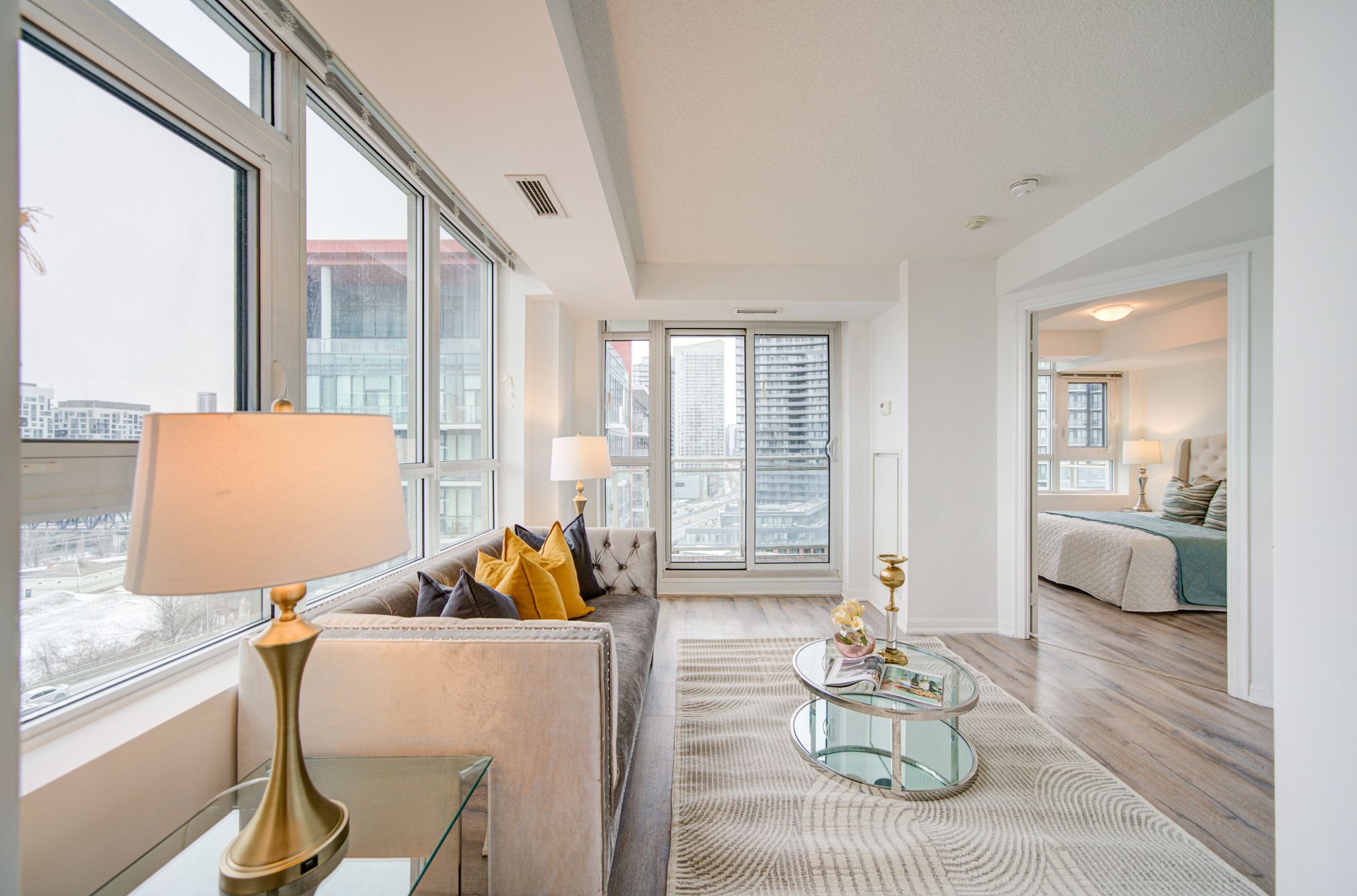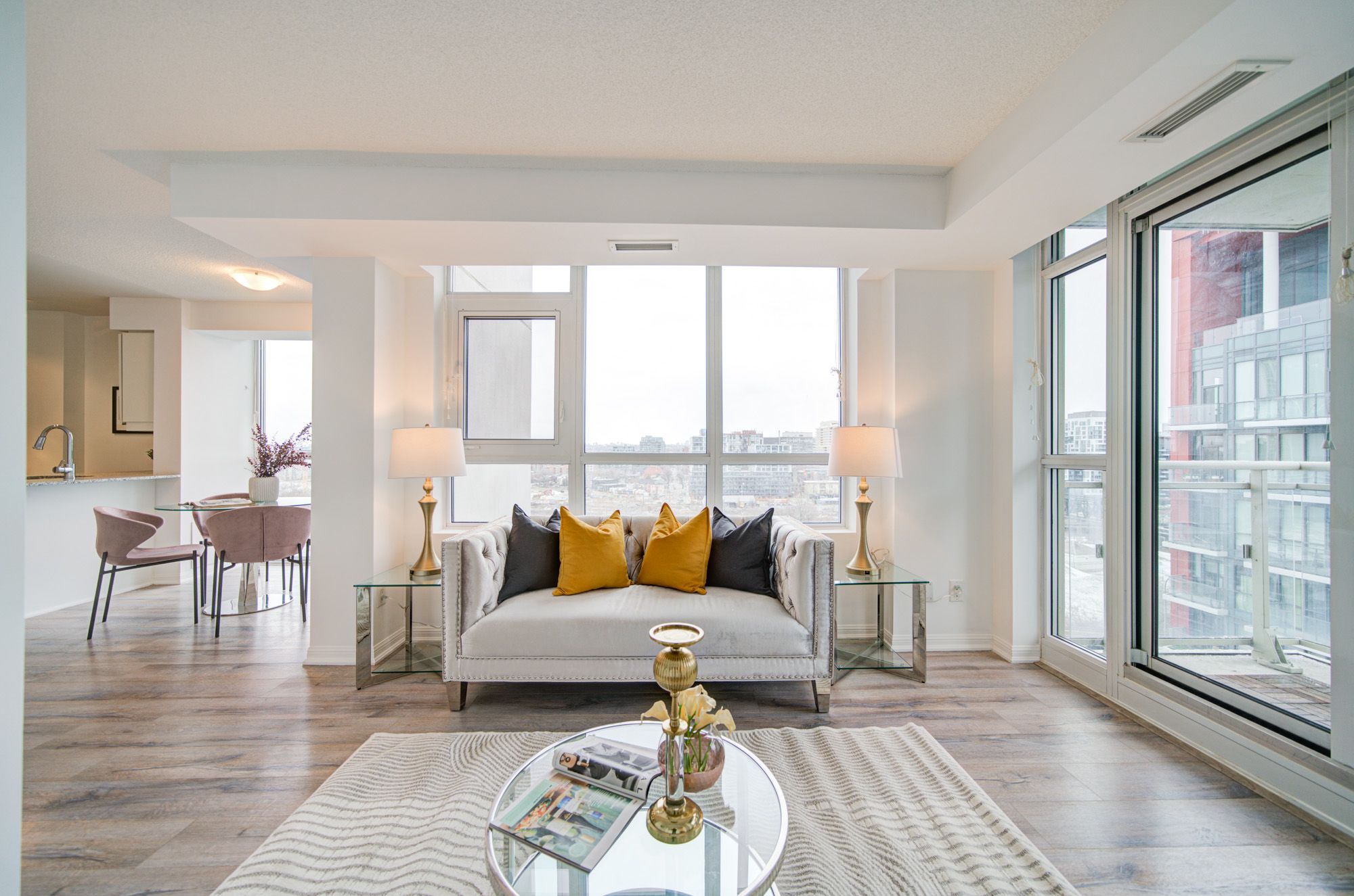 • Bright corner condo with floor-to-ceiling windows and city views.