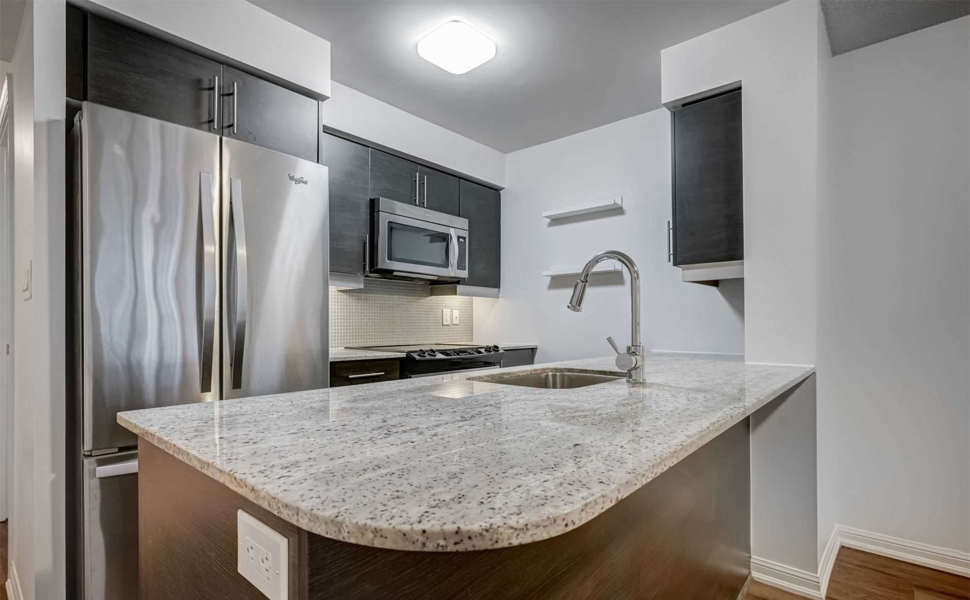 • Modern kitchen features granite countertops and stainless steel appliances.