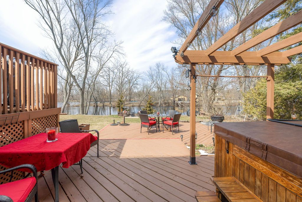 • Mature landscaping with a multi-tiered deck and hot tub.