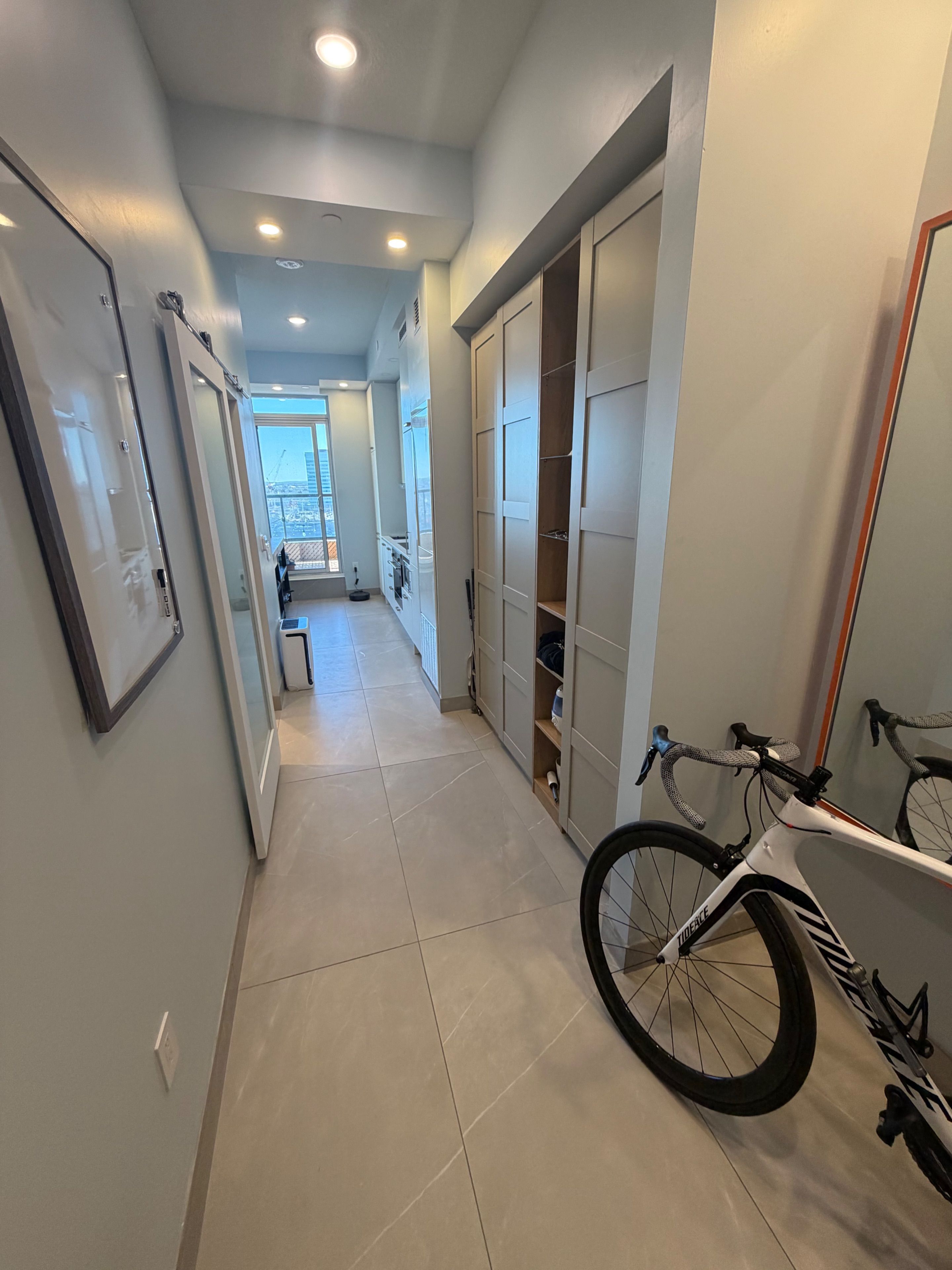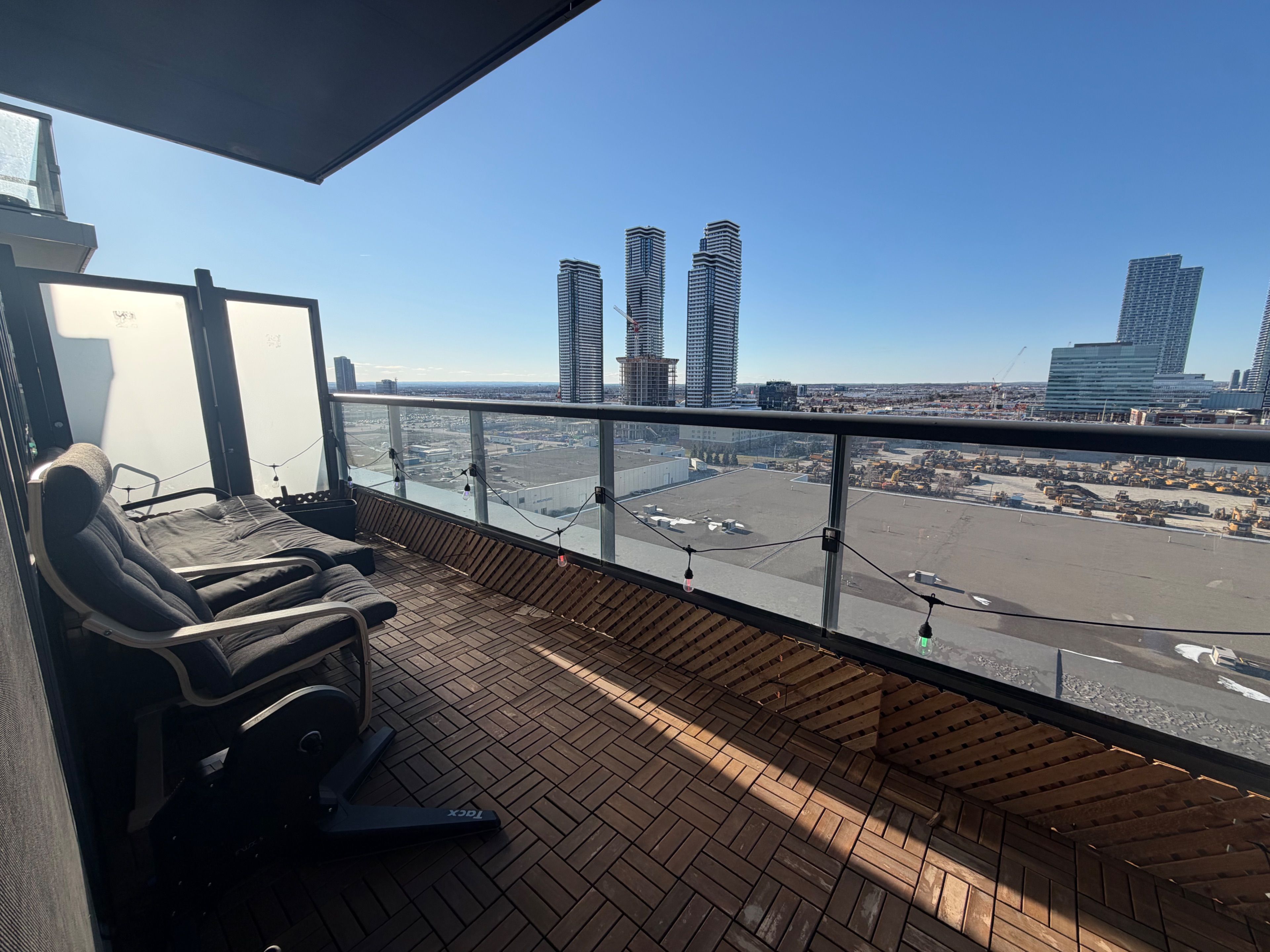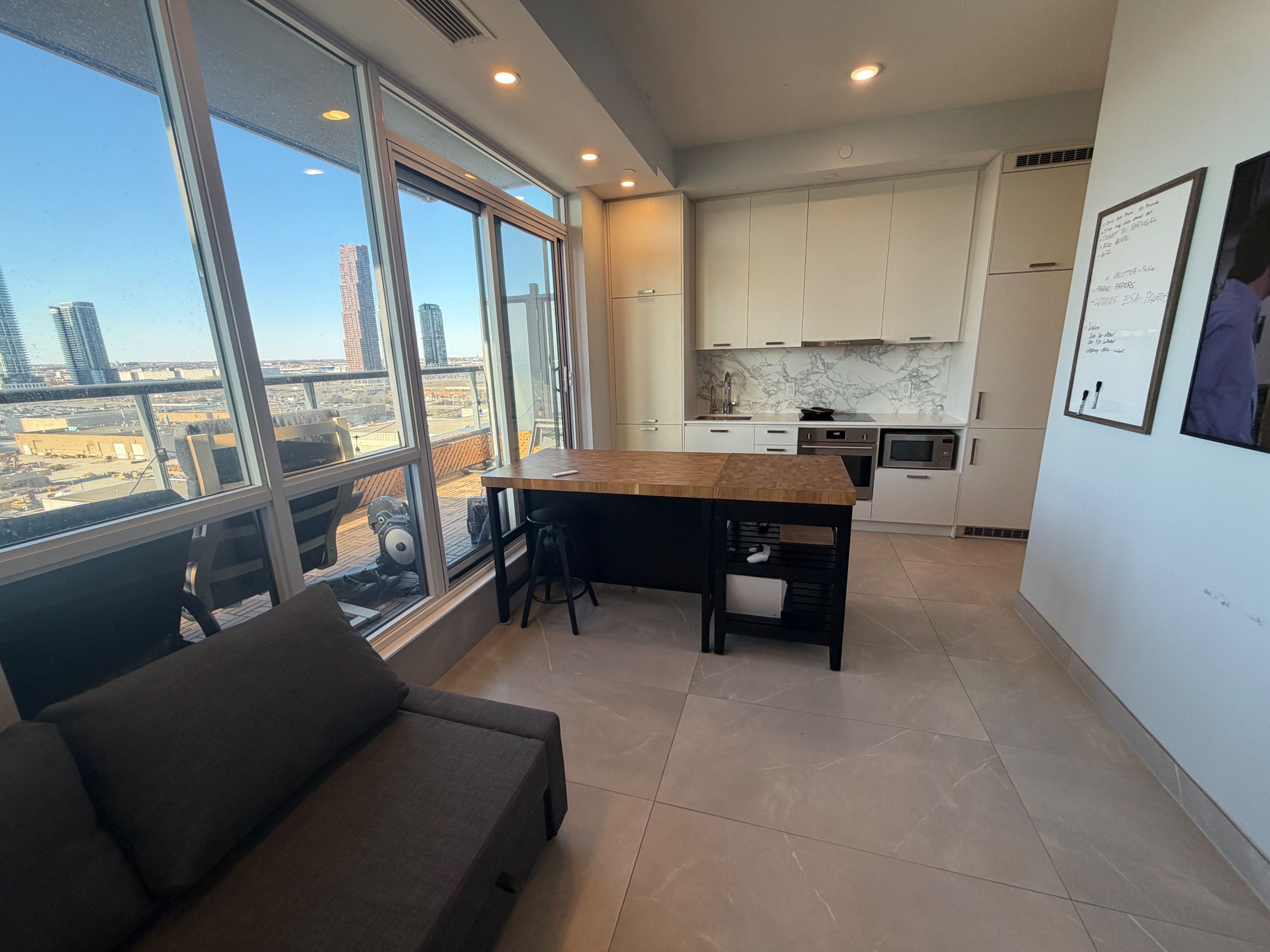 One of a kind renovated 432sqft studio apartment in mobilio east tower by menkes. 2ftx4ft tile floor throughout, spa like bathroom with tongue & groove cedar ceiling, terrace with parquet tiles and patio lights, custom closet and projector mounted on the ceiling. Excellent location with access to vmc subway station, yrt, viva. Easy access to highway 400 and 407. Close to york university, walmart, ikea, restaurants and all amenities!