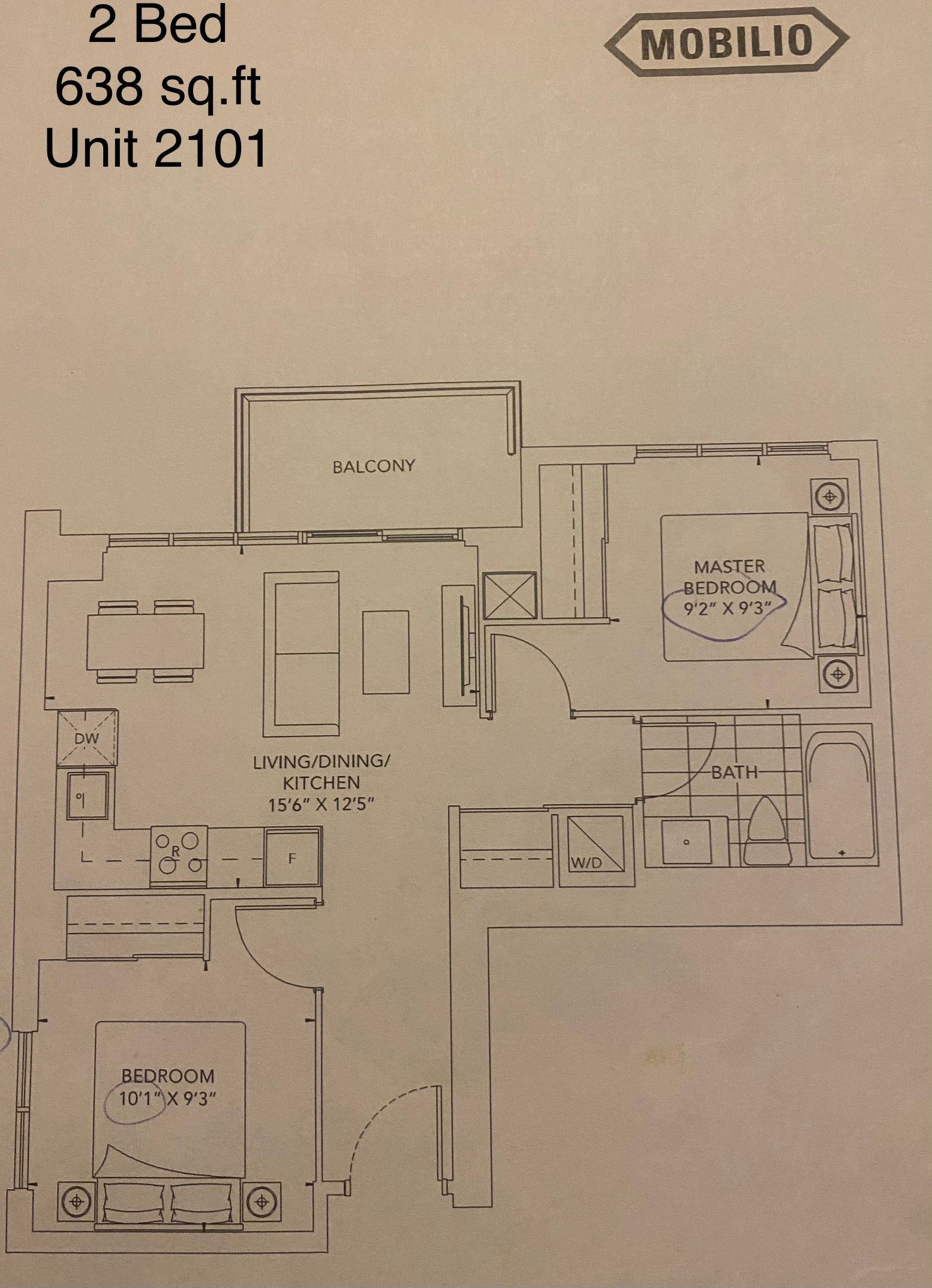 2 years new mobilio by menkes. 2 bedrooms unit on the top floor with 10 ft ceilings & clear view! P arking & locker included. Amenities to include state-of the-art gym with peleton bike/thread ,theatre, party room, lounge and meeting room, guest suites, and terrace with bbq.