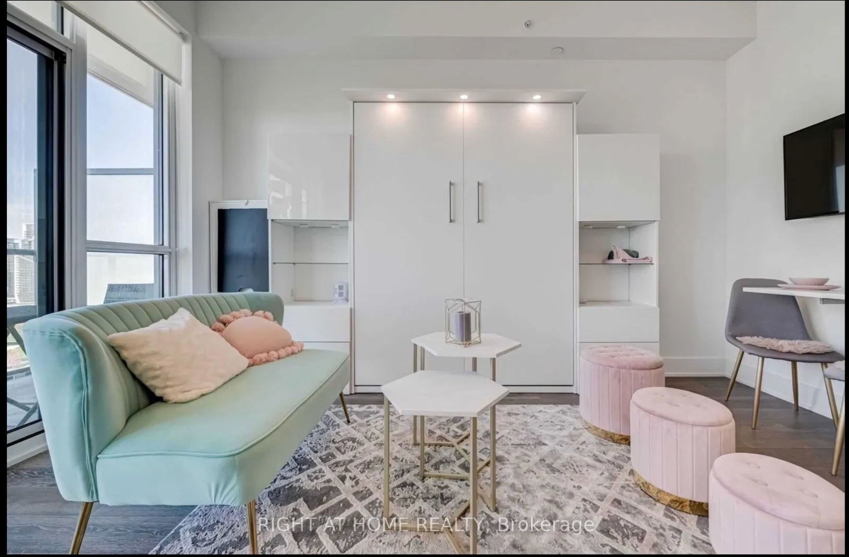 • Custom Murphy bed and ample storage for convenience.