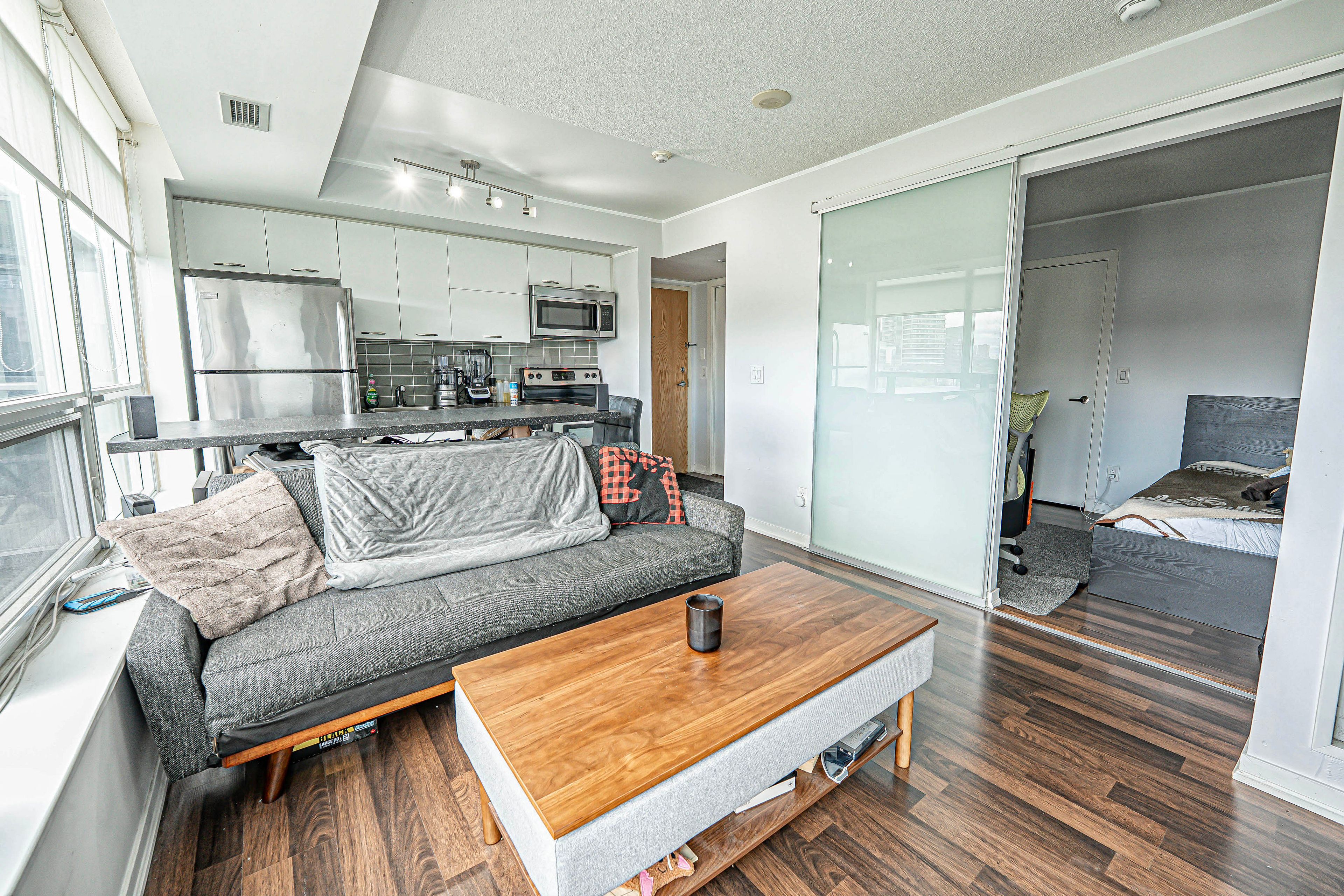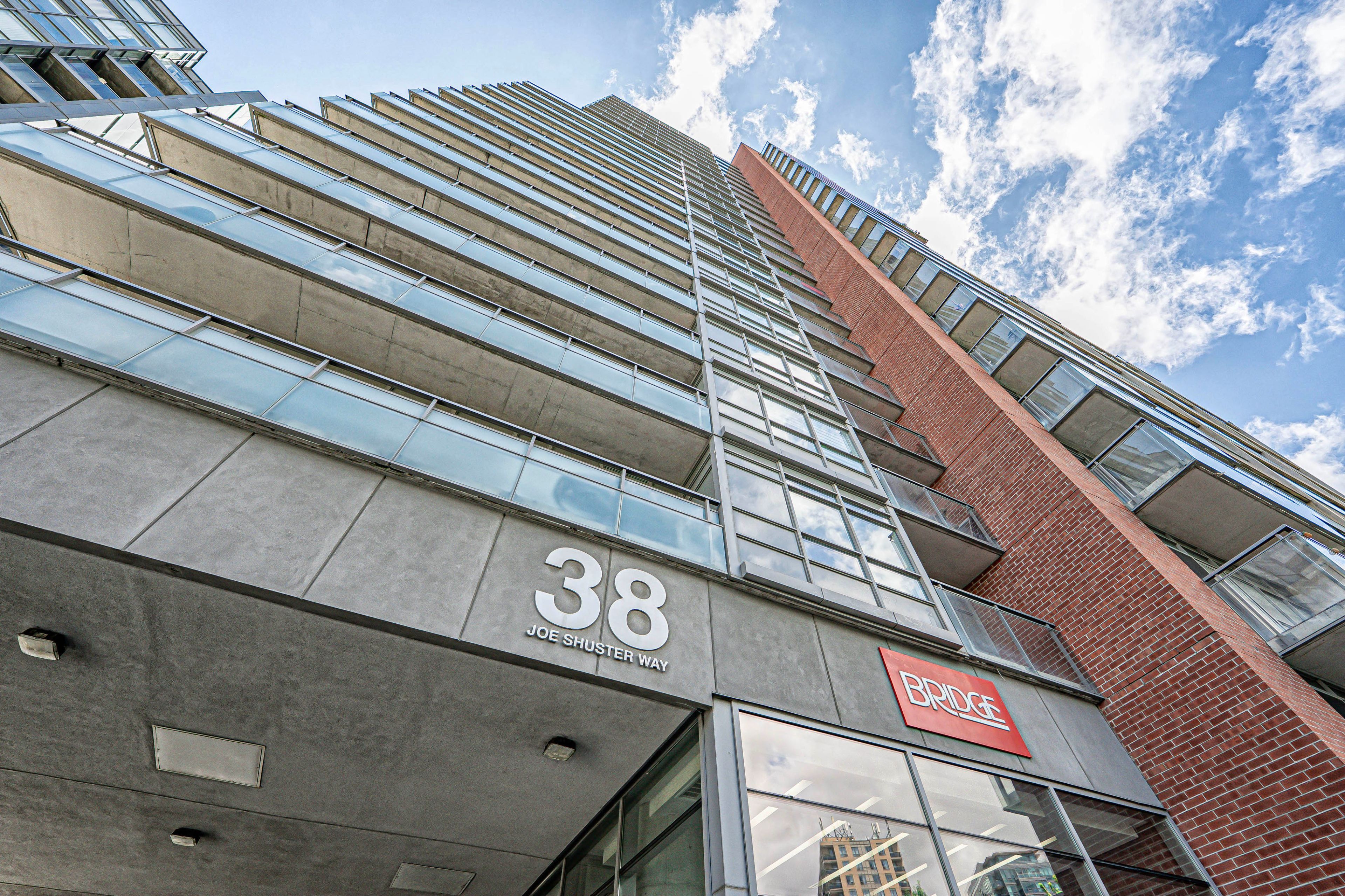 Excellent value in the city: perfect for first-time home buyers or investors! One bedroom condo located in the bridge condominiums development. Nestled on a timeless tree-lined street surrounded by luscious greenery in the south parkdale area; very close proximity to the vibrant liberty village & king west village. Suite features: exceptional layout w/no wasted space, 1 spacious bedroom, 1 bath (4-piece), functional kitchen w/centre island, backsplash, laminate floors, in-suite laundry, open balcony w/unobstructed & serene view of city (northwest), 1 storage locker, security guard onsite & more! Building amenities include: lobby area, mailbox room w/parcel dropoff, party/meeting room, indoor pool w/hot tub, sauna, gym, yoga room, games room, media room, visitor parking & street parking. This lovely condo is situated in an electrifying neighbourhood w/several amenities located within close proximity including: schools, parks (rita cox park 1min walk), bmo field, gardiner expressway, exhibition go station, public transit & more. Great building, superb unit layout & amazing balcony view make this condo a perfect choice for those seeking comfort, investment & value! *click virtual tour link for additional photos & video*