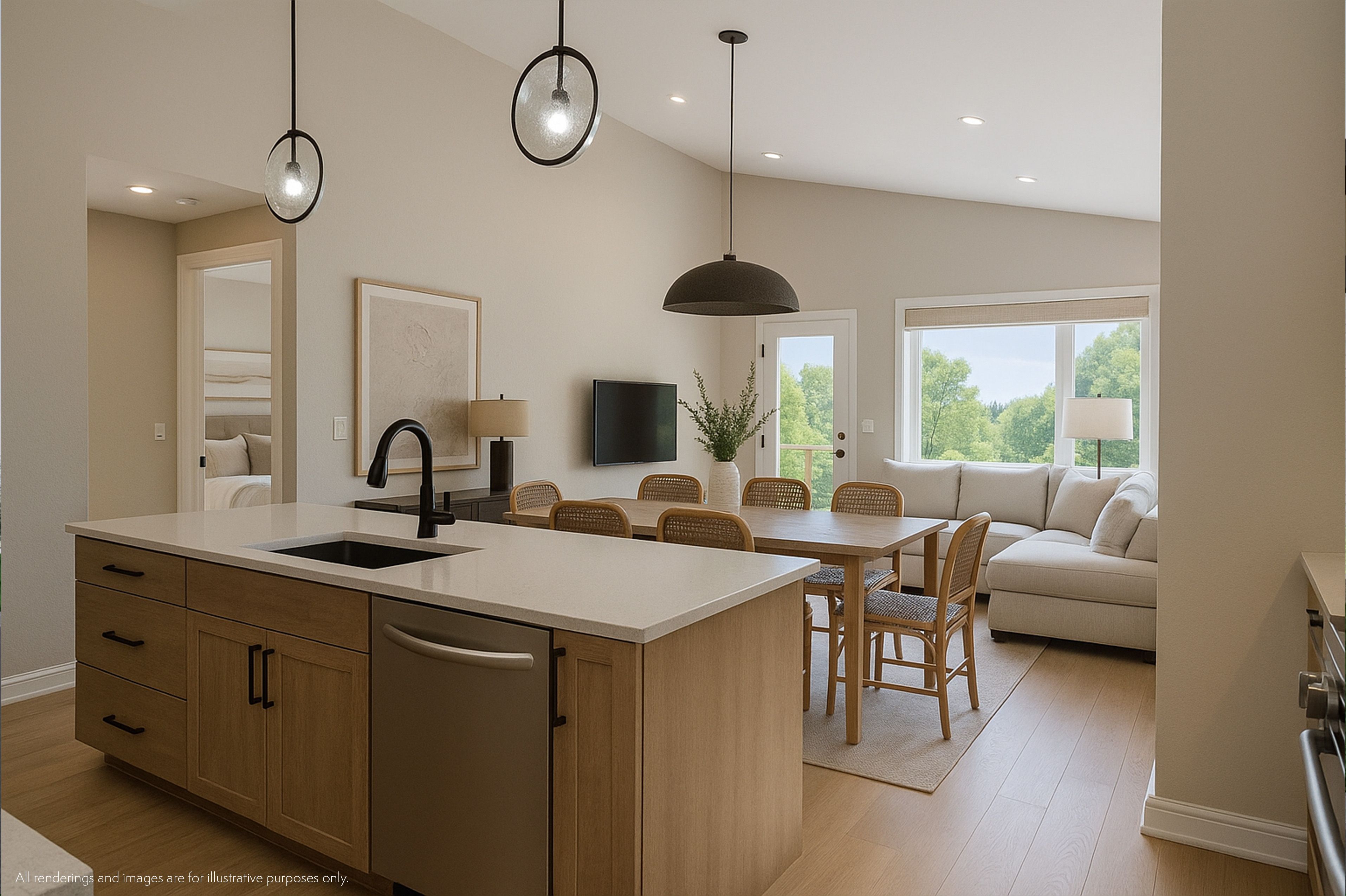 • Open-concept living area features vaulted ceilings and large windows.