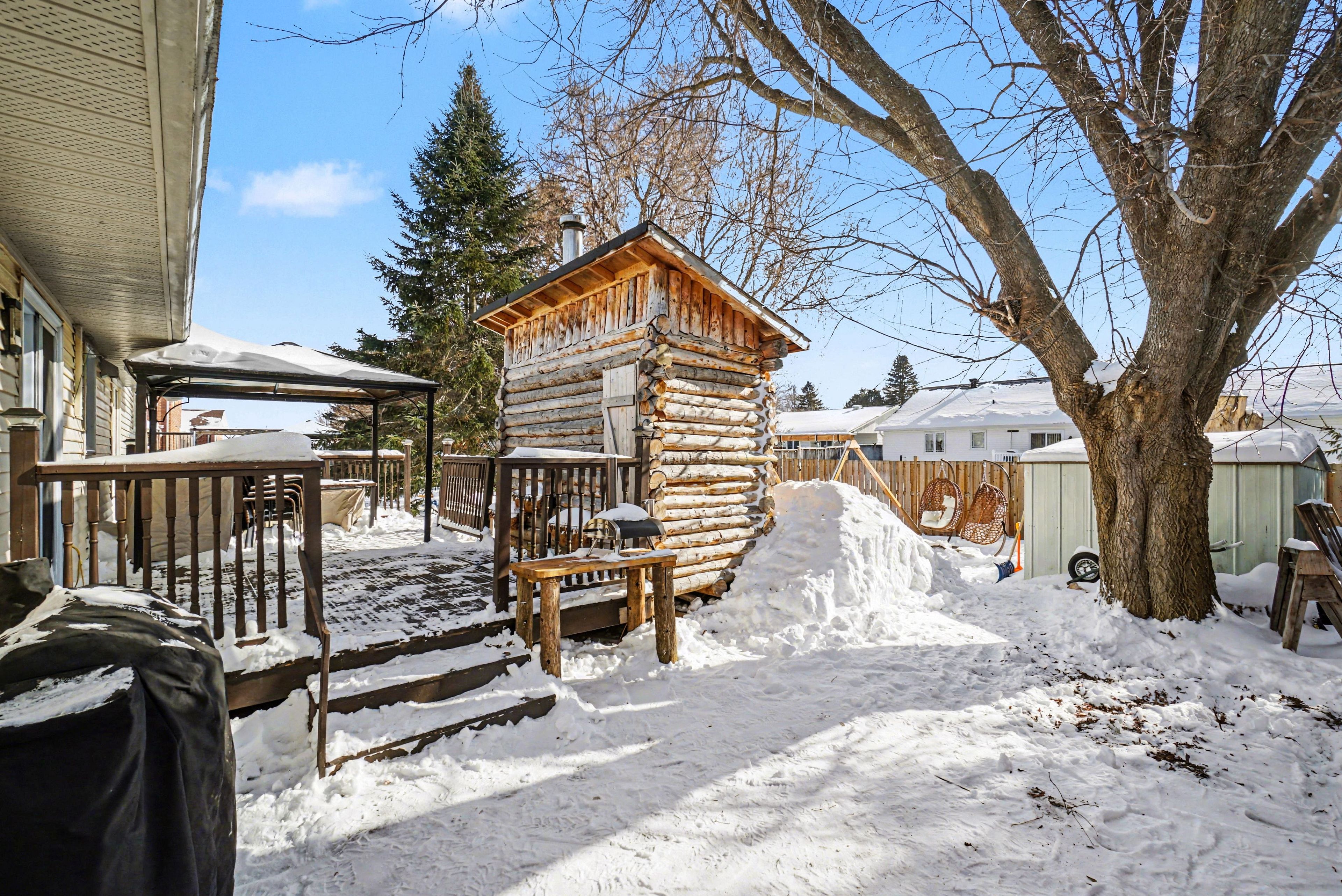 Bright and inviting split-level home located in a quiet, family-friendly embrun neighbourhood offering easy access to the city and close proximity to schools, parks, and grocery stores. This well-designed home features a charming closed-in front porch, a sun-filled open-concept living and dining area, and a kitchen with table space and direct access to a deck and fully fenced backyard. The main floor includes a laundry room, 2-piece bathroom, and interior access to an insulated double attached garage. Just five steps up are three bedrooms, including a spacious primary suite with a 3-piece ensuite and walk-in closet, plus a full family bathroom. The fully finished basement offers a bright bedroom, a den ideal for a home office, a generous family room with a cozy gas fireplace, and a built-in bar area perfect for entertaining. The backyard is designed for year-round enjoyment with a deck and gazebo, firepit area, space for children's play equipment, and a rustic shed housing a scandinavian-style log sauna, a rare and unique feature. A well-laid-out home with abundant natural light, versatile living spaces, an insulated double attached garage, a closed-in front porch, and a scandinavian log sauna, all in a quiet neighbourhood with quick access to the city-this is a rare opportunity in a desirable embrun location. (40 amp generlink hook up installed on the house meter in october of 2024, gutter guards 2023, fence west yard (2023), sauna (2020), stone patios (2023), roof (2018)). *please note that the sauna stove is excluded.