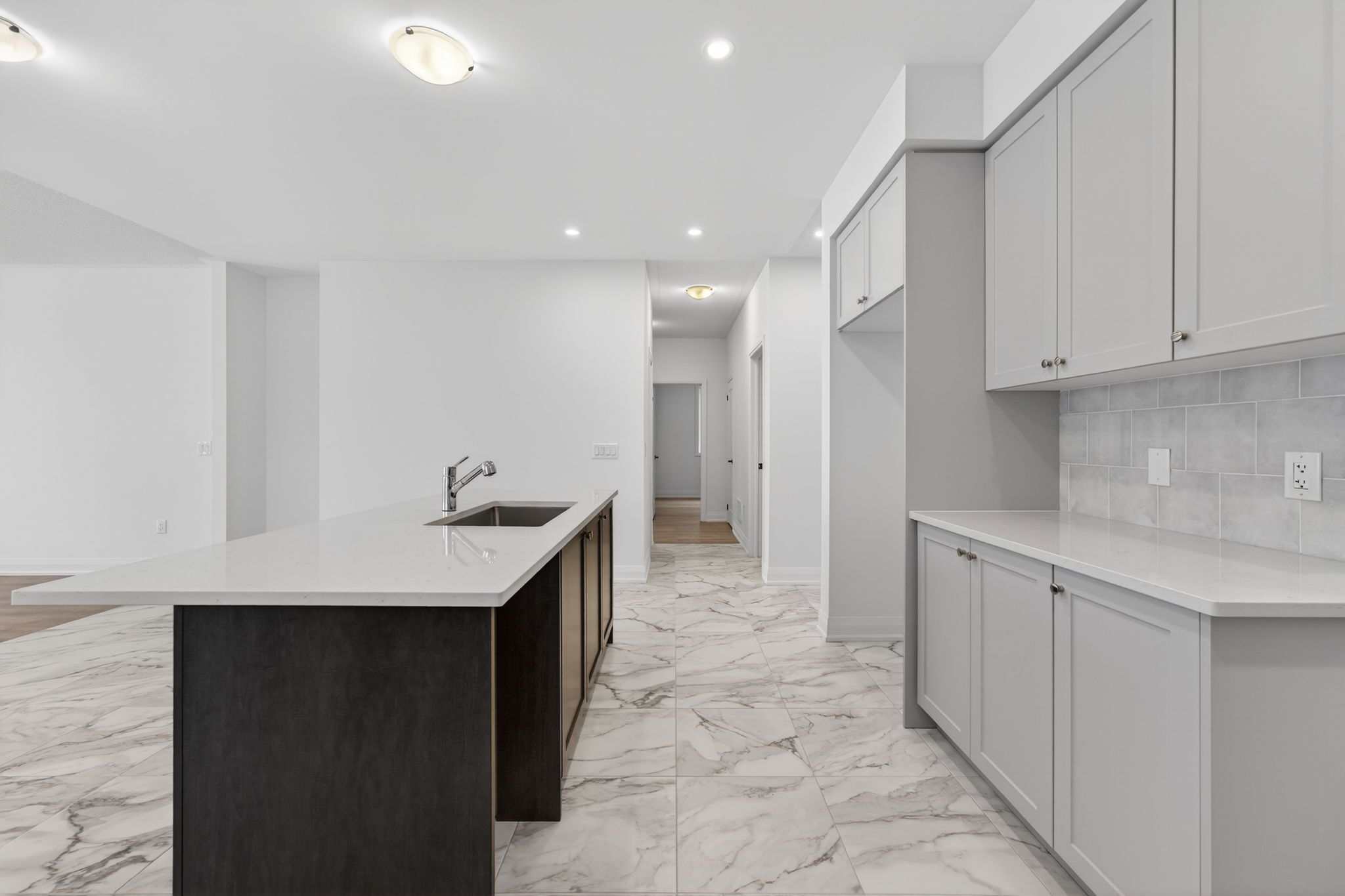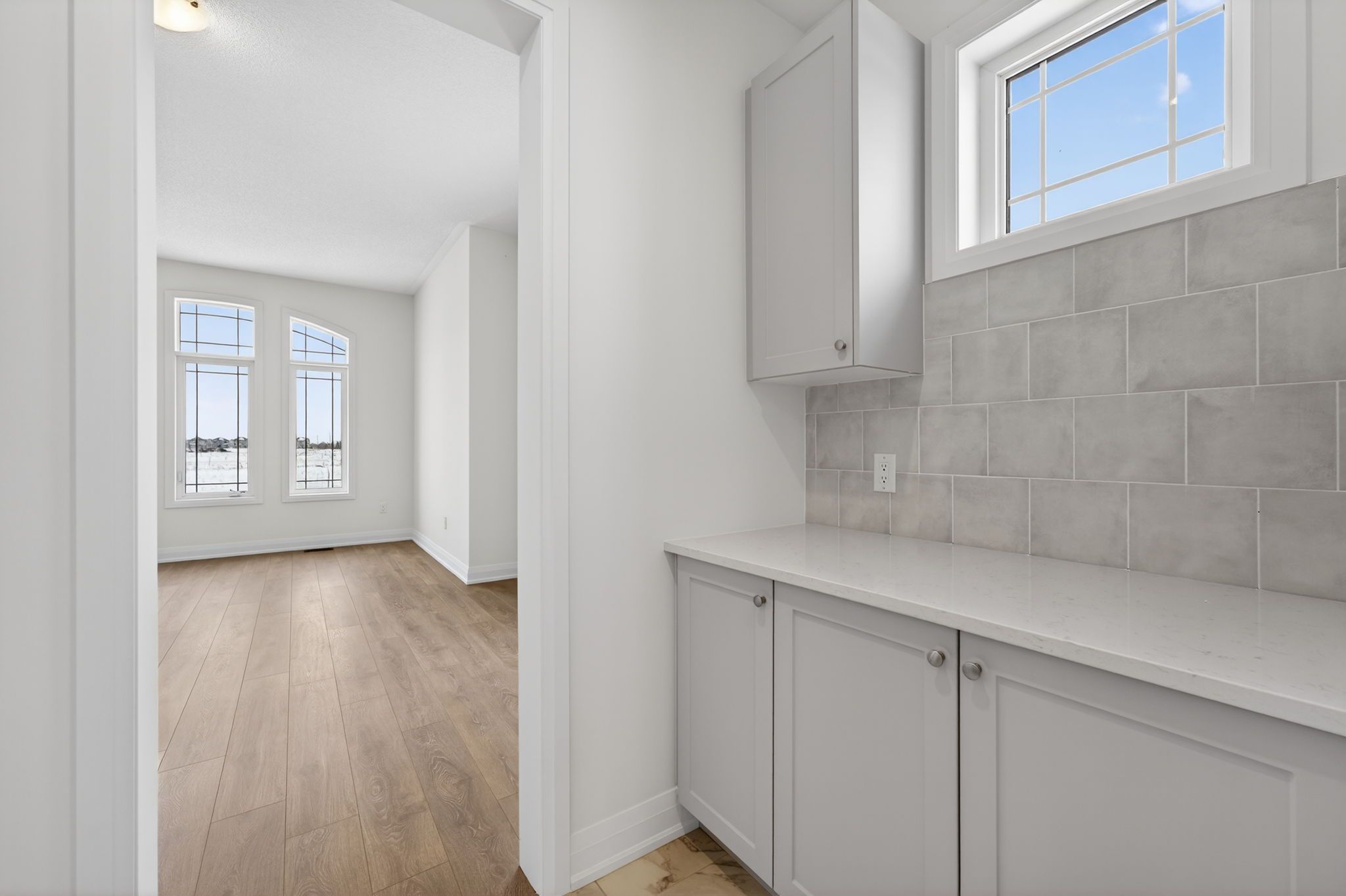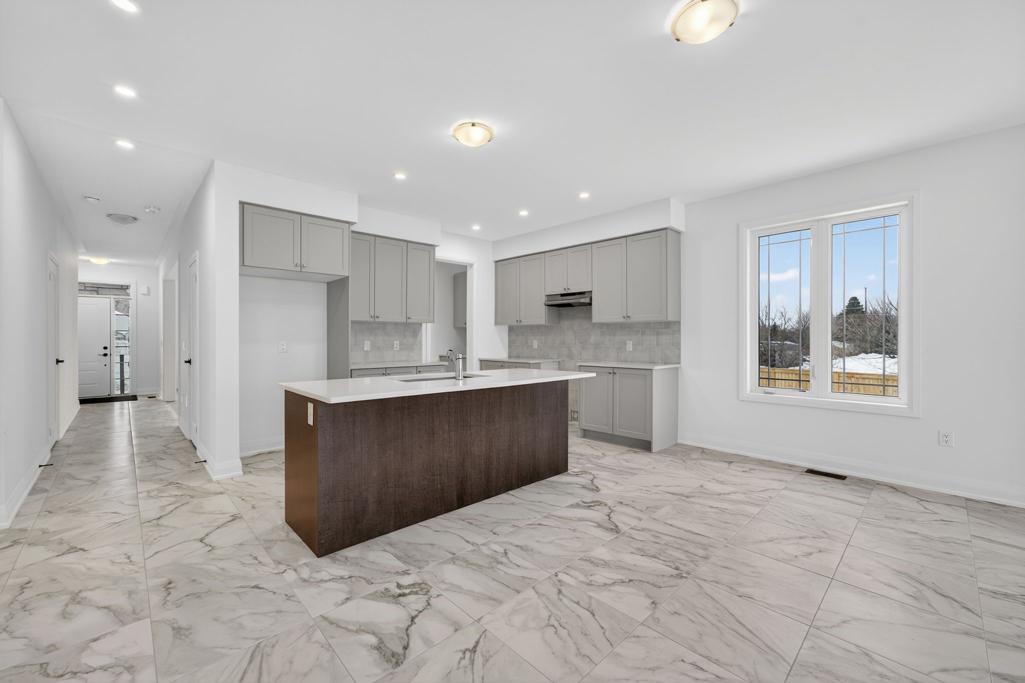 Step into modern elegance with this sun-drenched, never-lived-in 1,966 sq. Ft. (builder's plan) bungalow home! This property is a masterclass in contemporary style, boasting a bright open-concept layout where massive windows flood every corner with natural light. The chef-inspired kitchen is an entertainer's dream, featuring a dedicated servery and a spacious walk-in pantry-the perfect footprint for a custom coffee bar or wine station-complete with stone countertops, enhanced cabinetry, deep upper cabinets above the fridge, a sleek undermount rectangular sink, and a stylish backsplash carried through both the kitchen and servery. The main floor is finished with upgraded tile flooring and pot lights in the kitchen, adding both warmth and functionality to the space. Retreat to the private primary suite, highlighted by sophisticated tray ceilings and a spa-like ensuite featuring a double sink vanity, upgraded cabinetry, and an enhanced soaker tub. The main bathroom is also finished with upgraded cabinetry, completing the home with thoughtful, elevated details throughout. Nestled in a premier master-planned hub with a school already built, you'll enjoy future amenities including scenic trails, shops, and vibrant parks. Experience the perfect blend of luxury and community, all just minutes from the world-famous beach! With a 2-car garage and sitting on an oversized lot, this home is ready for its very first owners. Some photos have been virtually staged for illustrative purposes only.