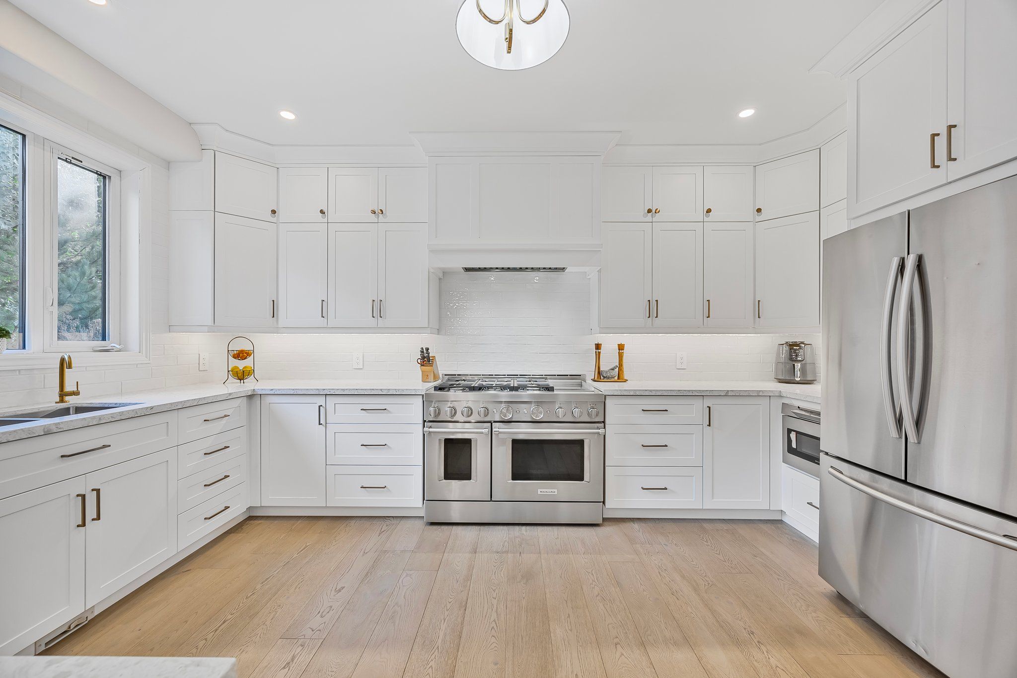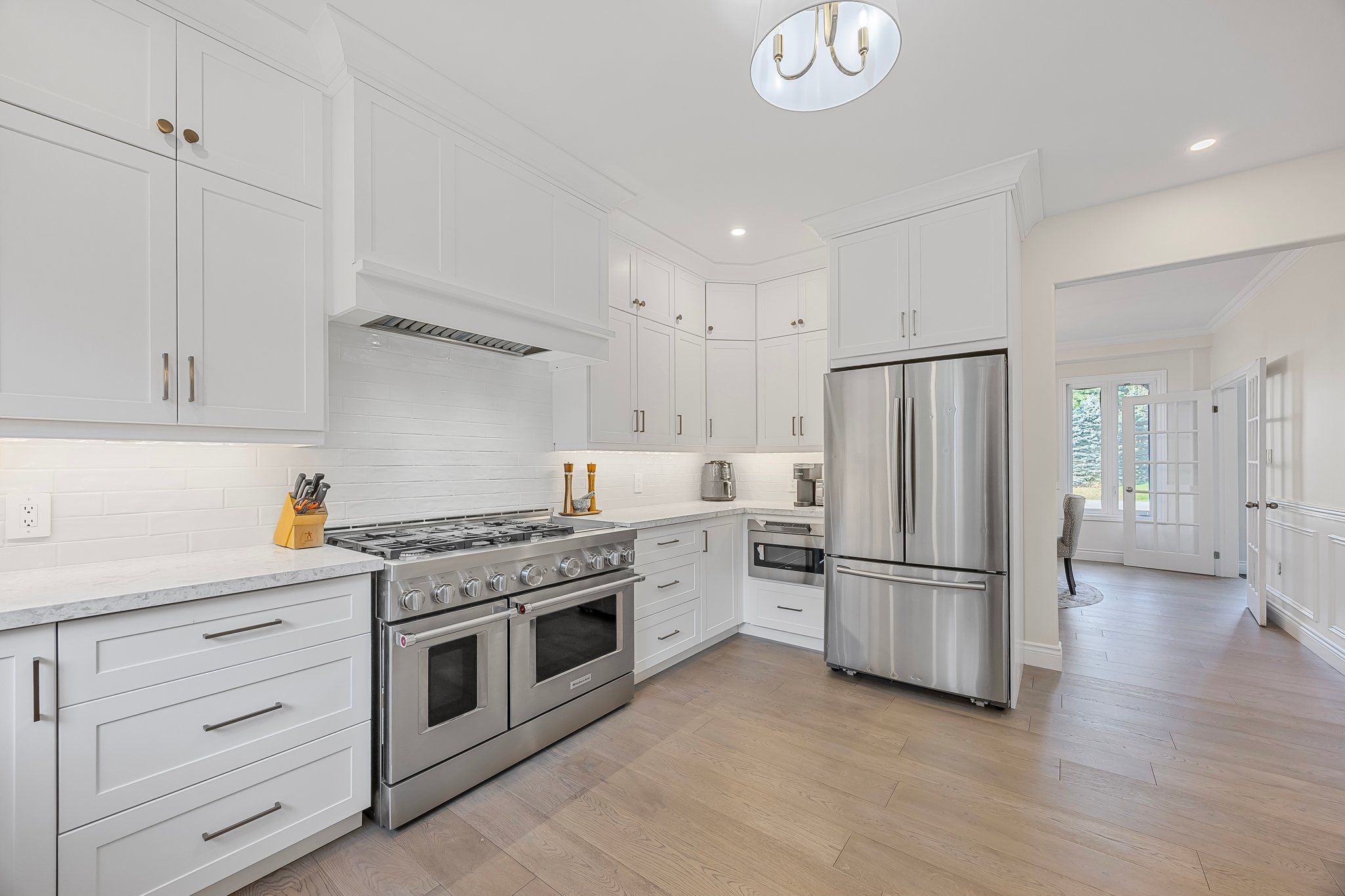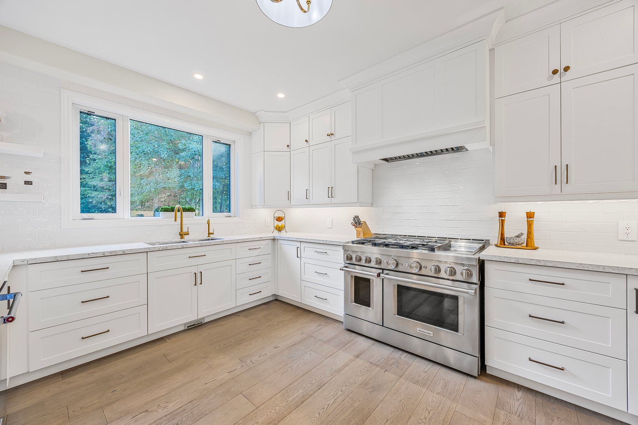 • Stunning kitchen with quartz countertops, custom cabinets, and a gas range.