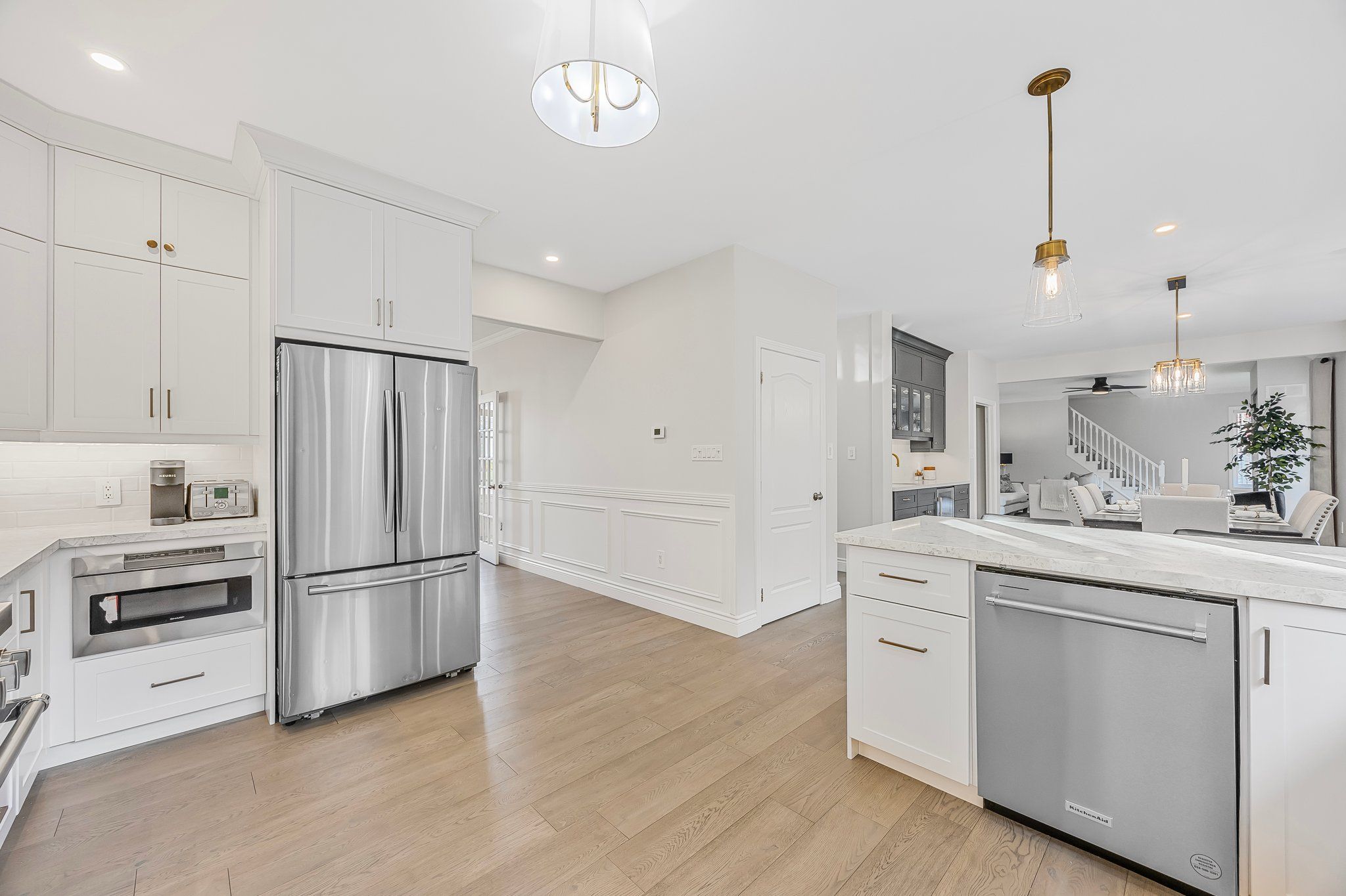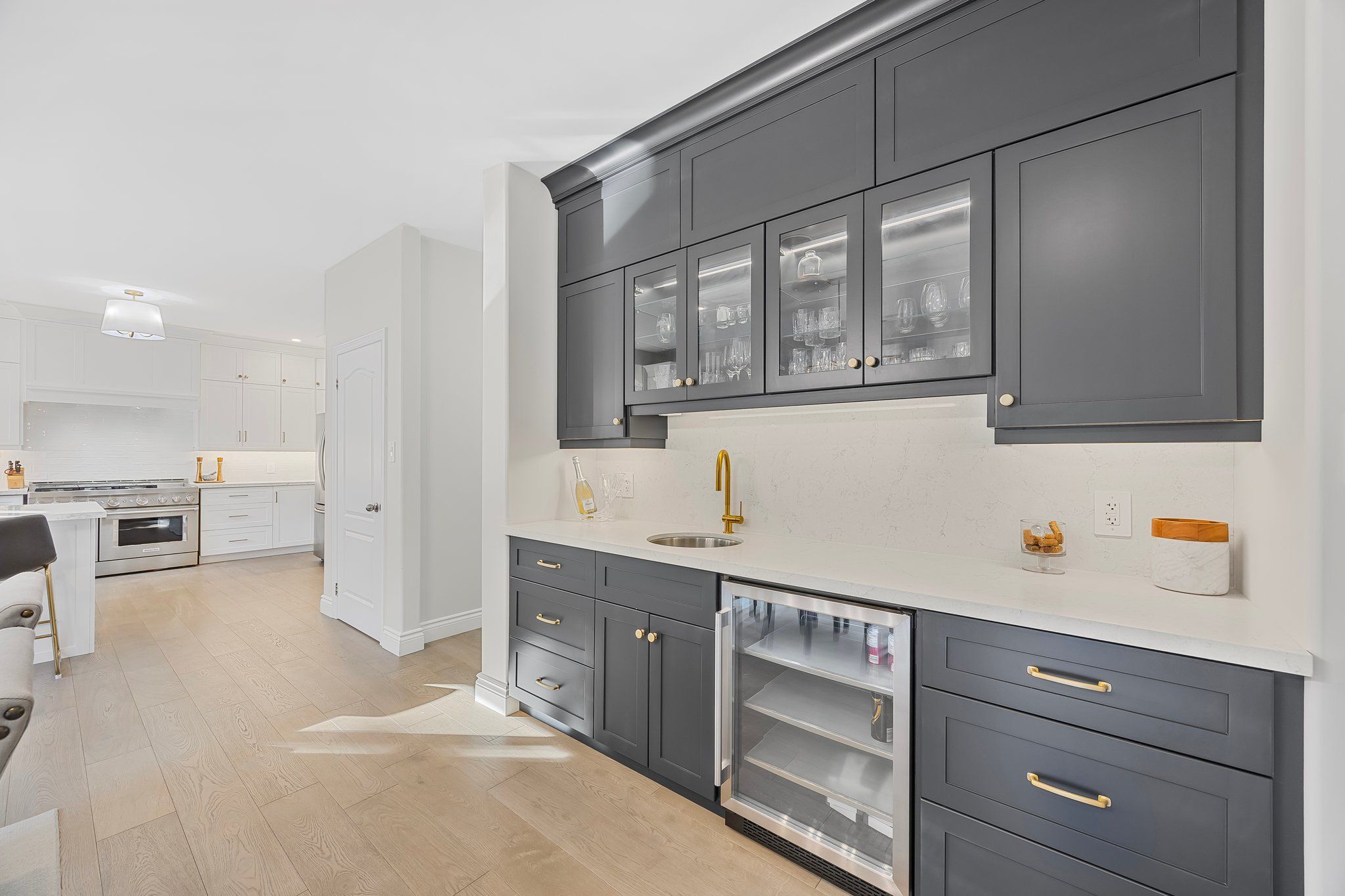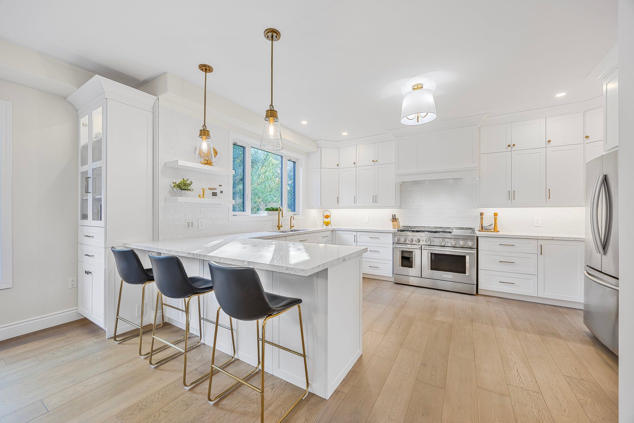 • Stunning kitchen with quartz countertops, custom cabinets, and a gas range.