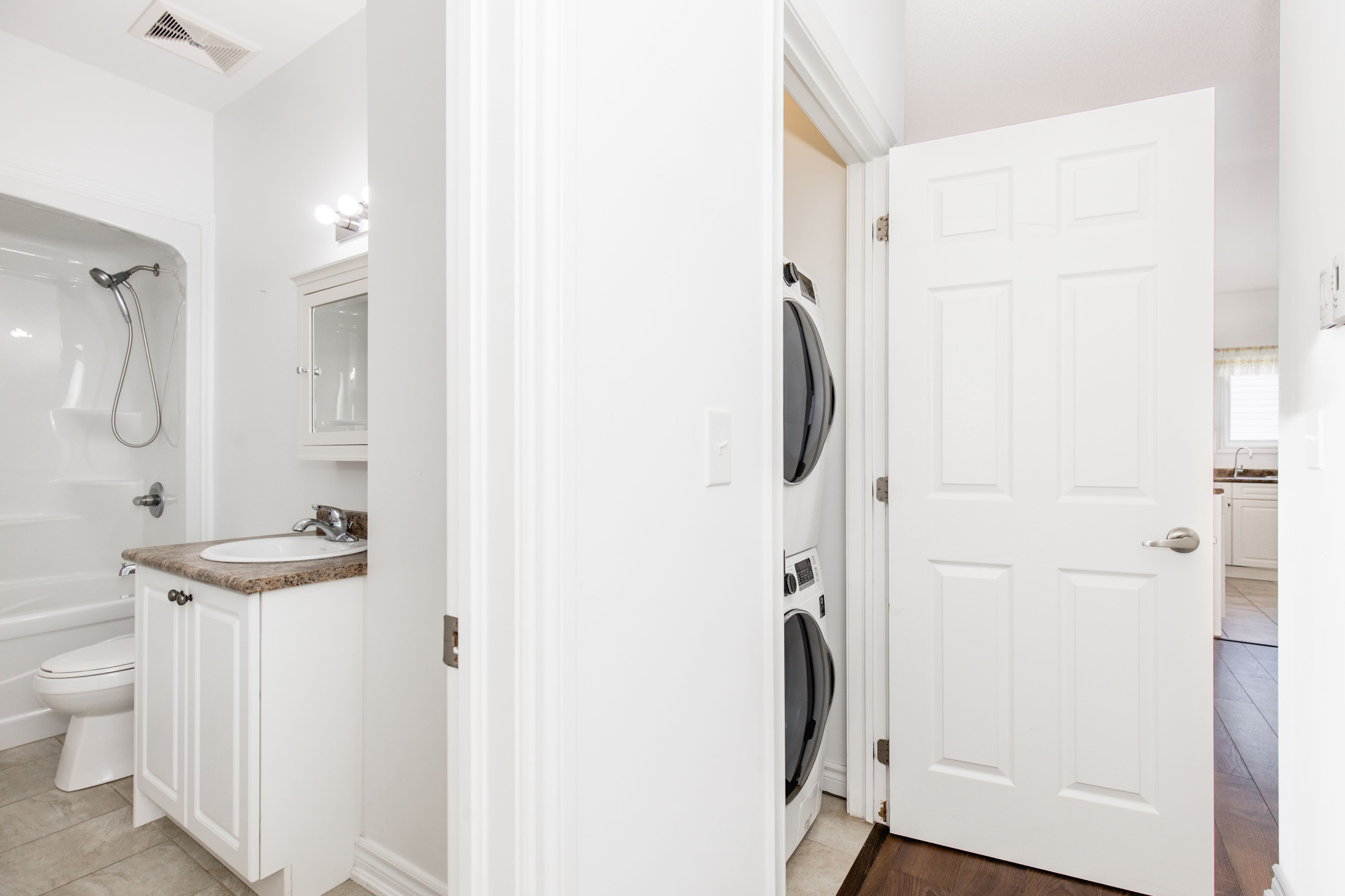 • Heated floors in both bathrooms and the kitchen for added comfort.