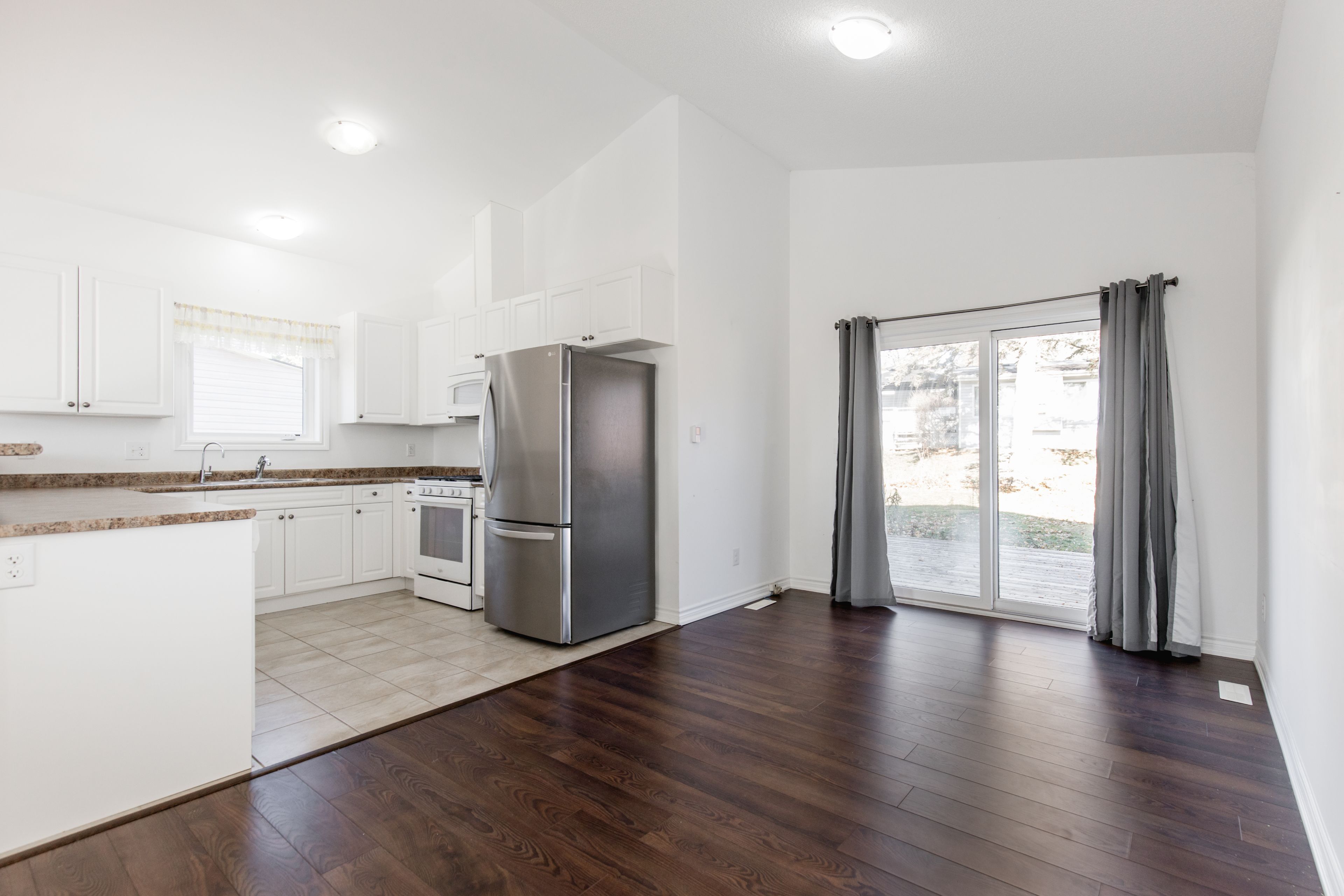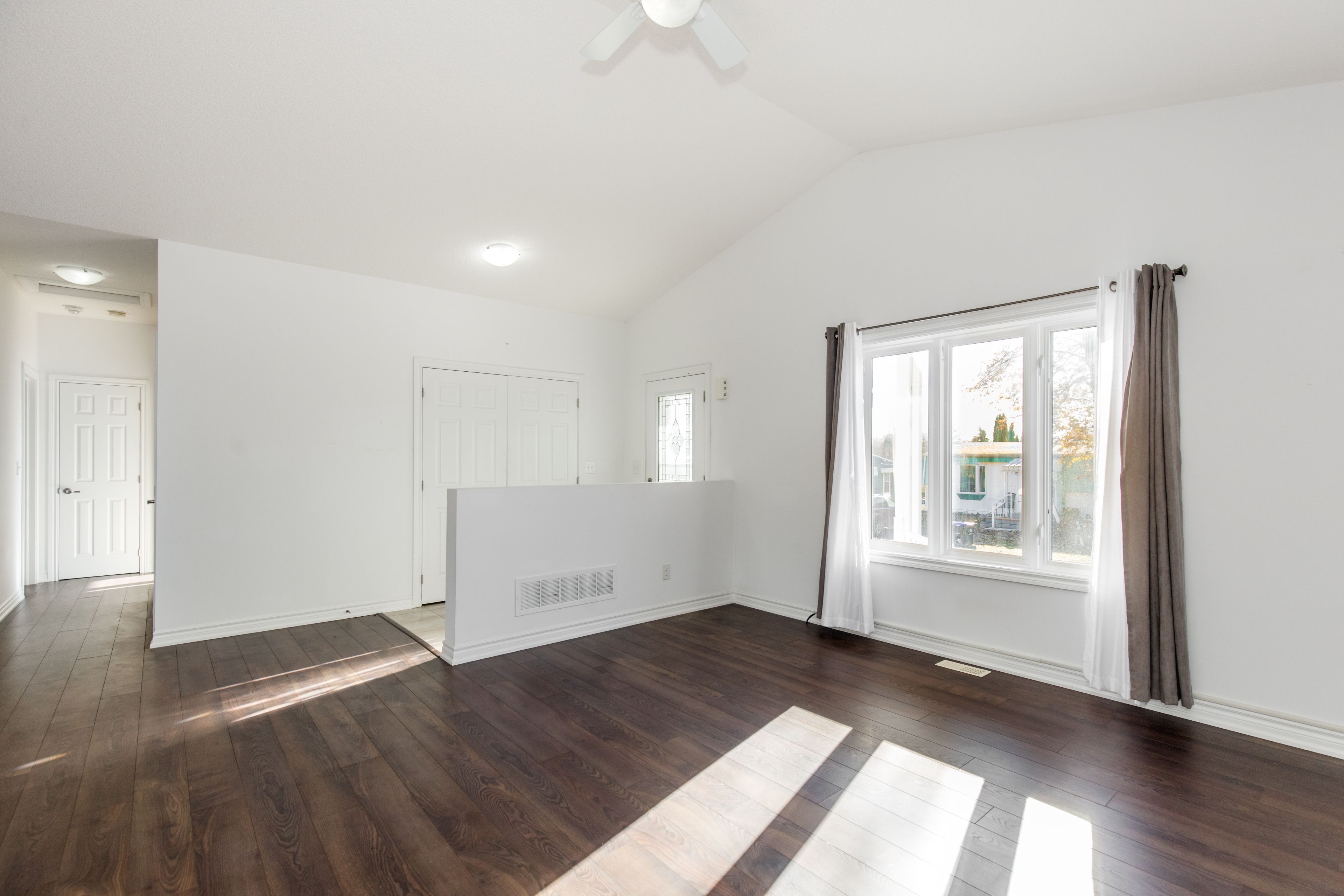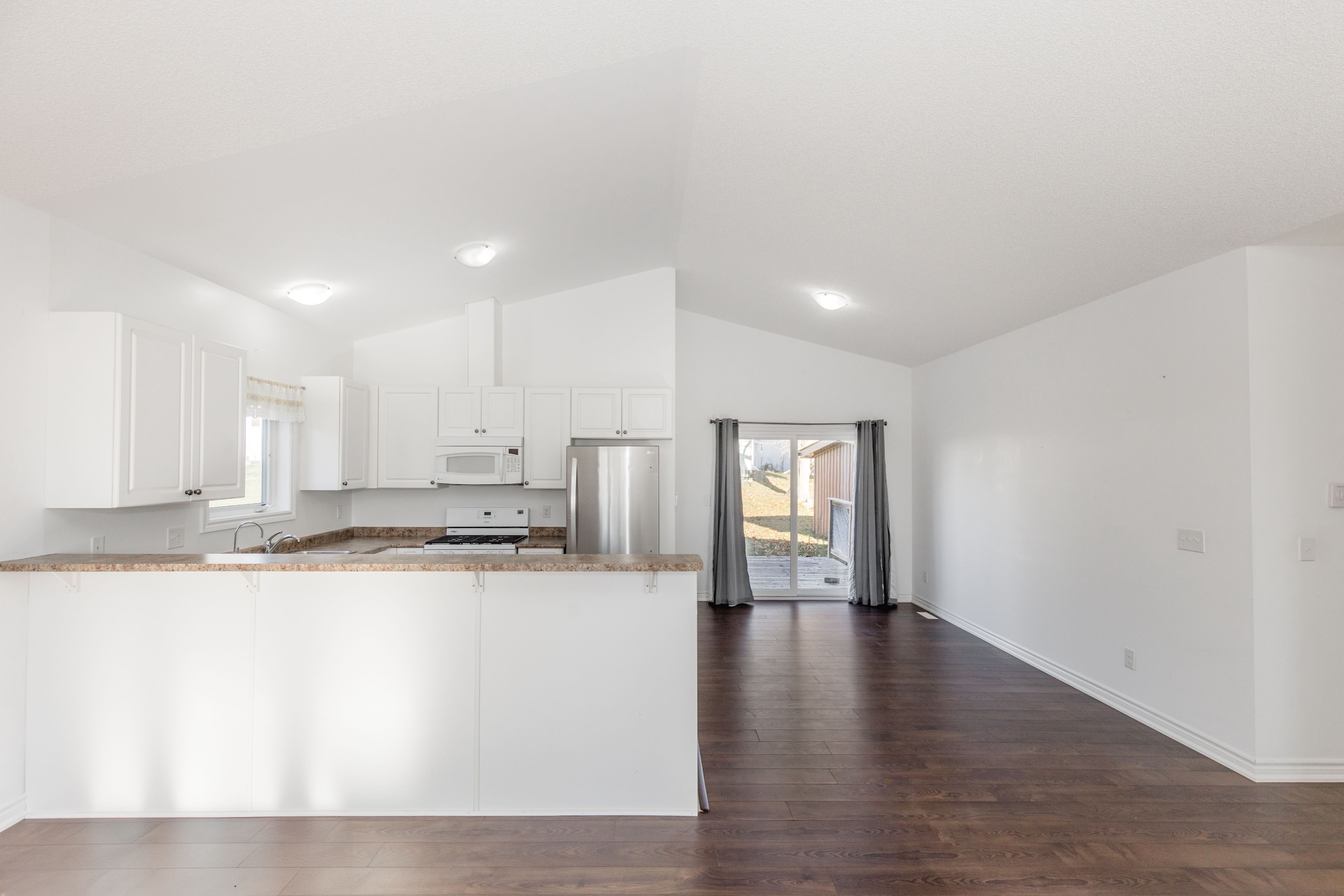 • Open-concept layout with a bright space under a cathedral ceiling.