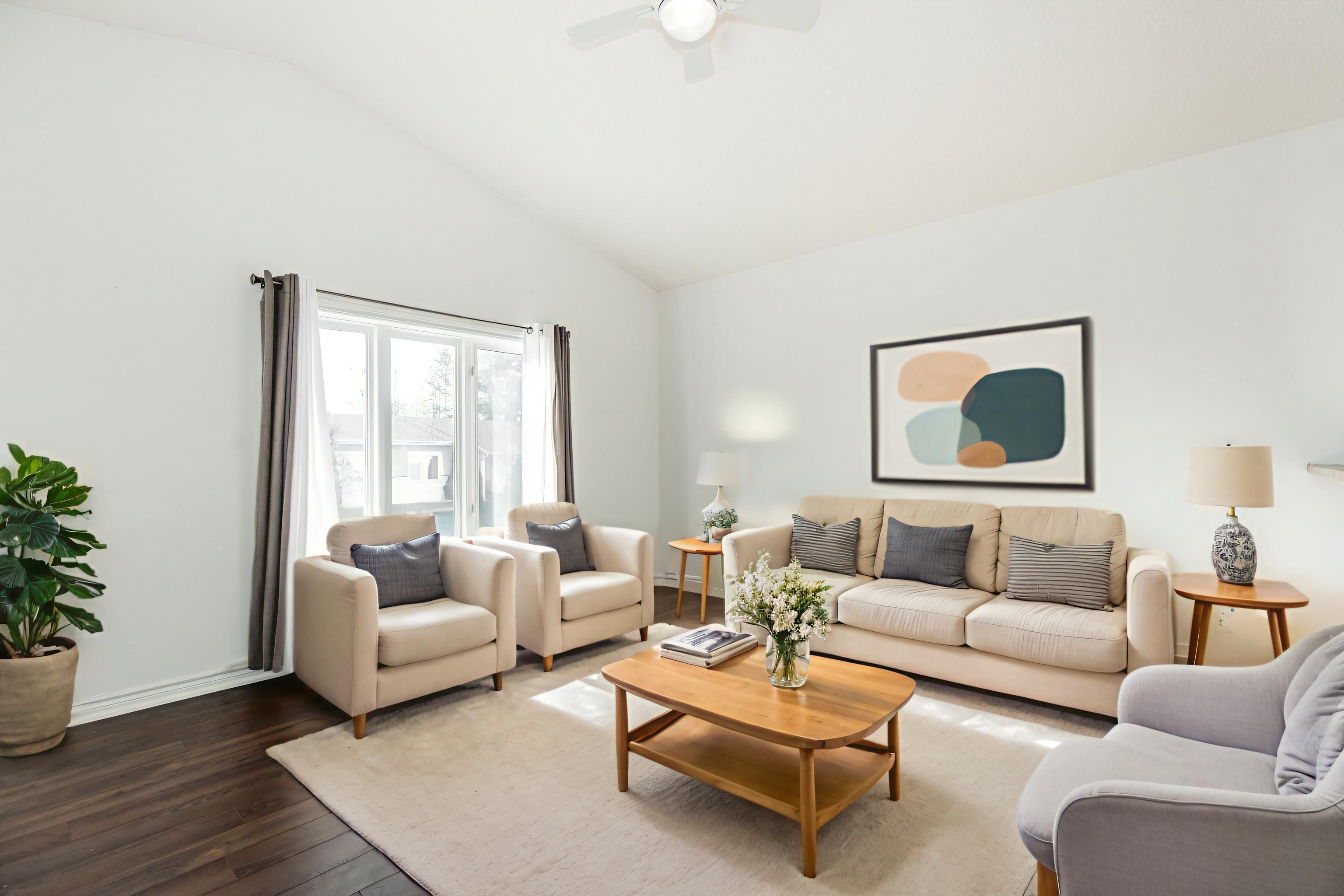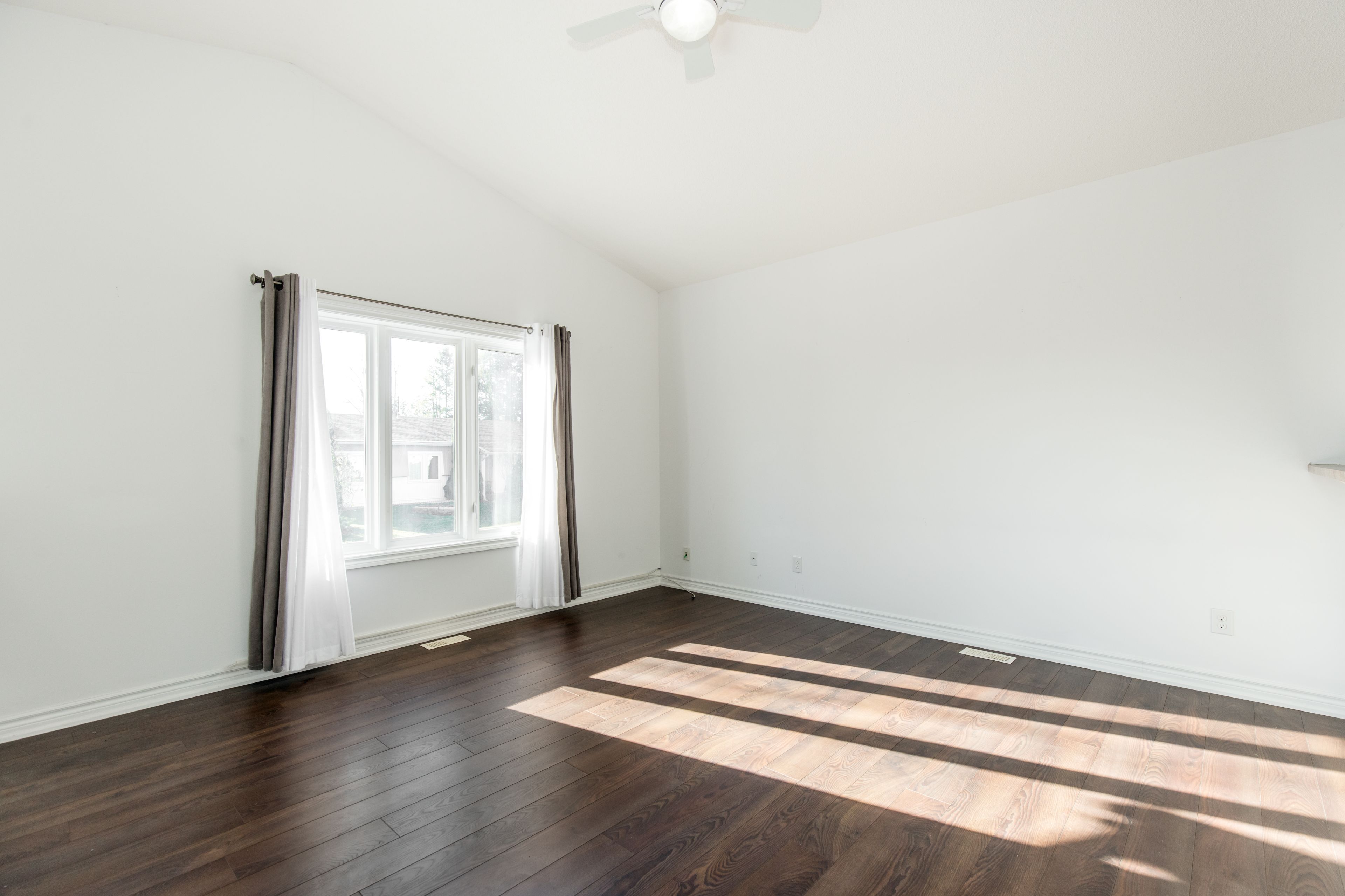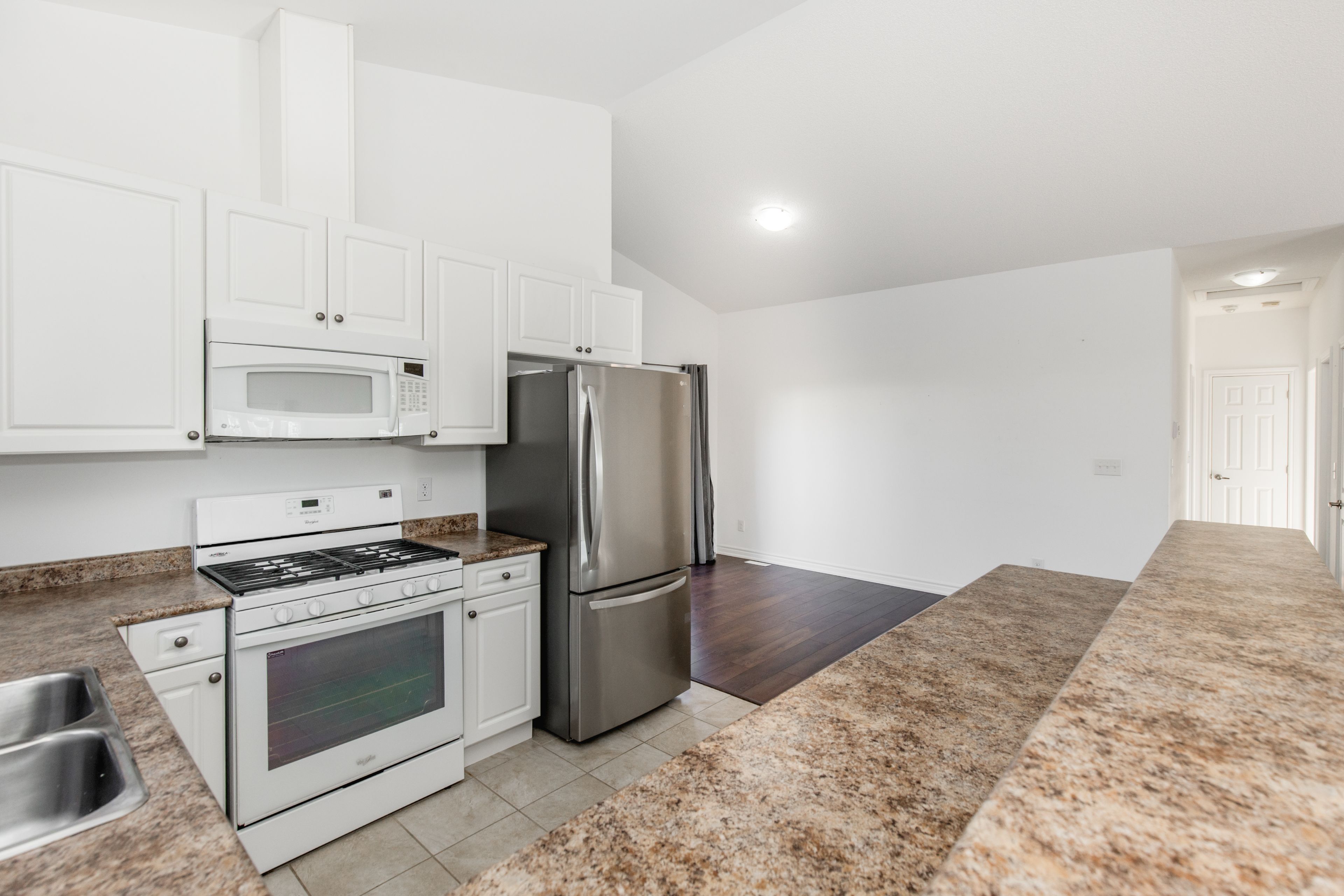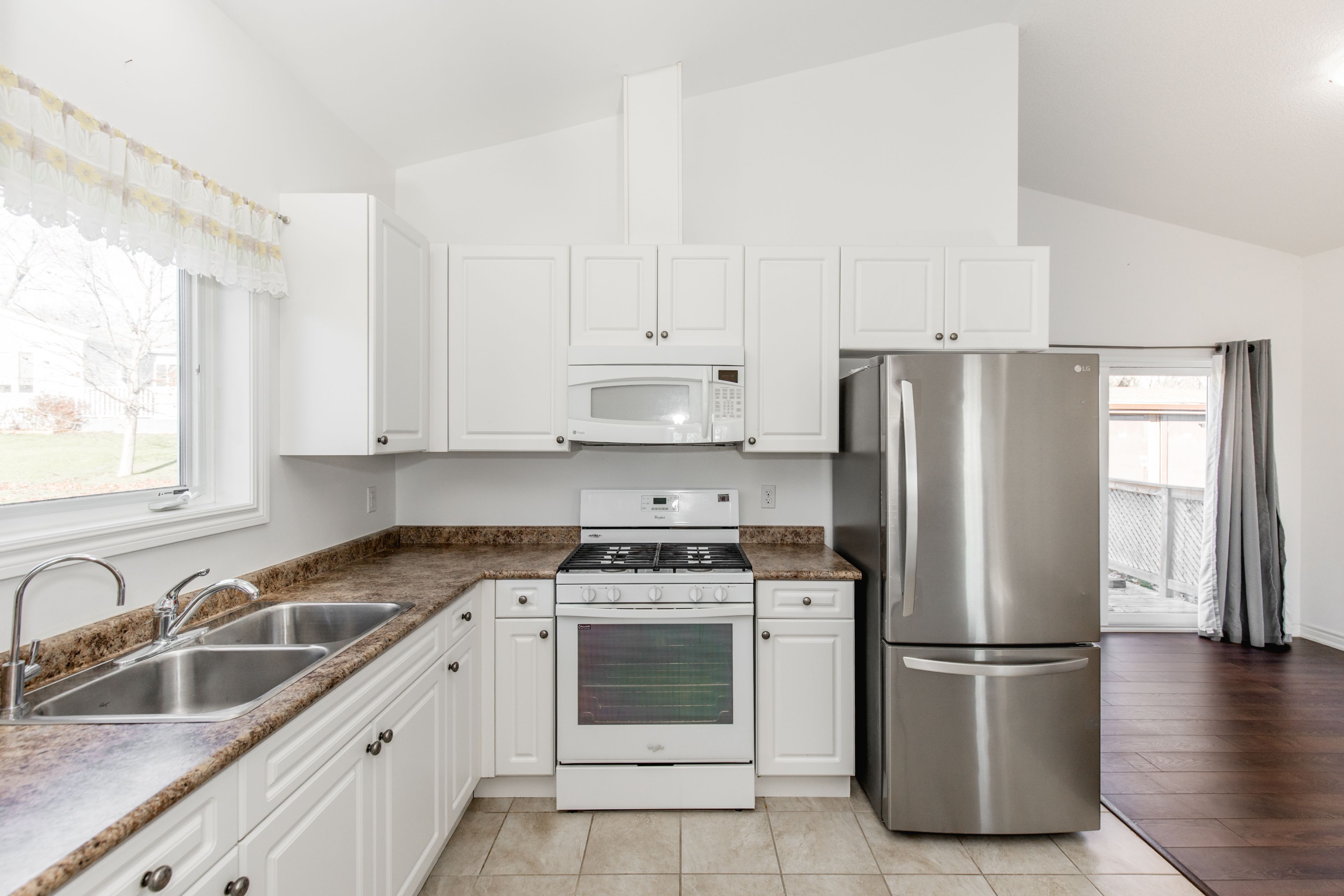 • Open-concept layout with a bright space under a cathedral ceiling.
