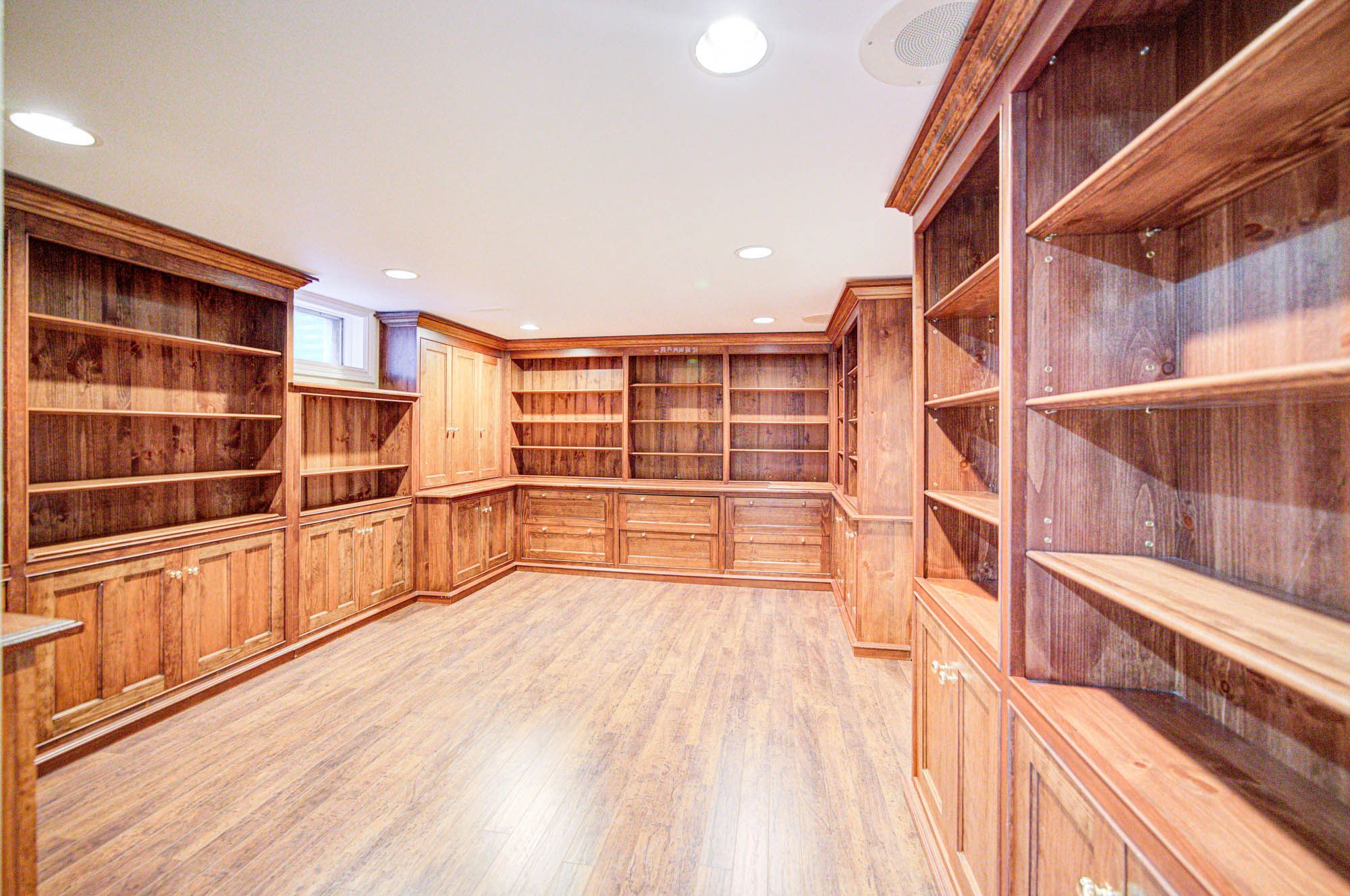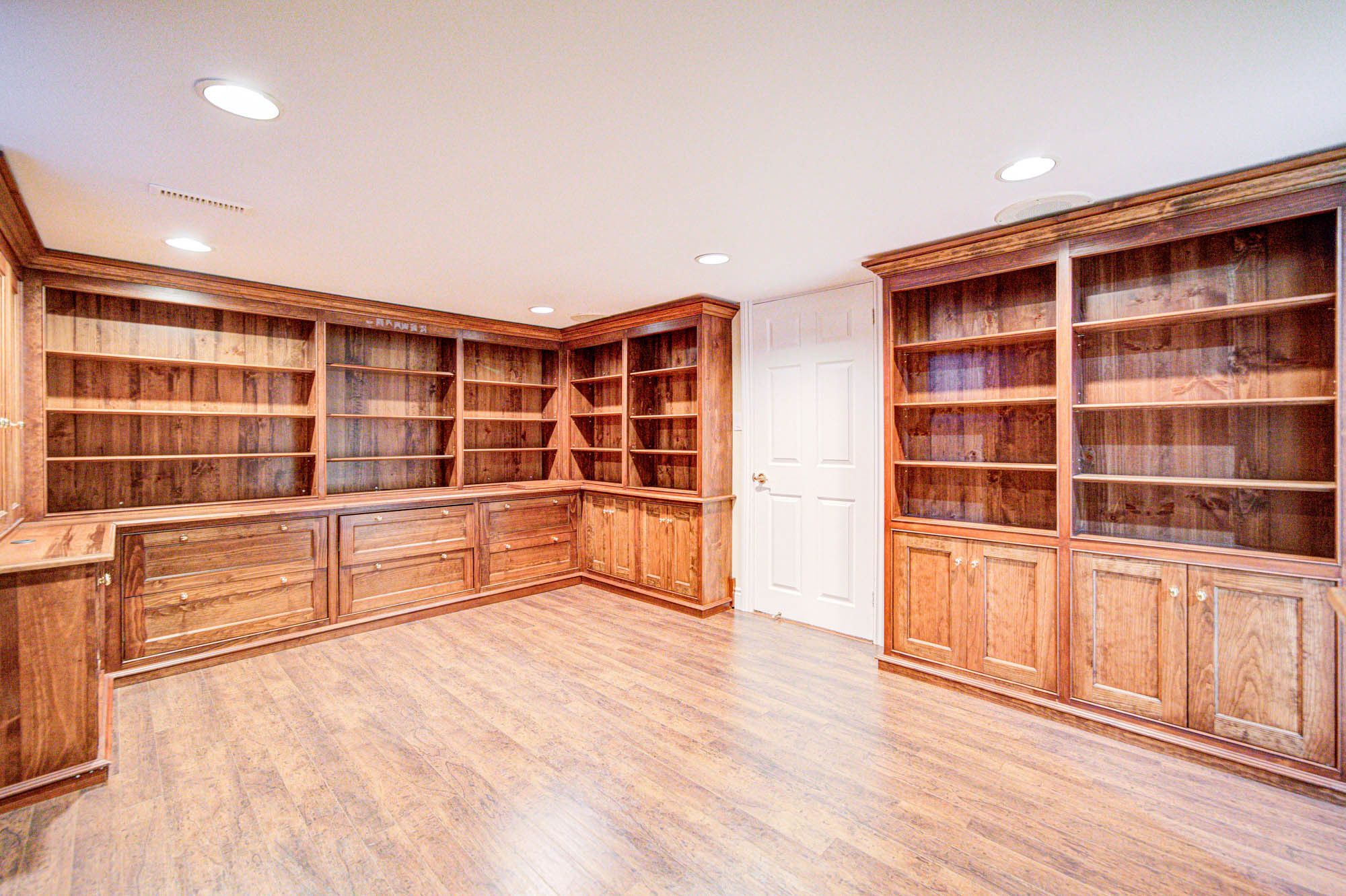 • Modern kitchen features dark granite, built-in double ovens, and gas cooktop.