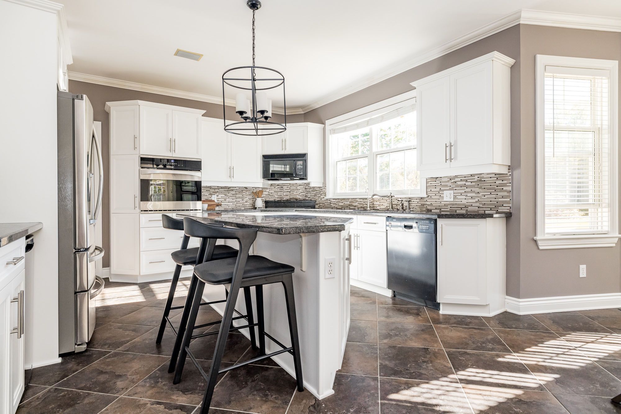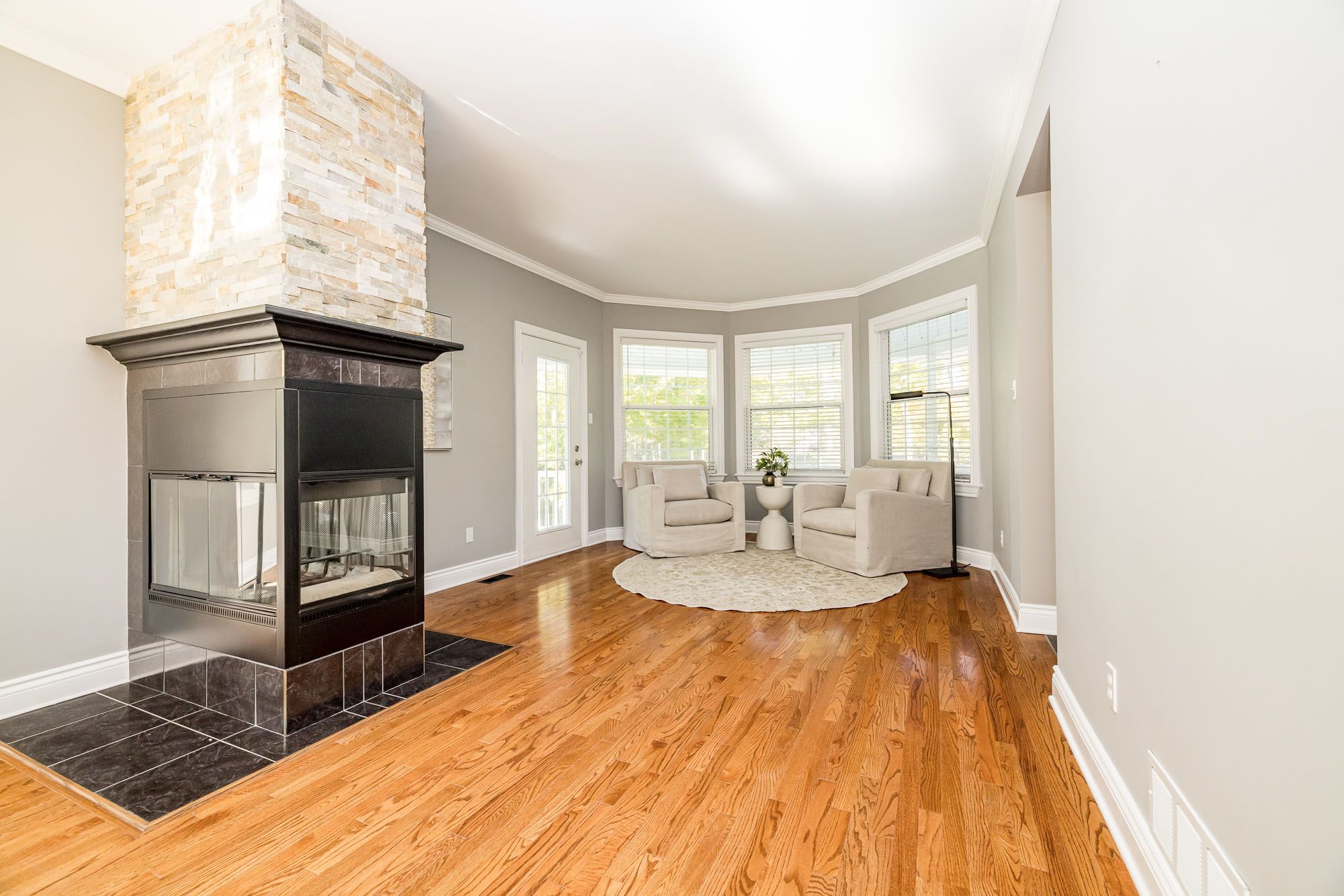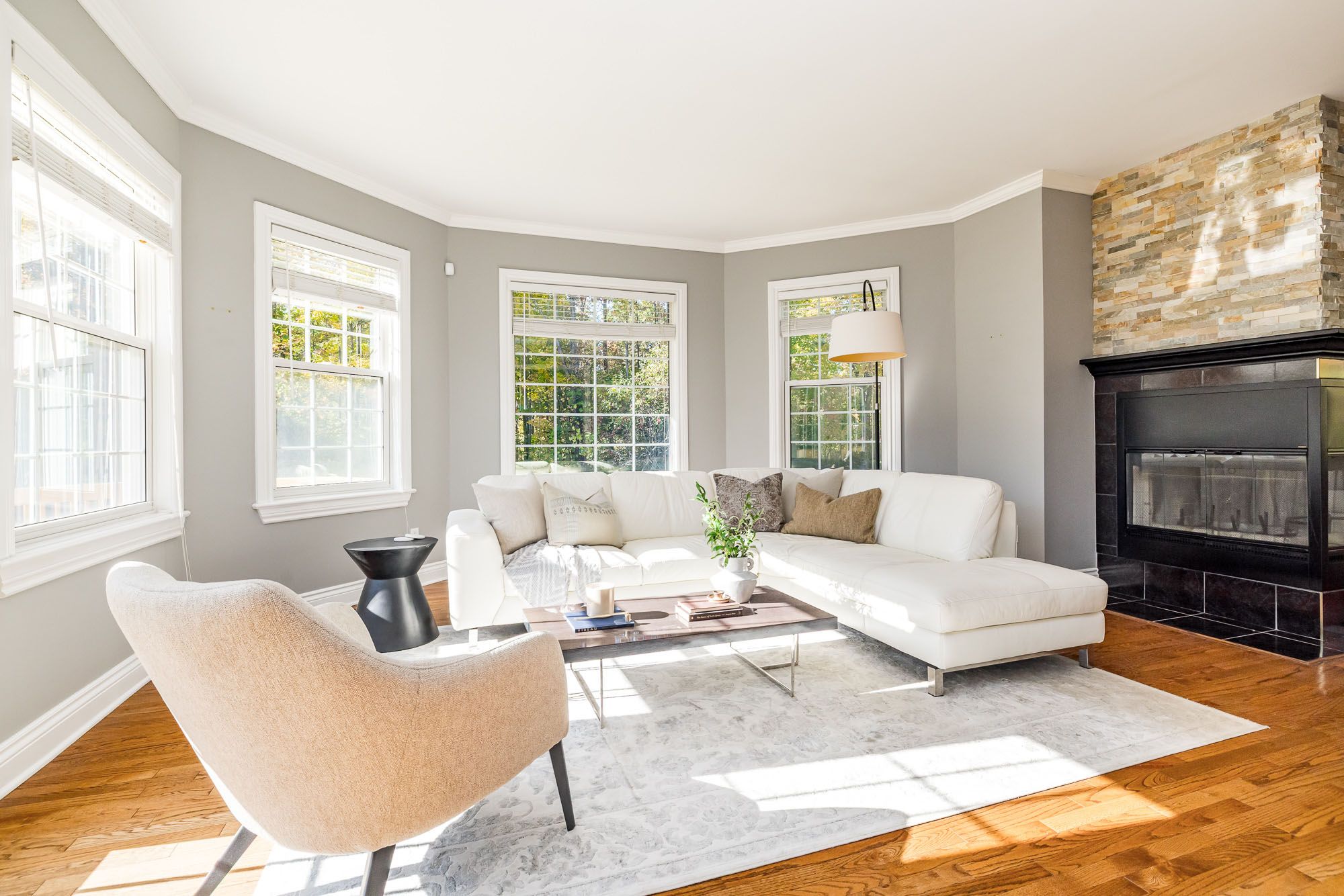 • Abundant natural light and sweeping views through large bay windows.