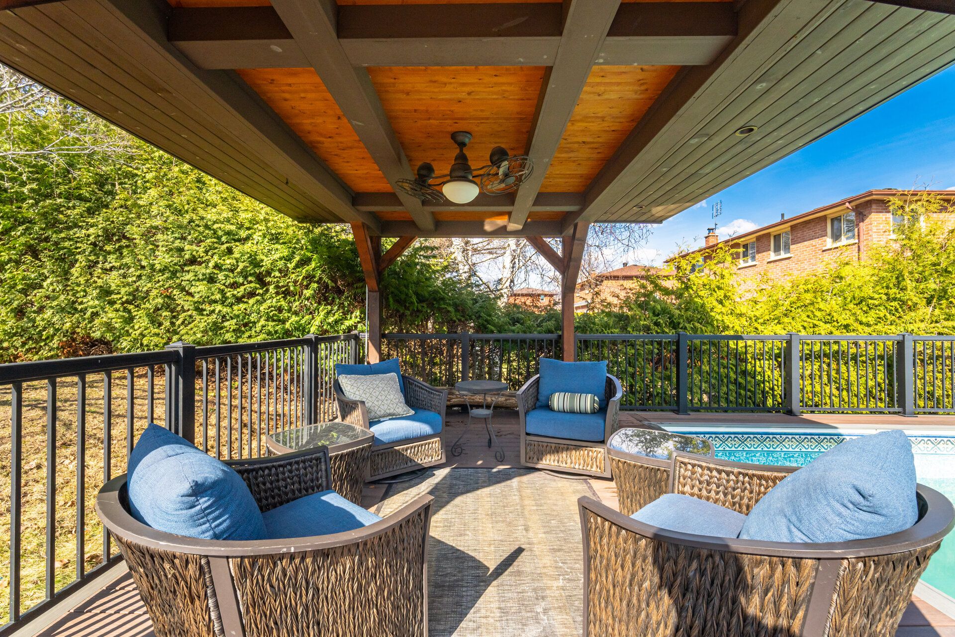 • Backyard features pool, composite deck, lounge area, and fire pit.