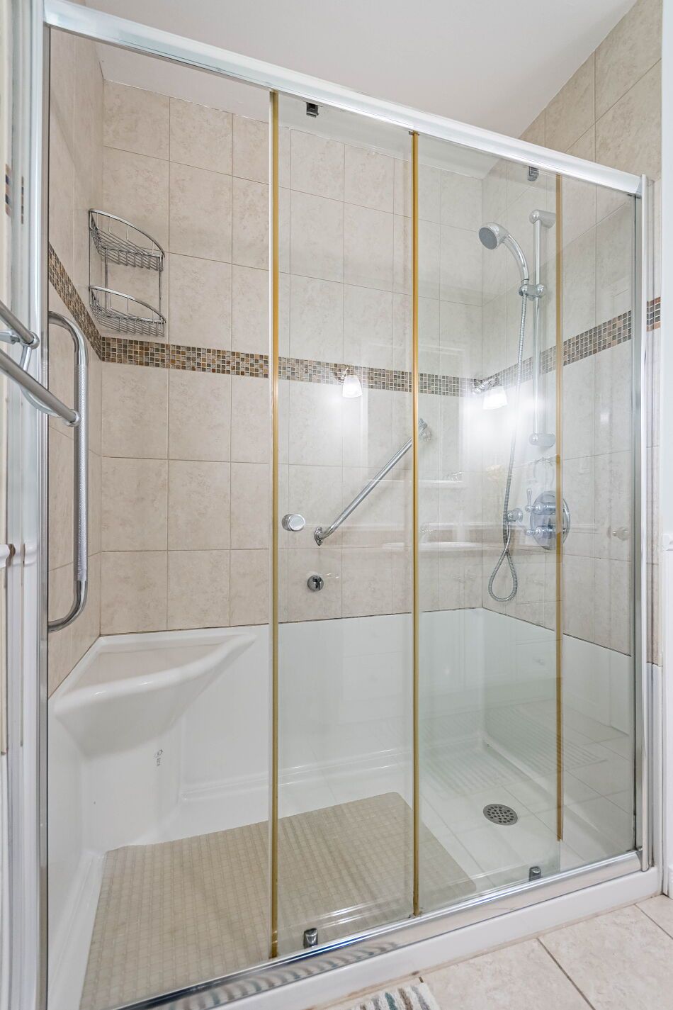 • Eat-in kitchen features a large island, quartz countertops, and stainless steel appliances.