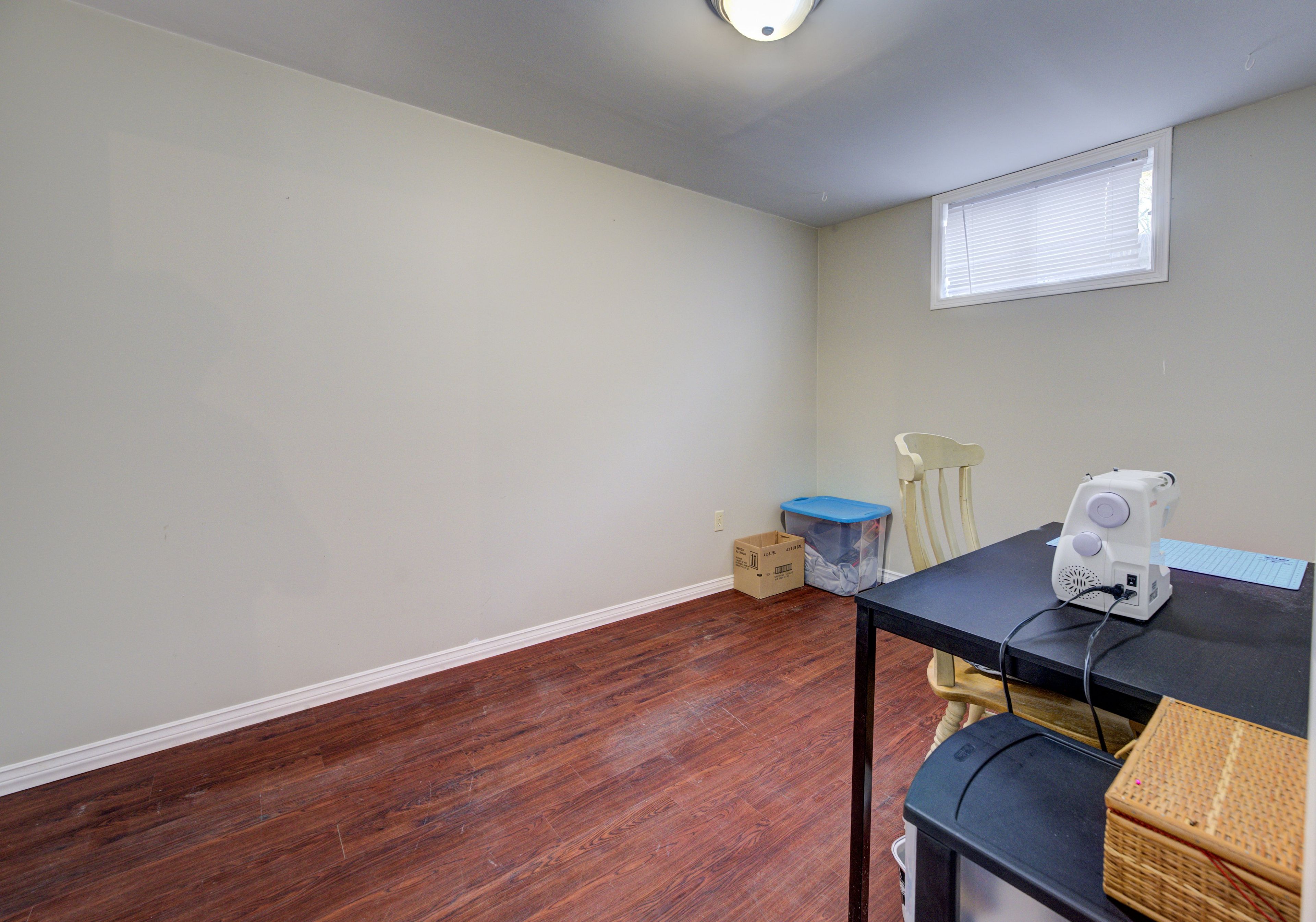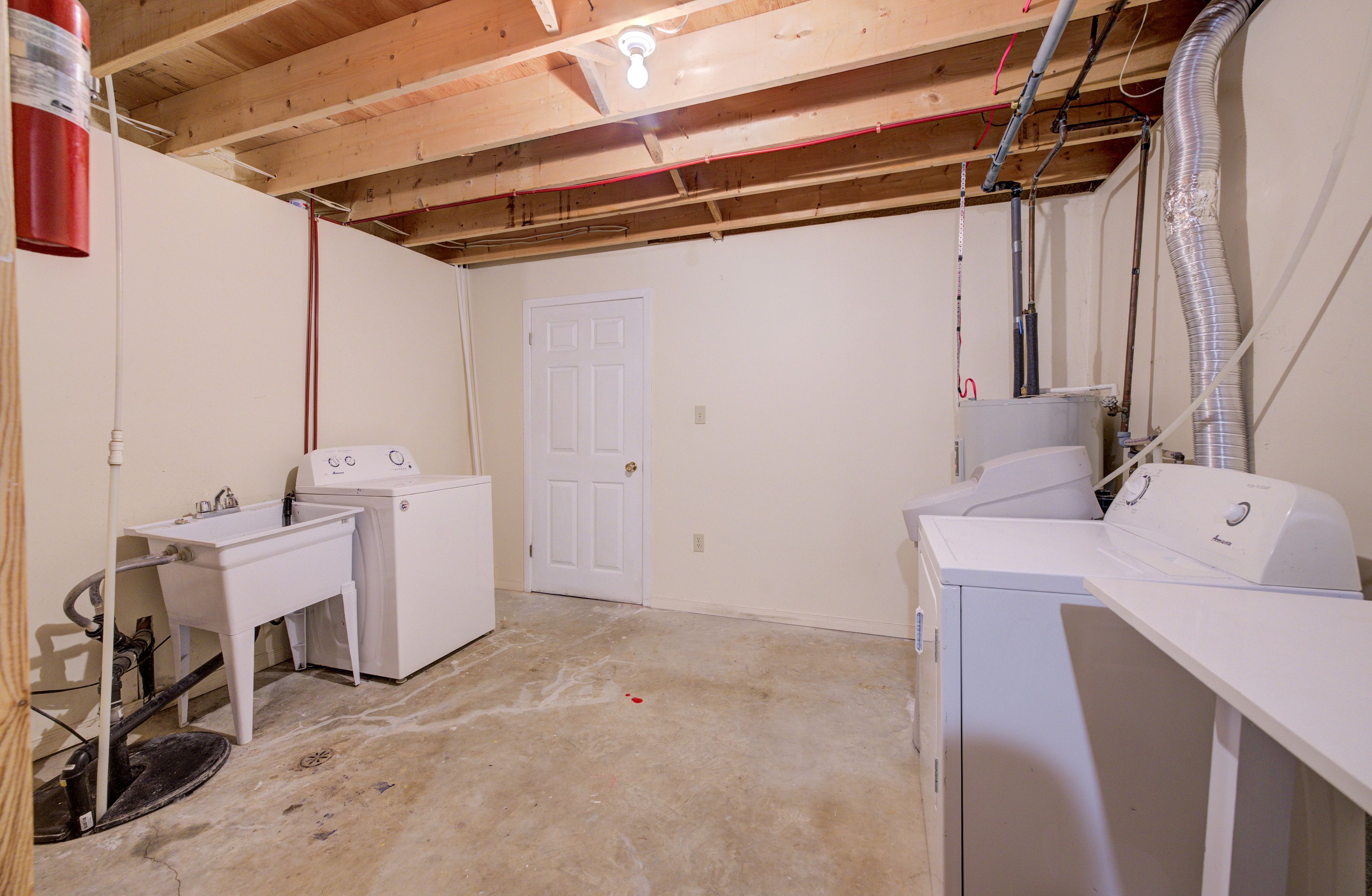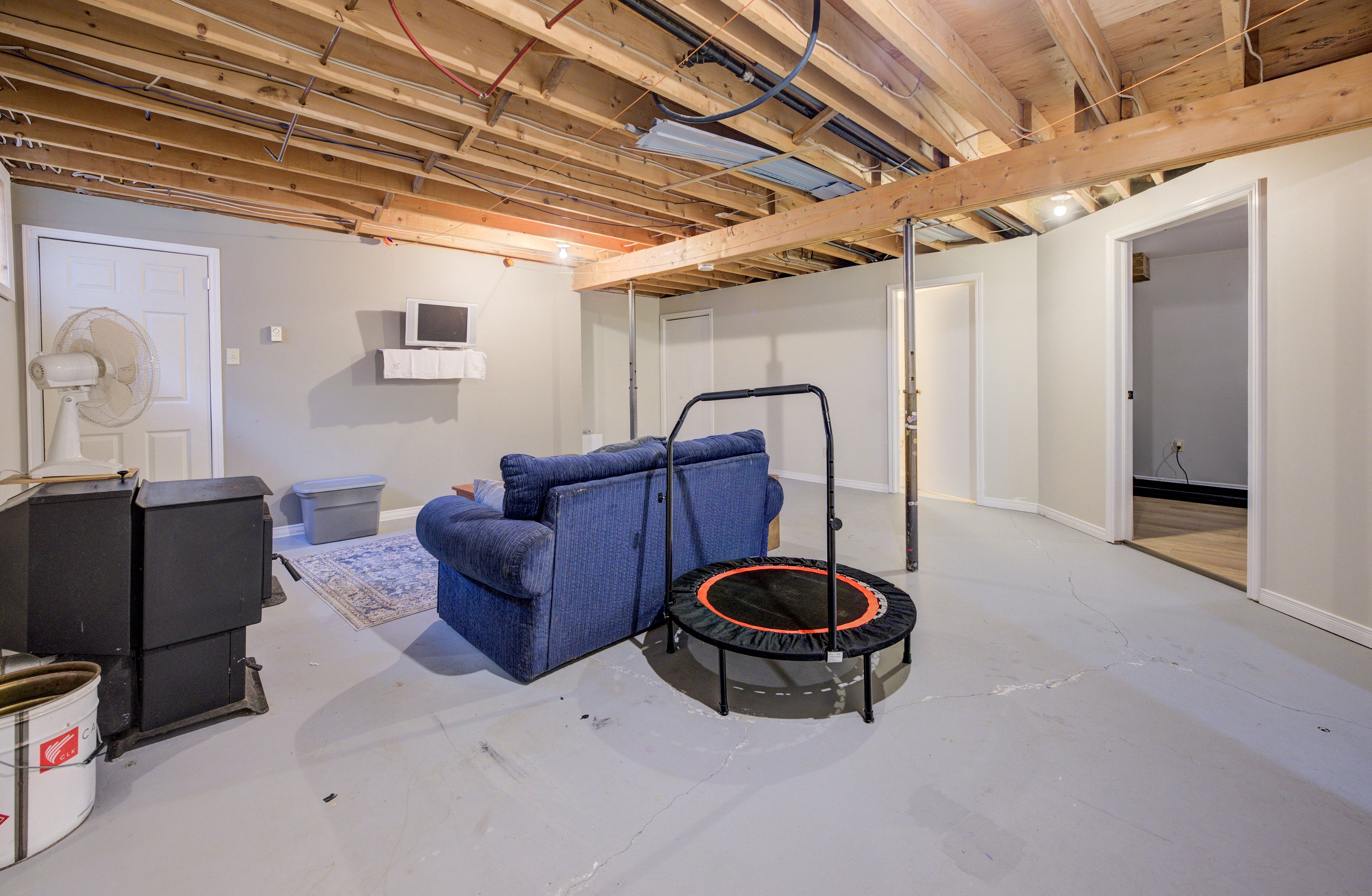 • Bright basement with high ceilings and a cozy pellet stove.