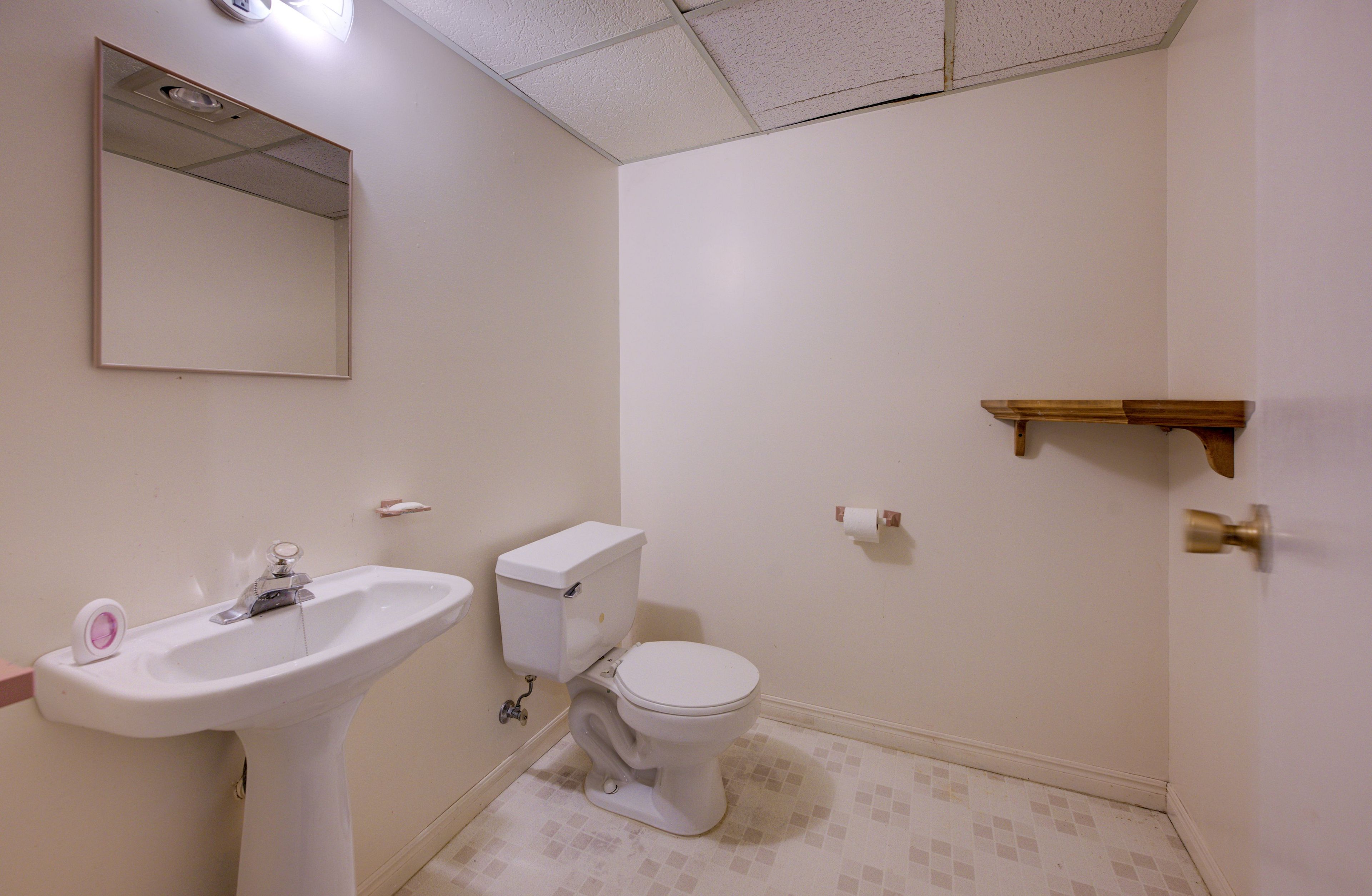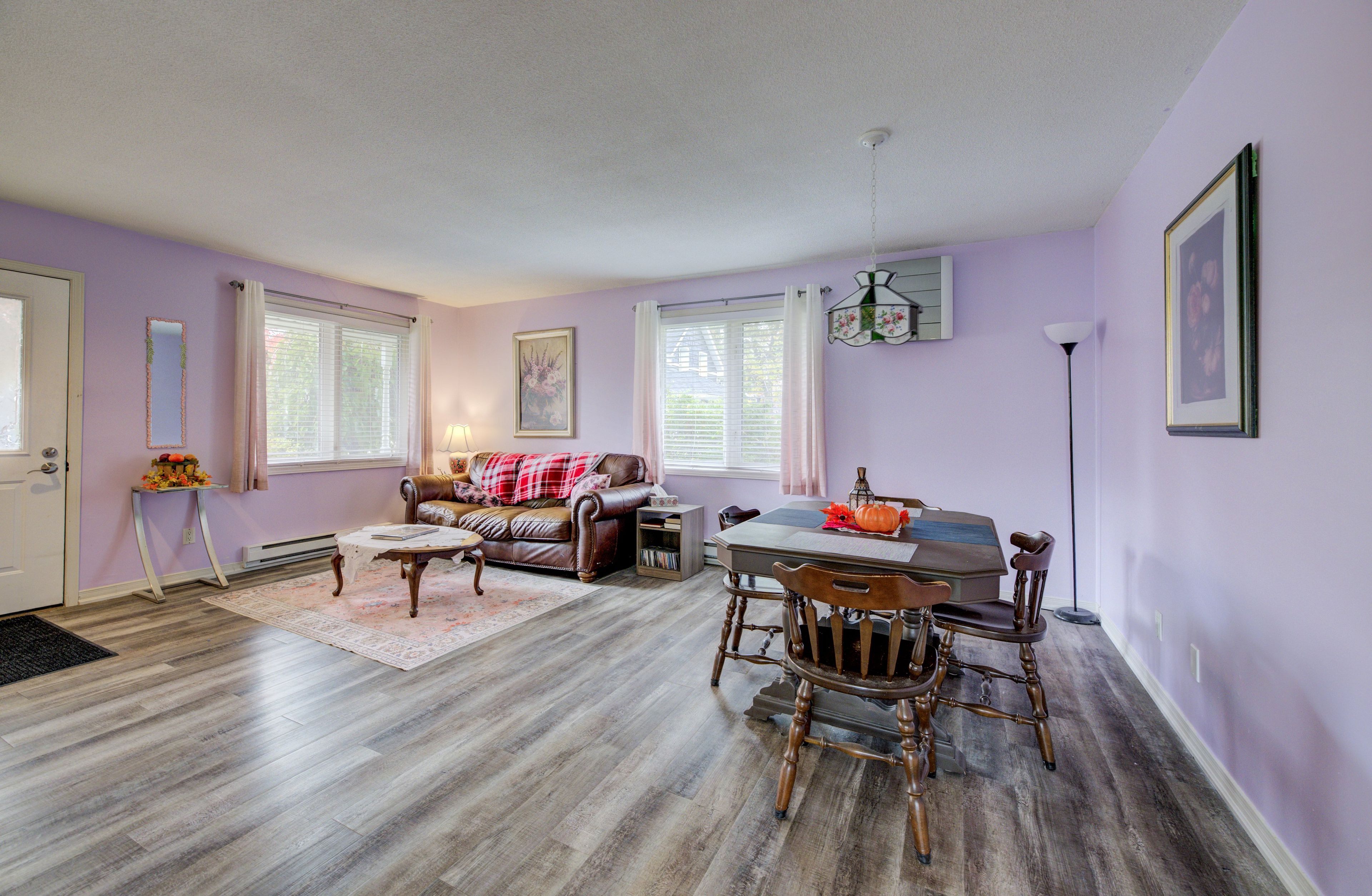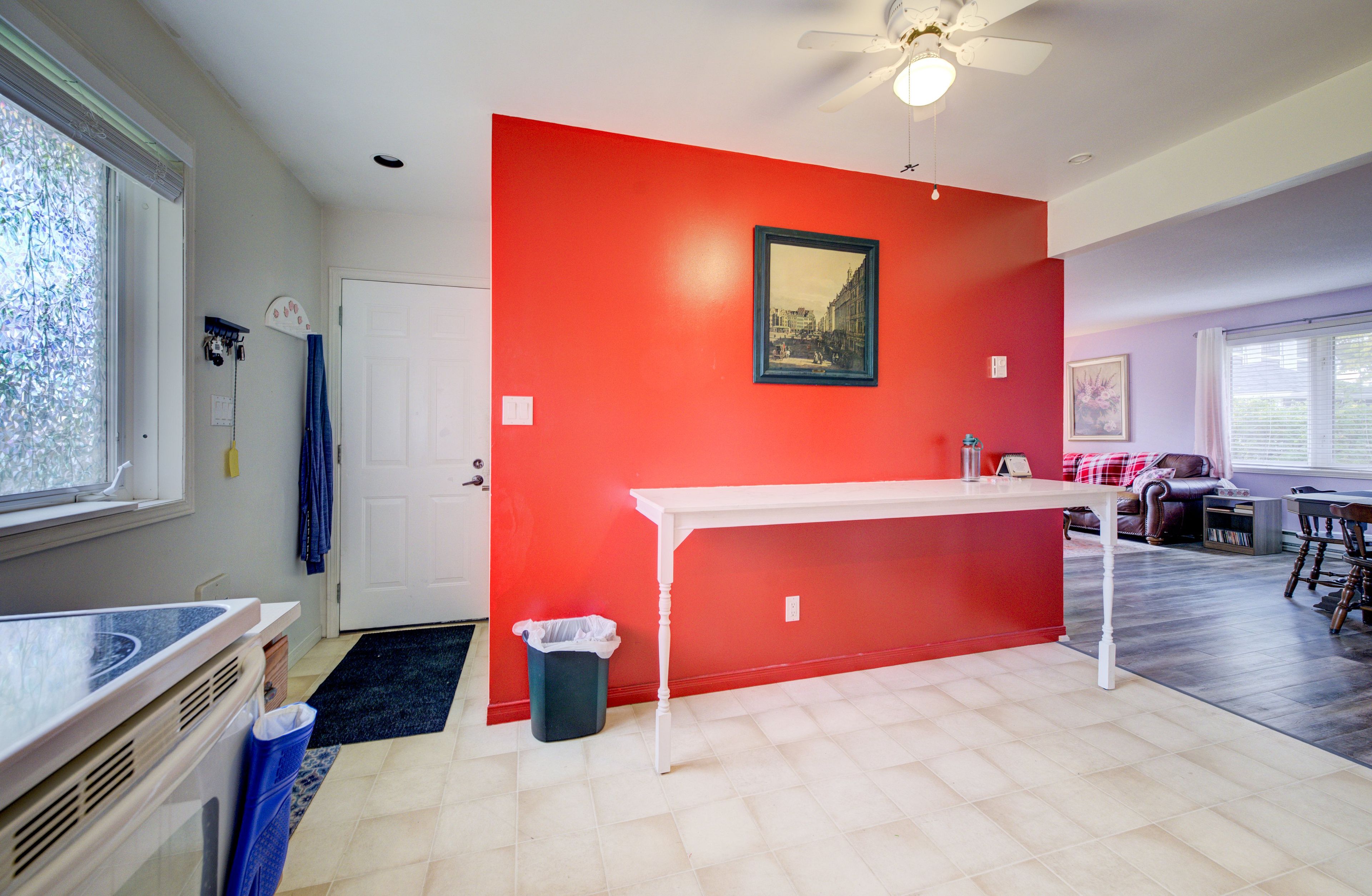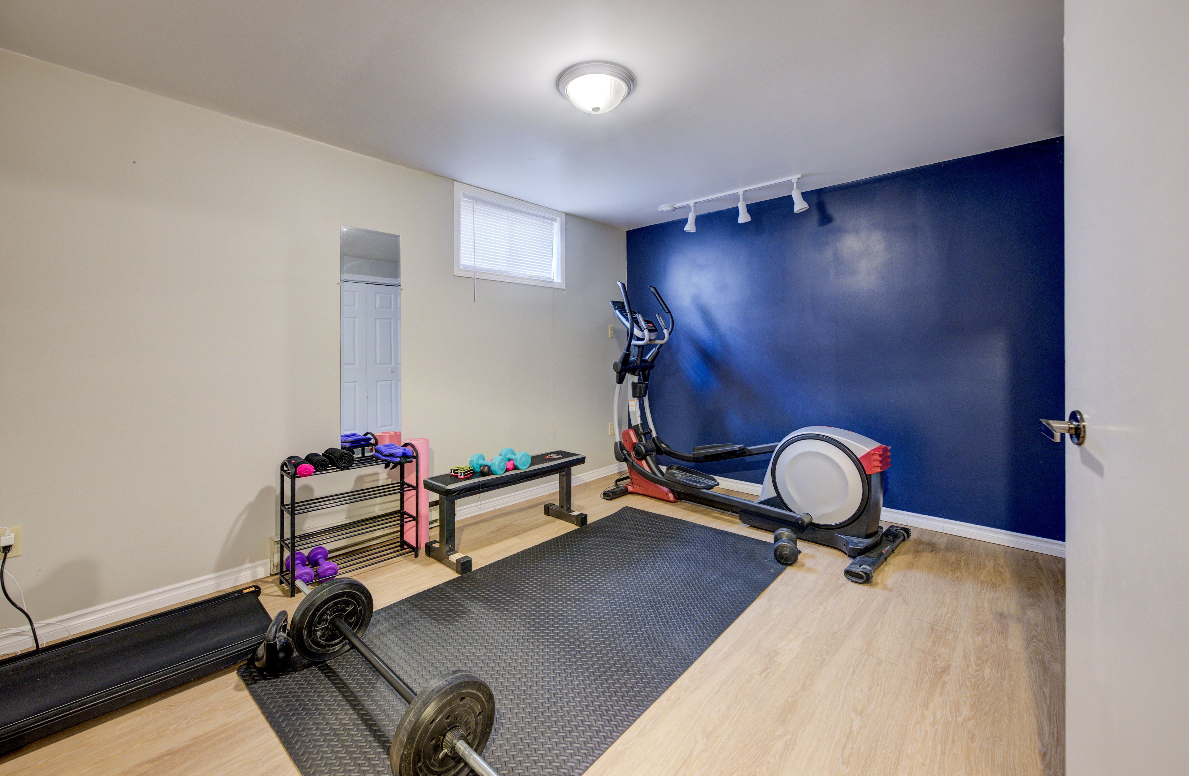 • Bright basement with high ceilings and a cozy pellet stove.