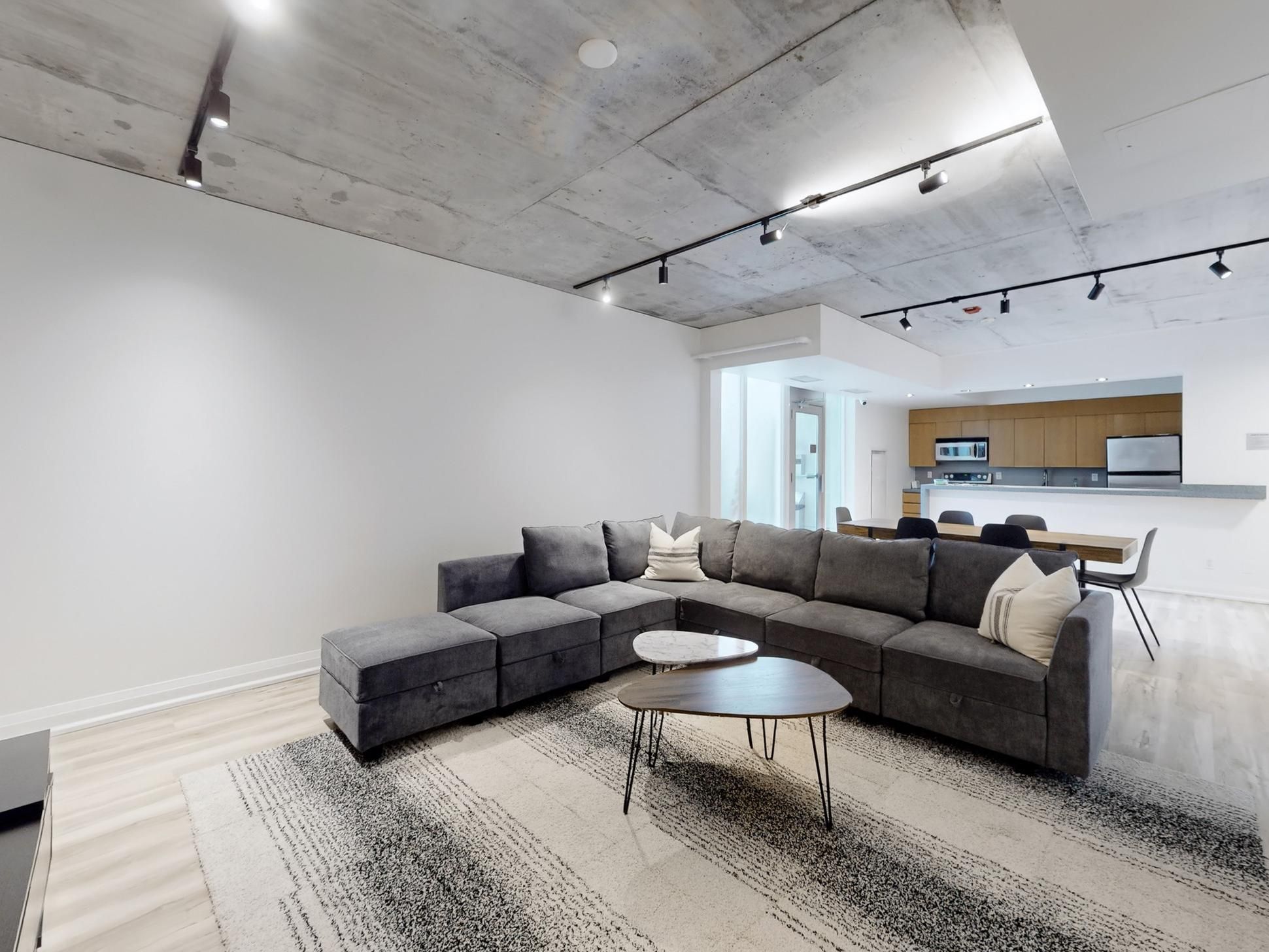 • Stylish 1-bedroom loft with exposed concrete ceilings and floor-to-ceiling windows.