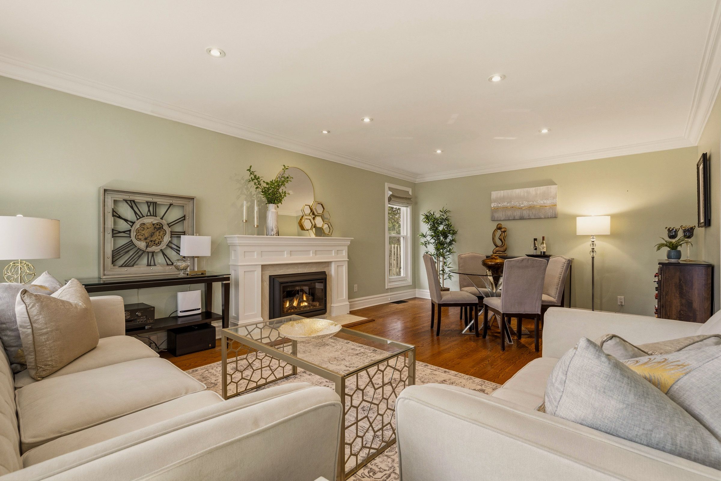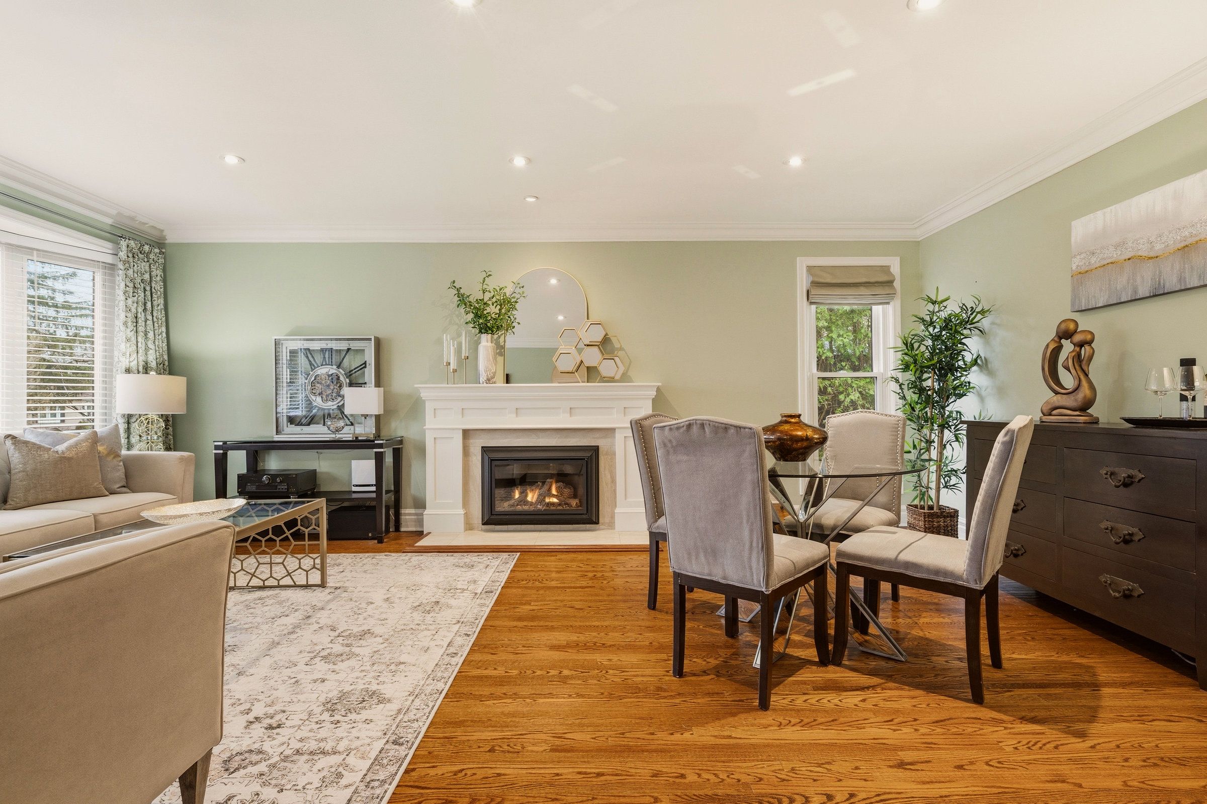 • Bright living/dining area with hardwood floors and a cozy gas fireplace.
