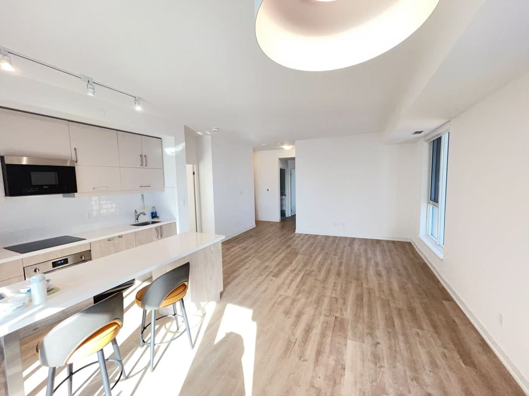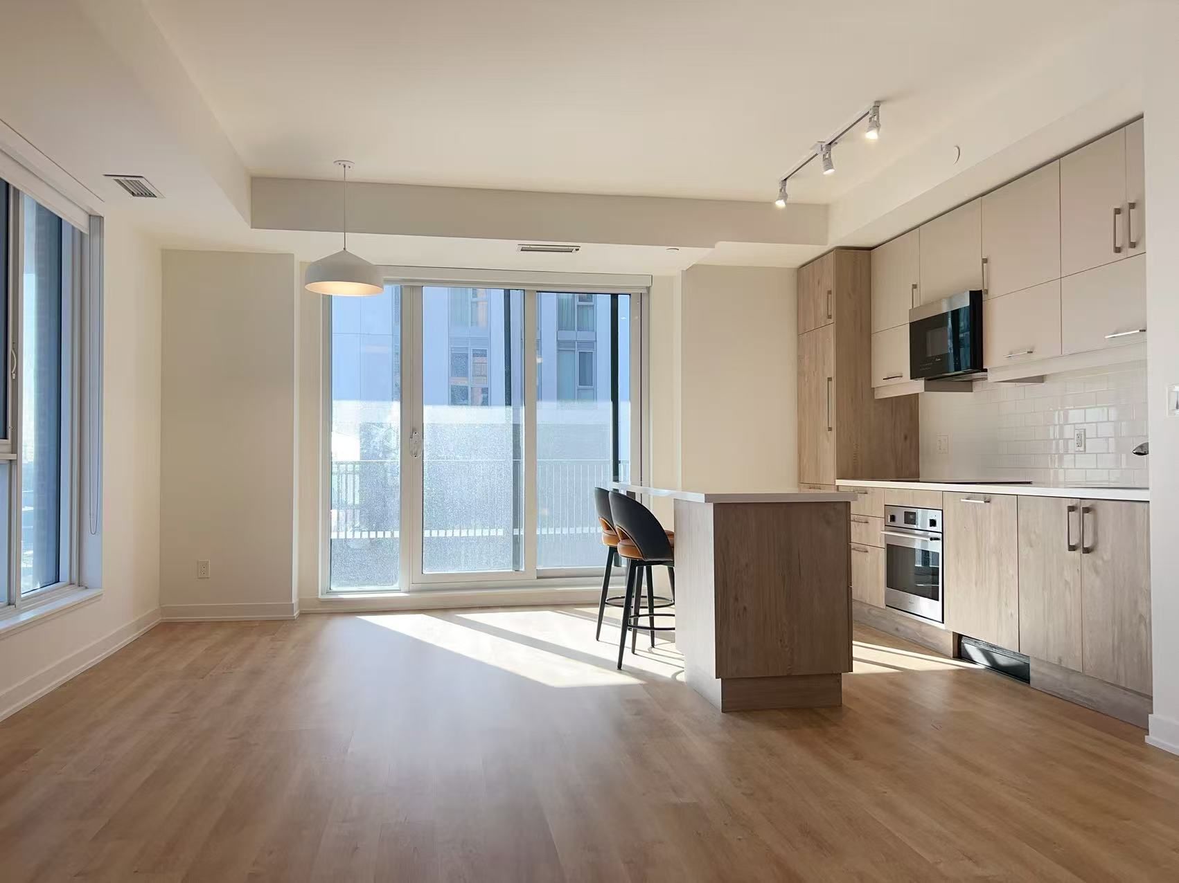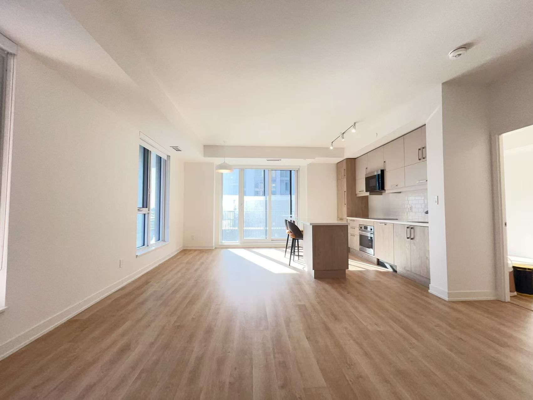 **a fully enclosed den be used as a third bedroom**this brand-new, never-lived-in corner residence offers approximately 1,200 sq. Ft. Of thoughtfully designed living space, featuring 2 spacious bedrooms plus a fully enclosed den be used as a third bedroom. The functional open-concept layout is enhanced by 9-ft ceilings, wide-plank wood flooring throughout, and floor-to-ceiling windows that fill the home with natural light. The contemporary chef's kitchen showcases paneled built-in appliances, stone countertops and backsplash. Enjoy seamless indoor-outdoor living with two generous balconies. 1 parking space and 1 locker are included for added convenience. Unbeatable location steps to viva transit, go station, whole foods, vip cineplex, top restaurants, shops, banks, and parks, with quick access to highways 404 & 407. A perfect blend of style, comfort, and convenience in one of markham's most vibrant communities.