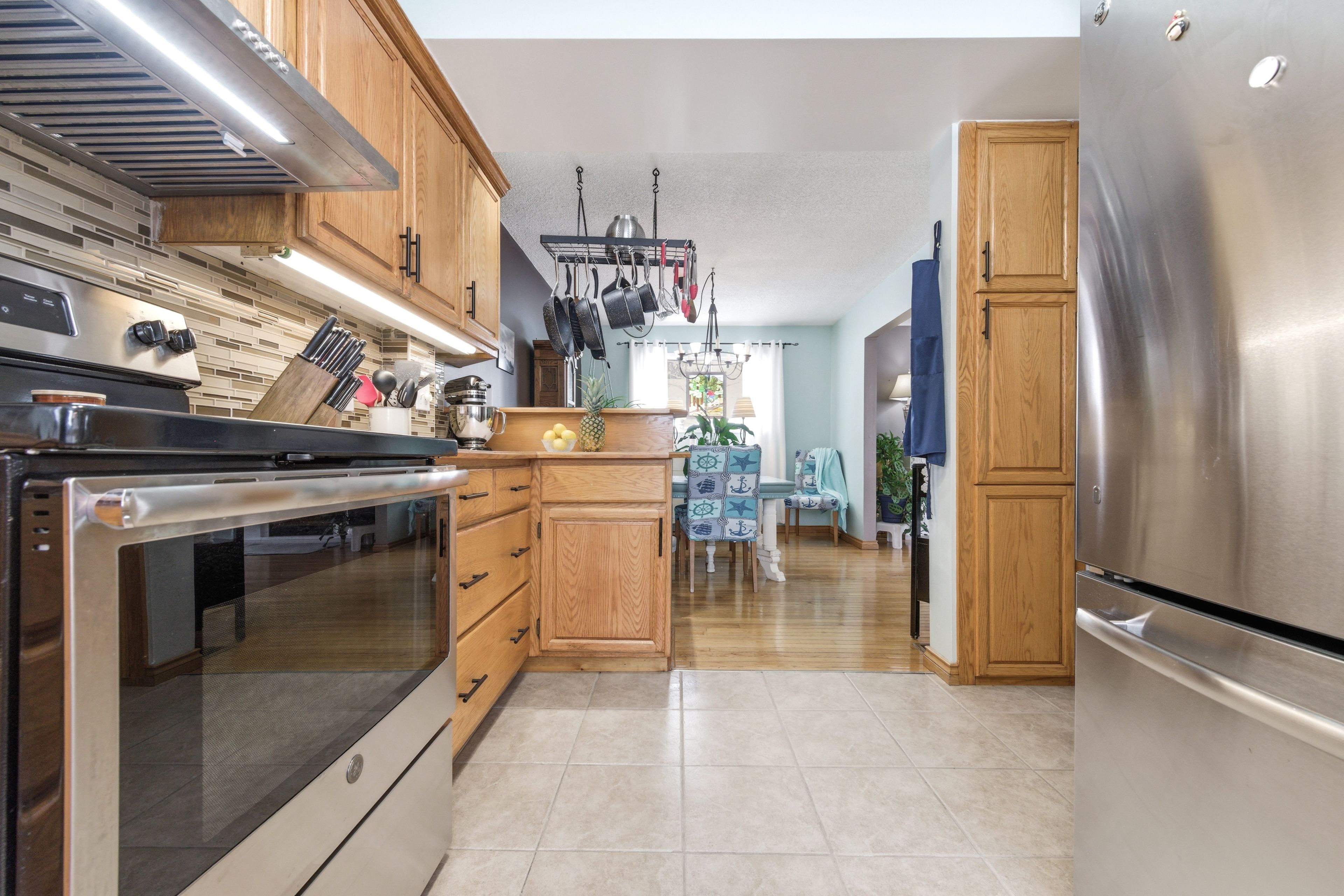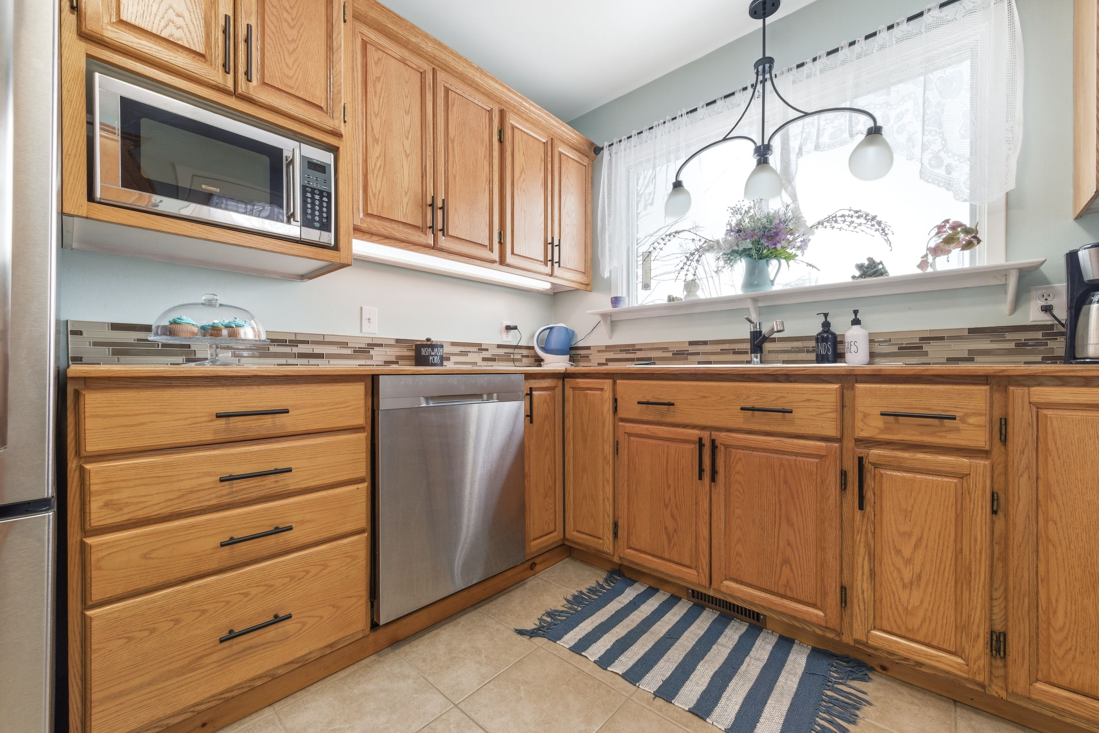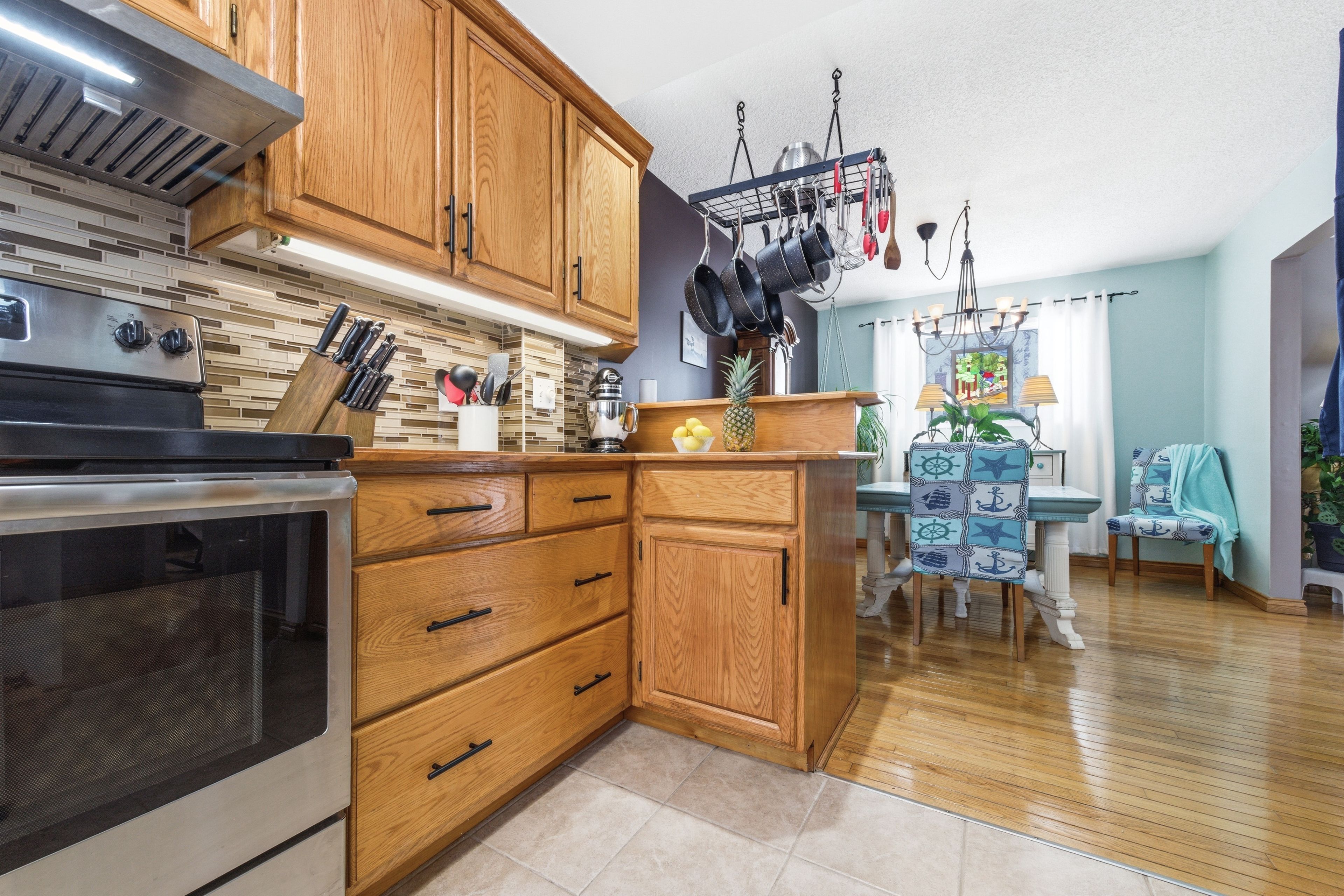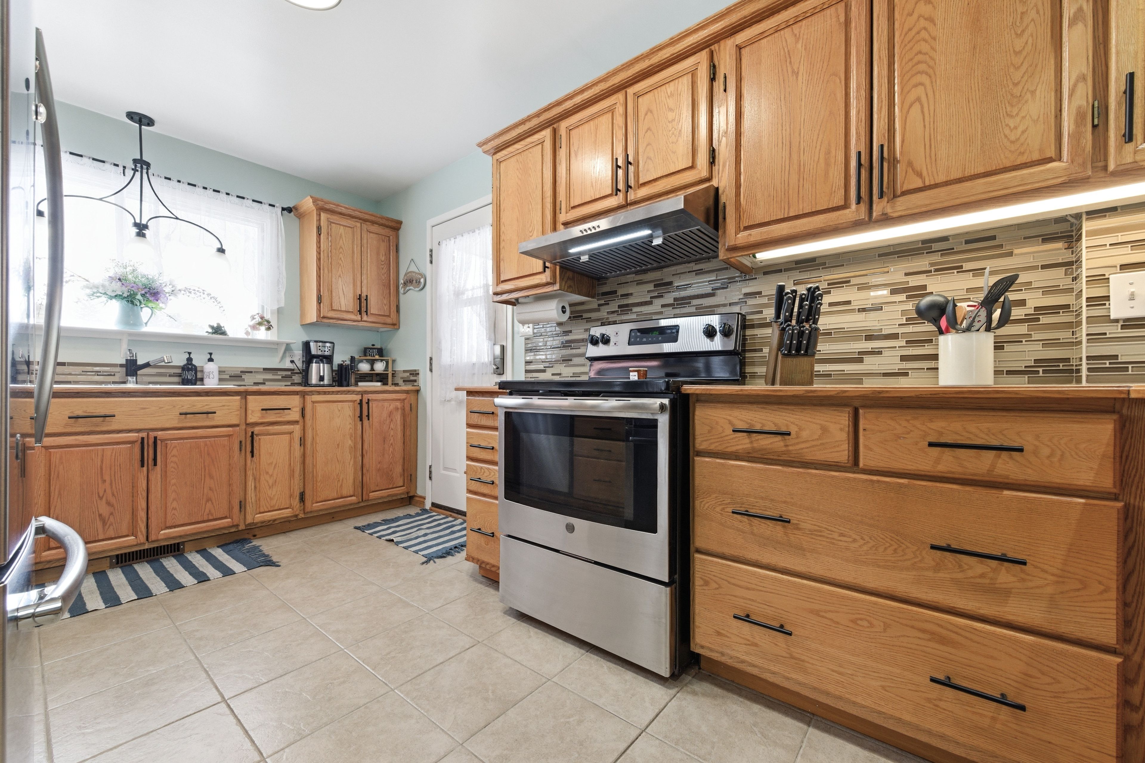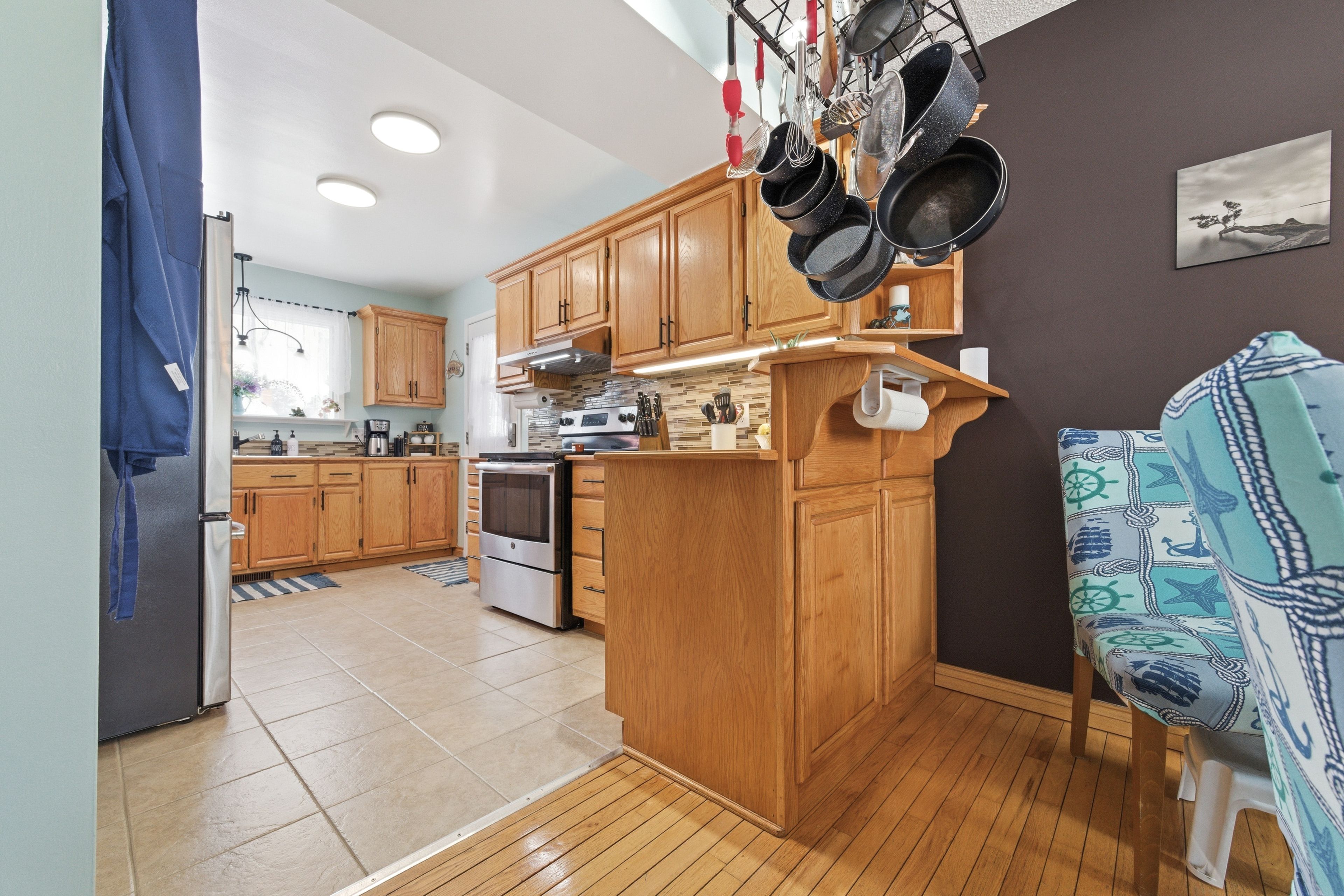 • Updated kitchen with wood cabinetry and stainless steel appliances for organized cooking.