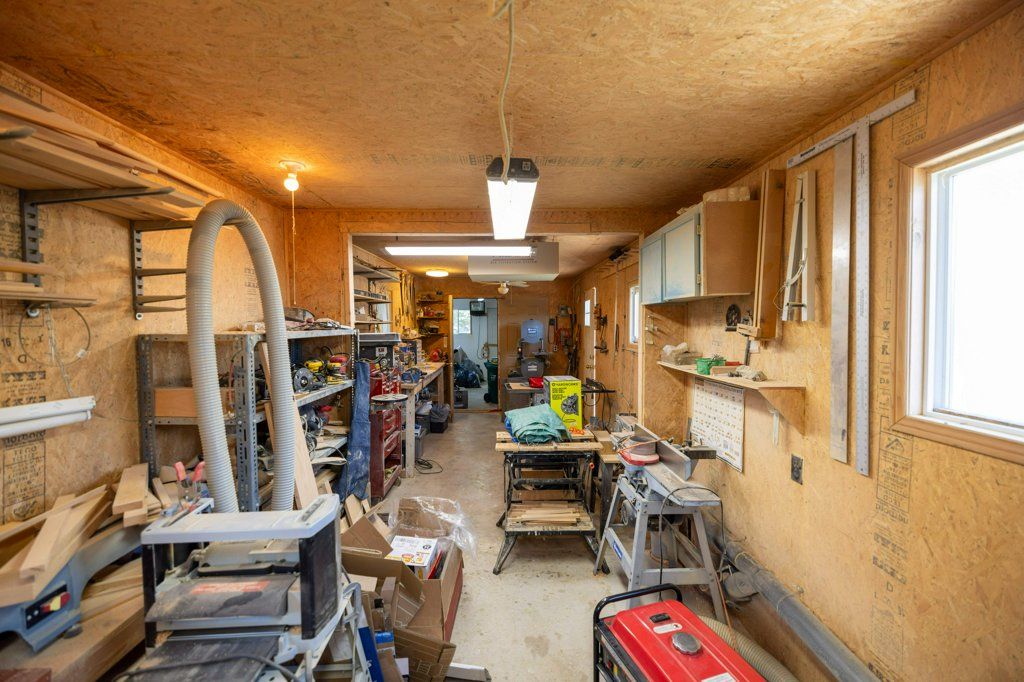 • Two-section workshop with an air filtration system for hobbyists and ample storage.