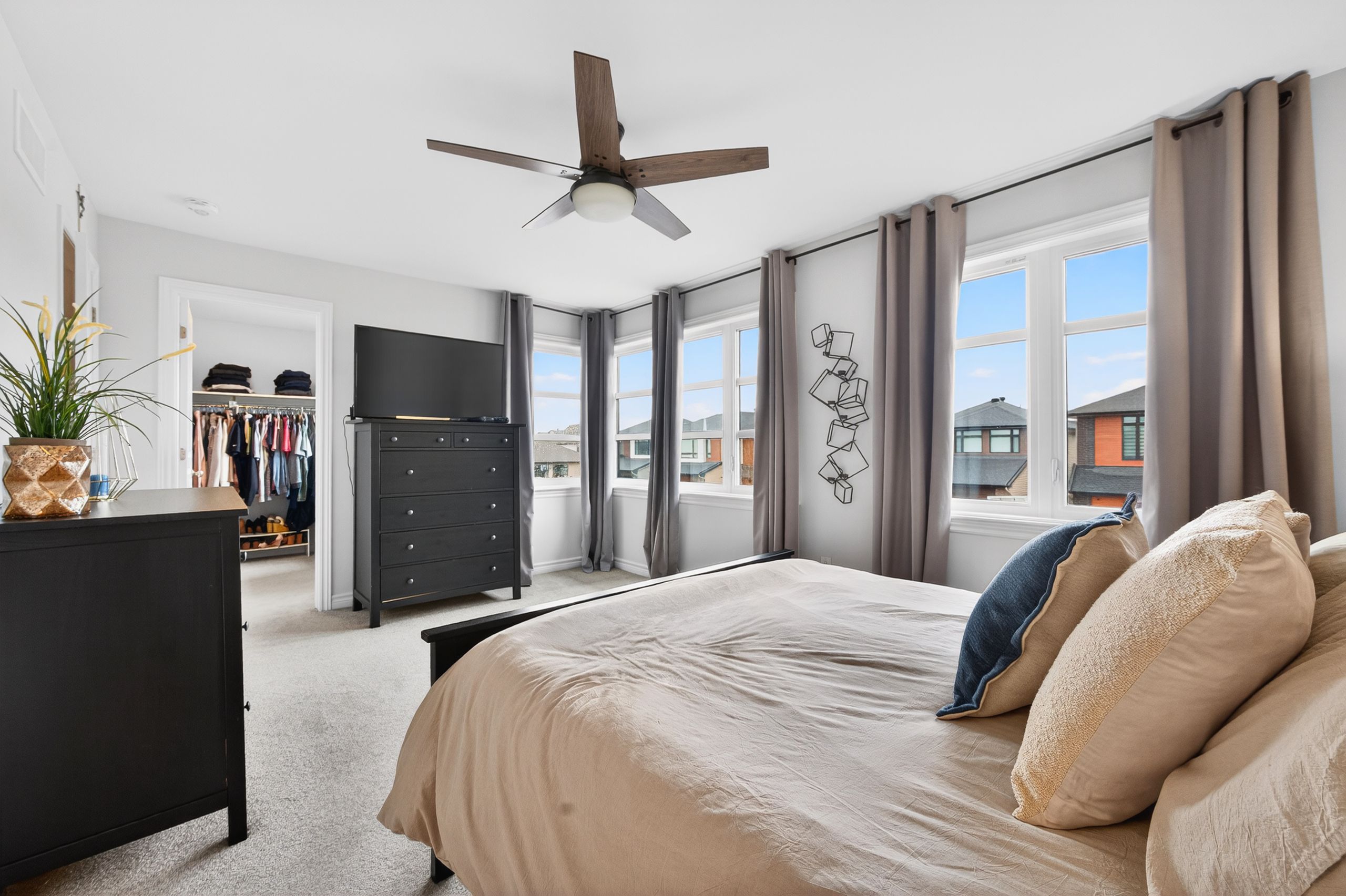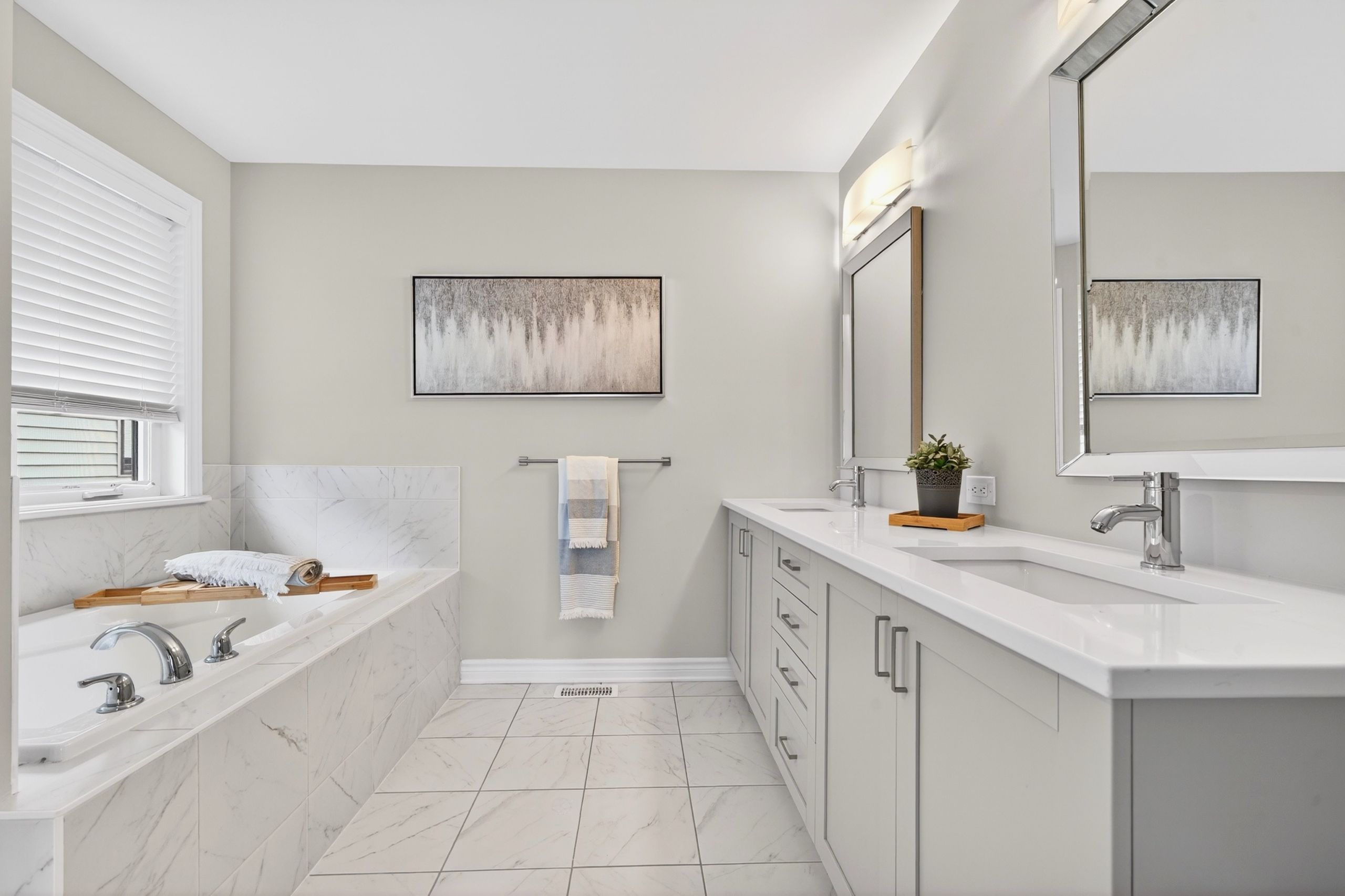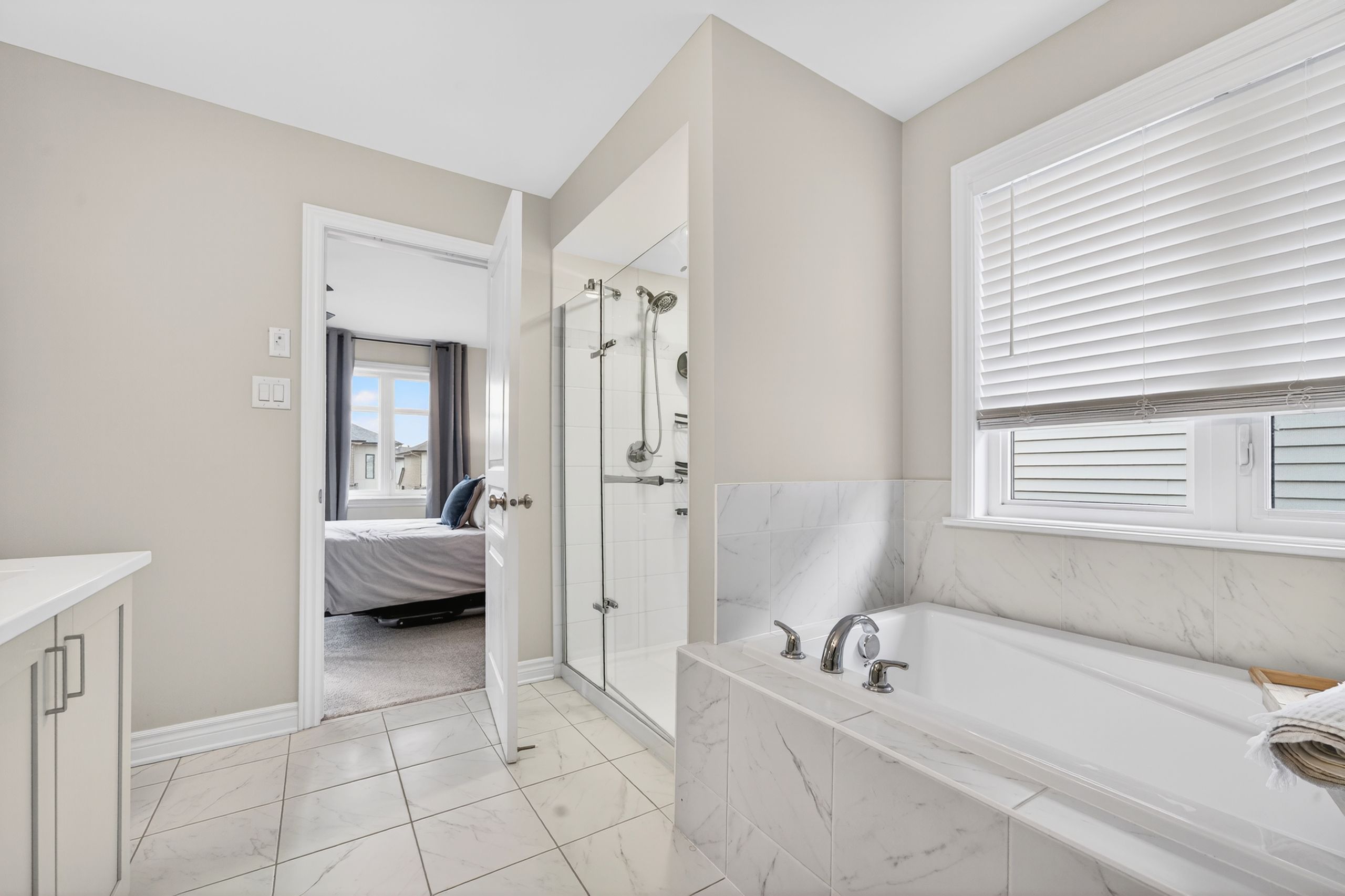 • Luxurious primary bedroom with a five-piece ensuite and modern tile details.