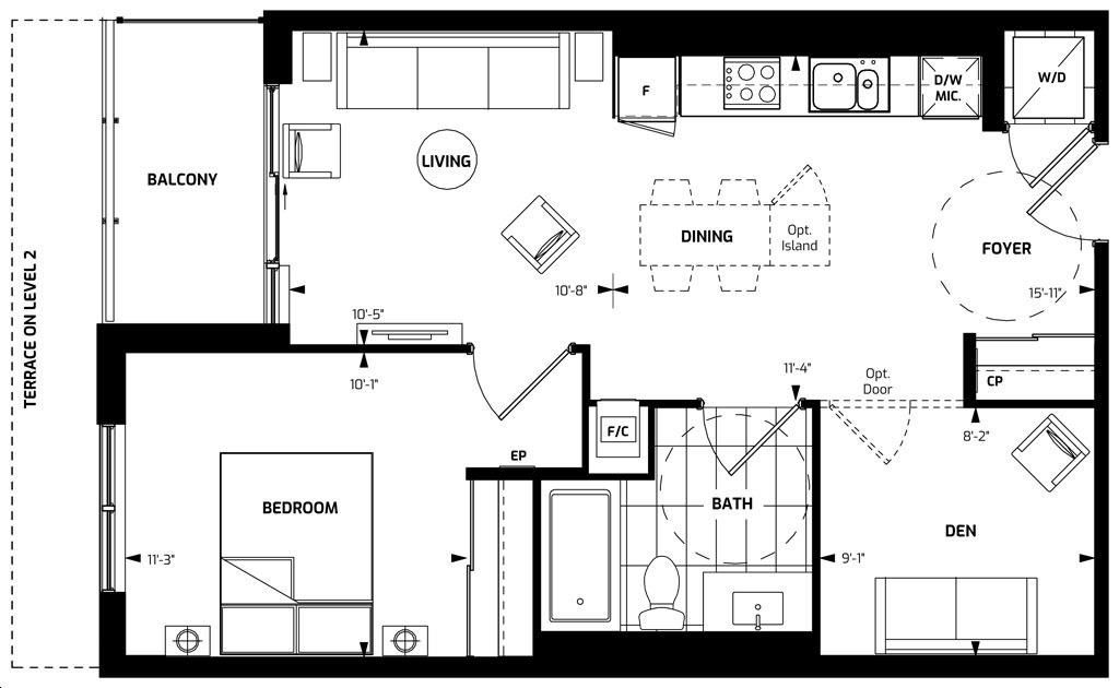 • Modern one-bedroom plus den condo with a north-facing balcony.
