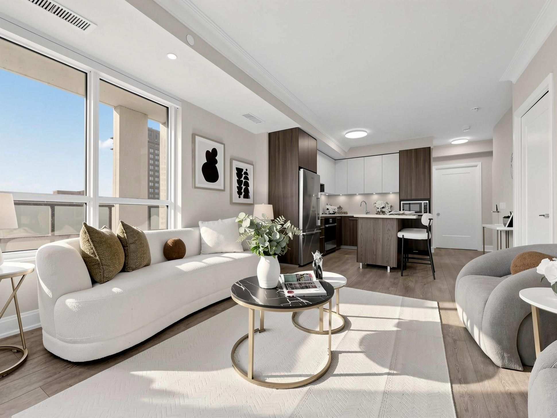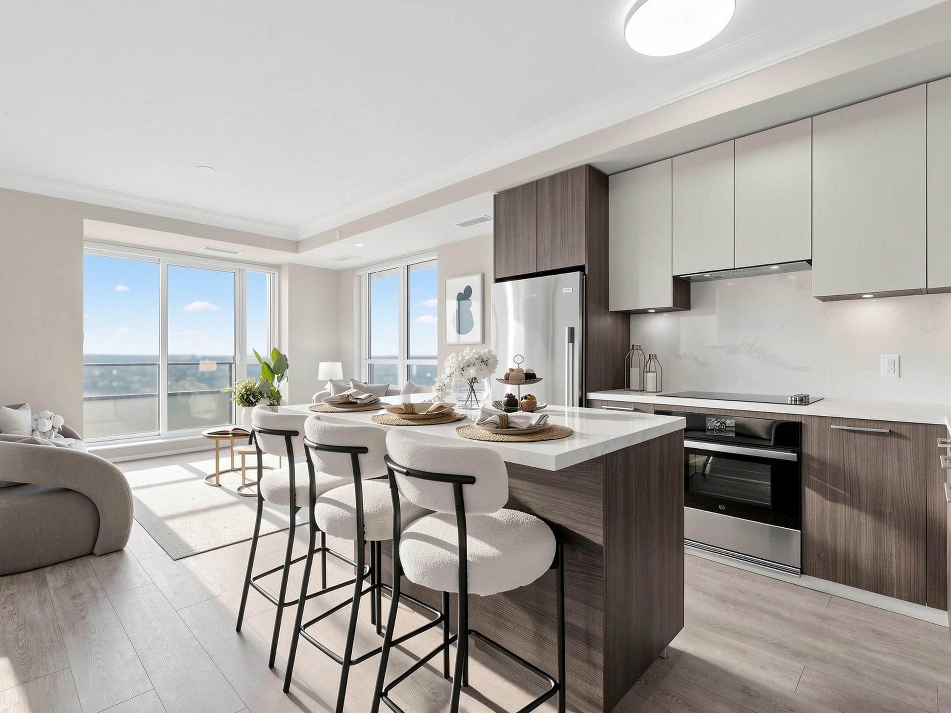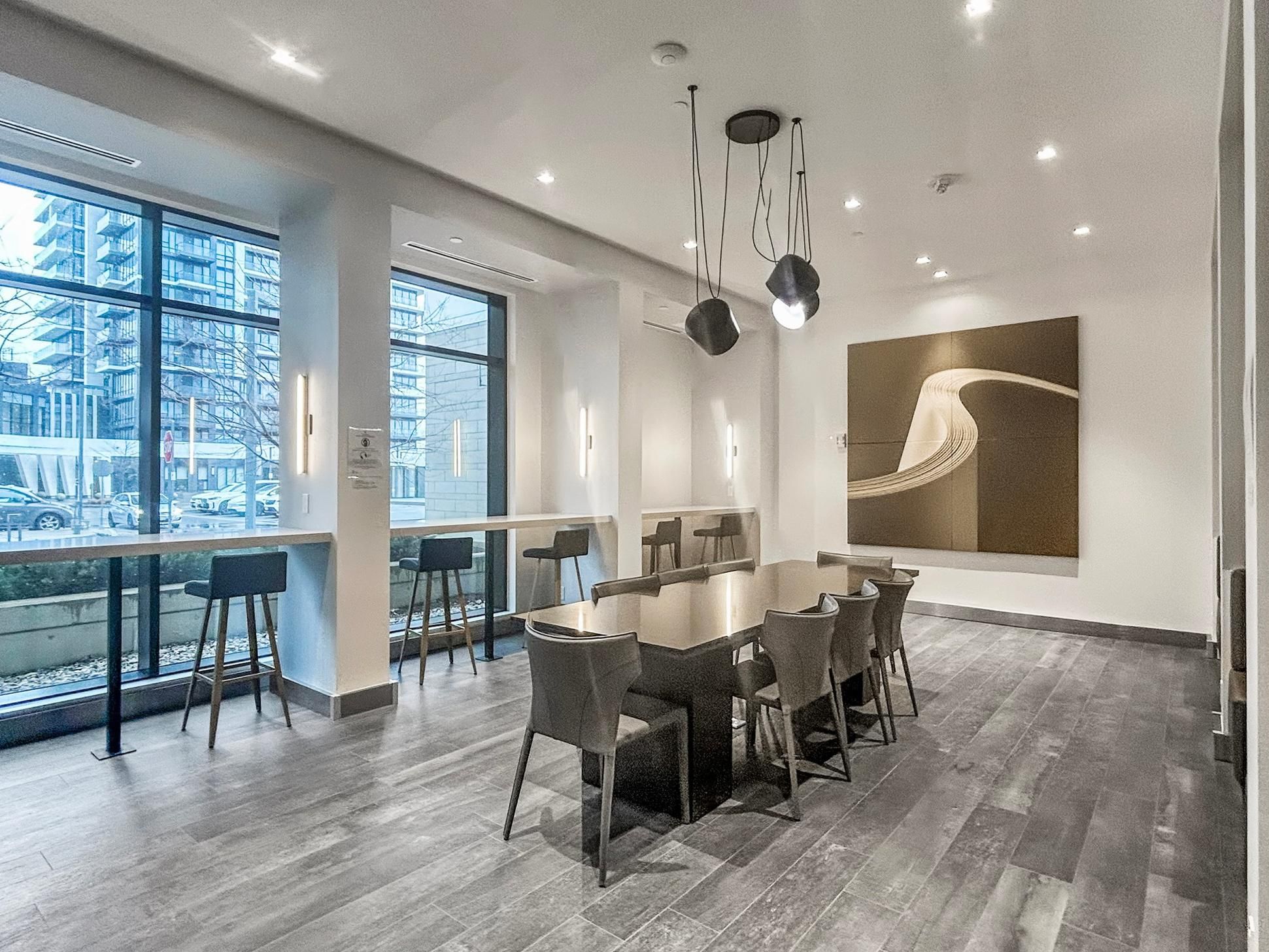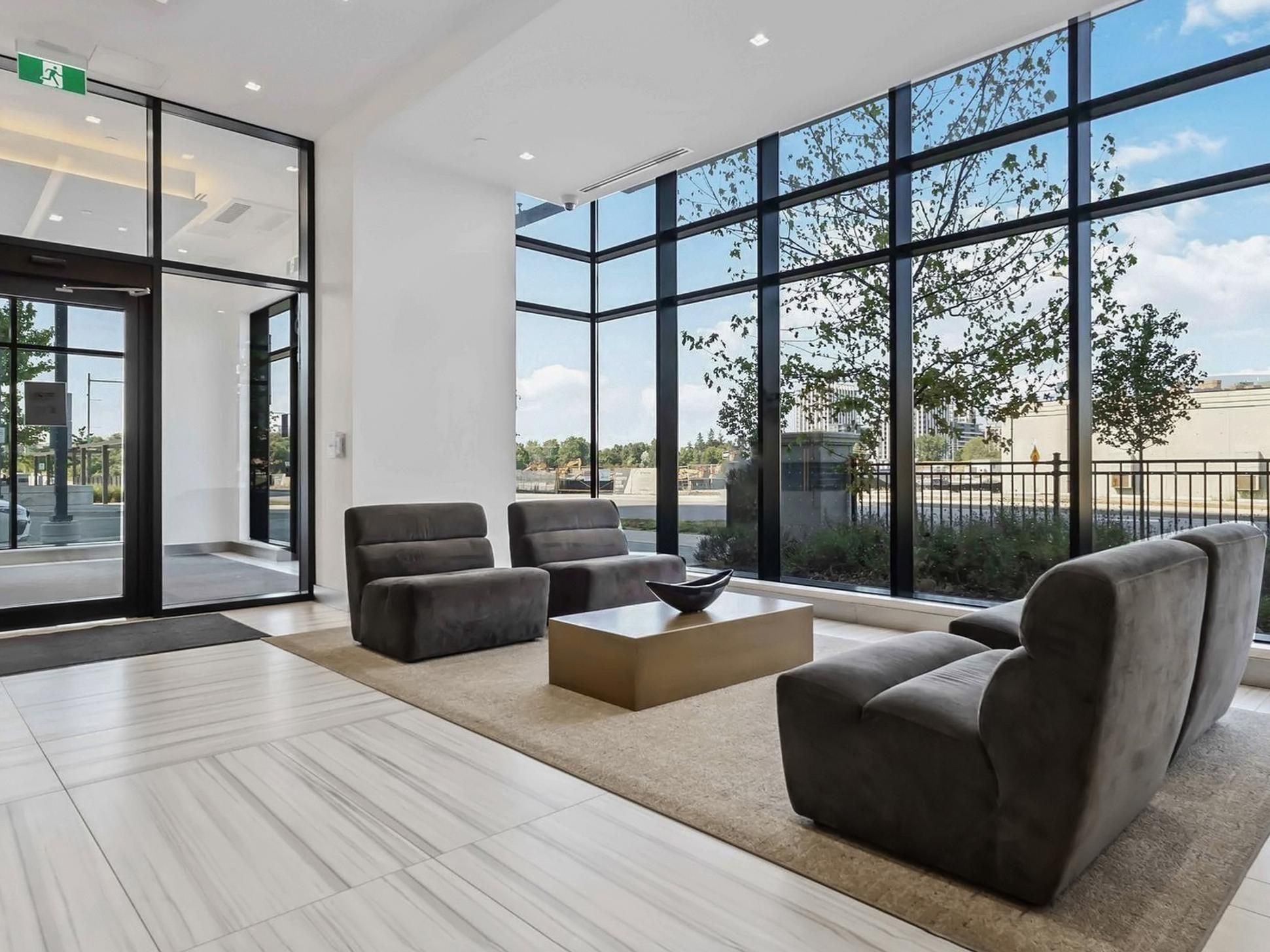 • Bright interior with floor-to-ceiling windows and smooth 9-ft ceilings.