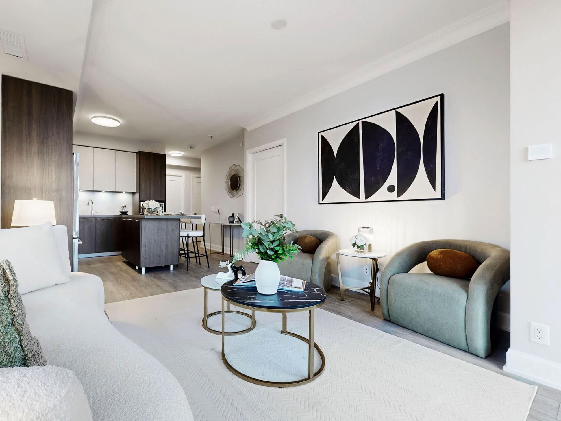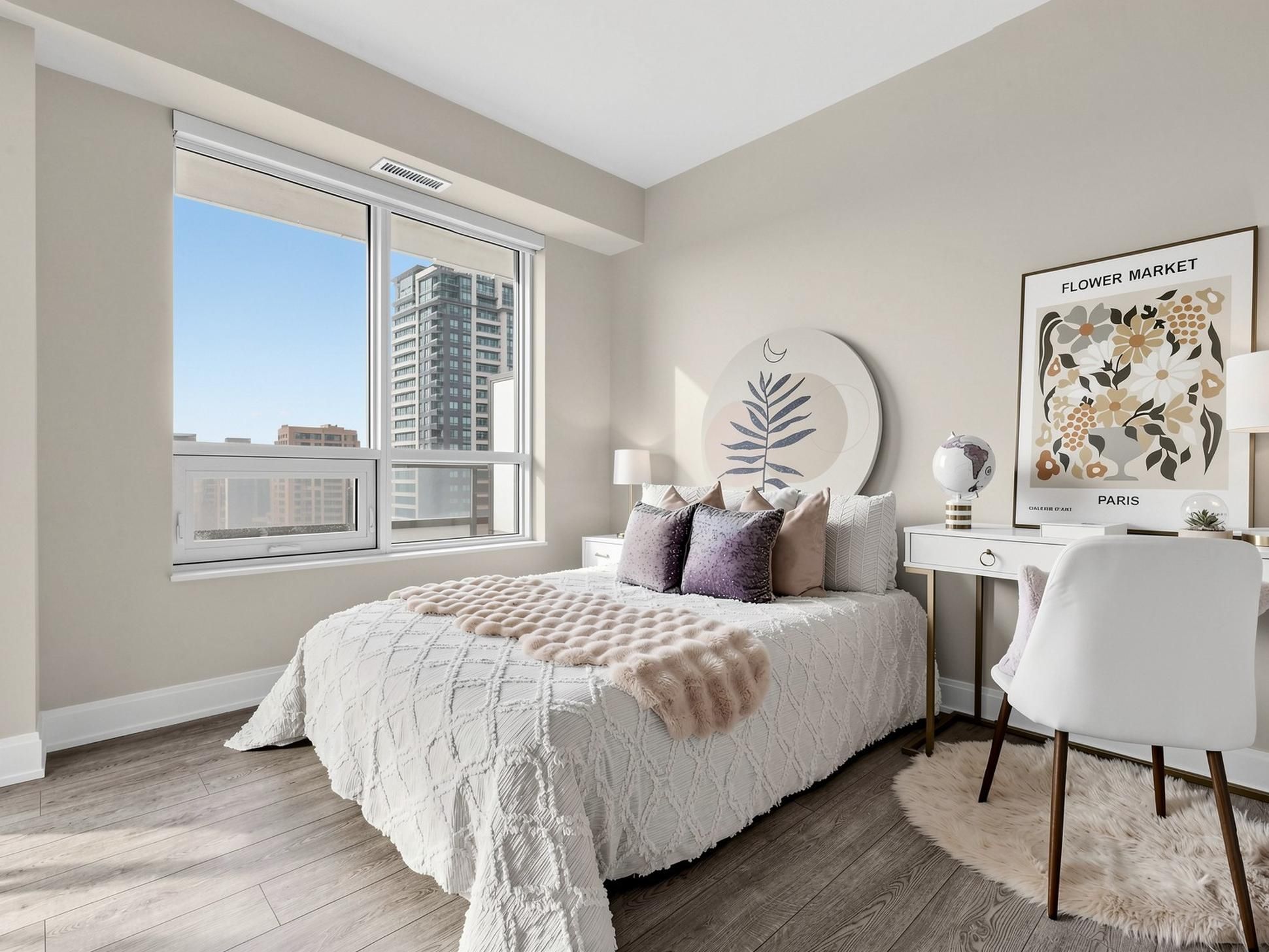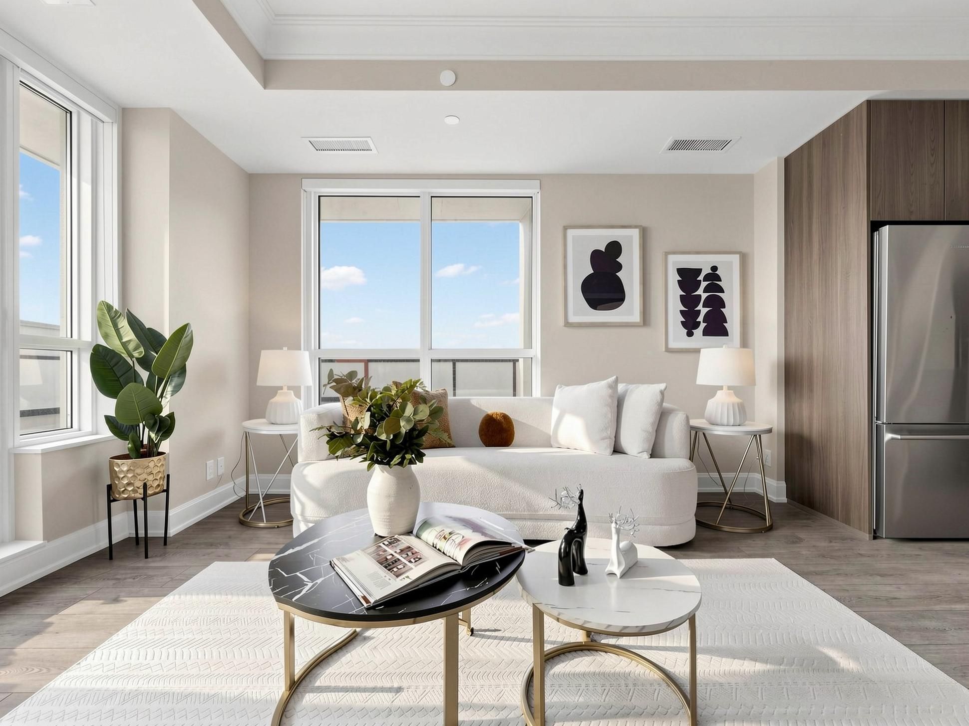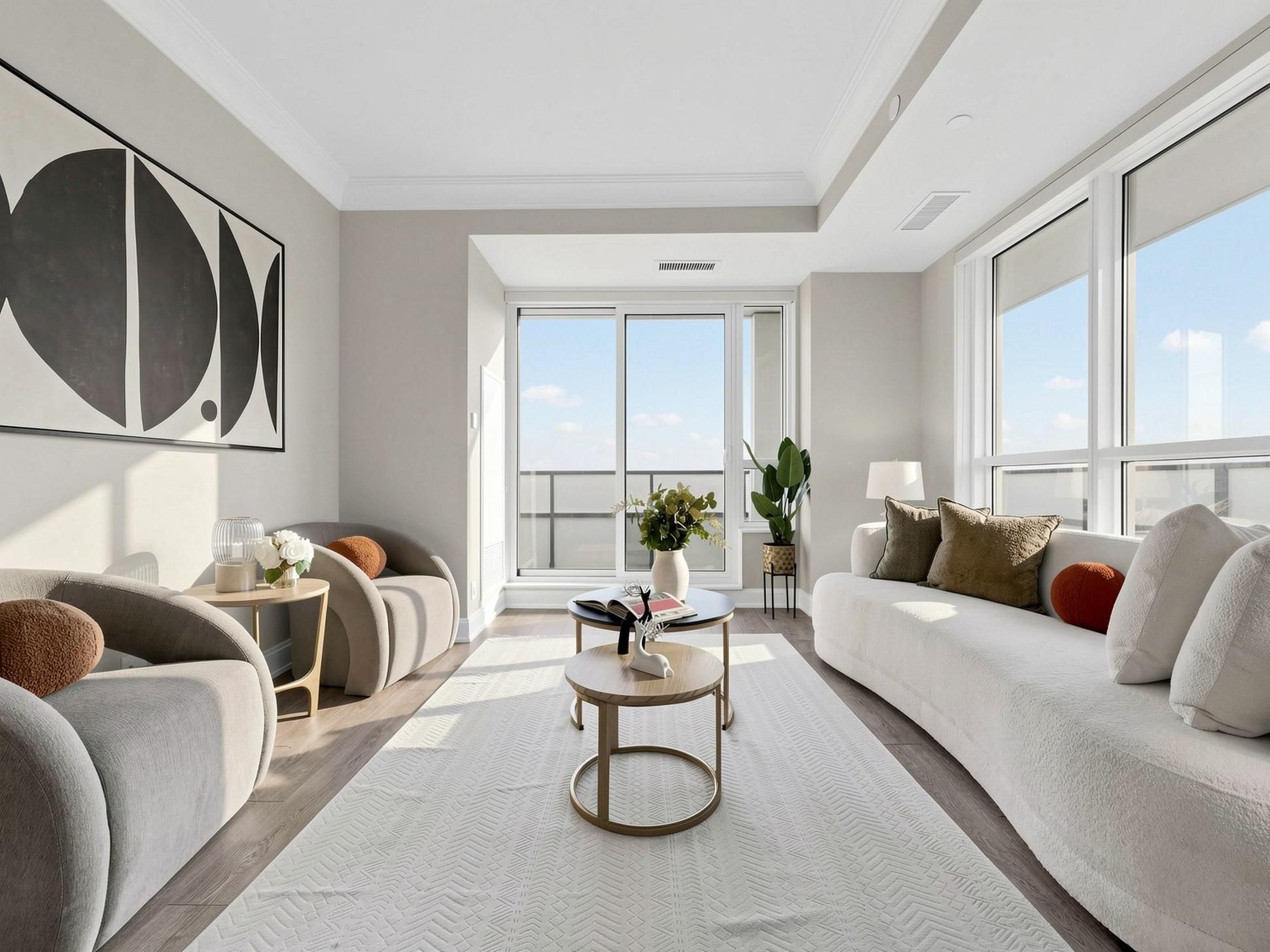• Bright interior with floor-to-ceiling windows and smooth 9-ft ceilings.