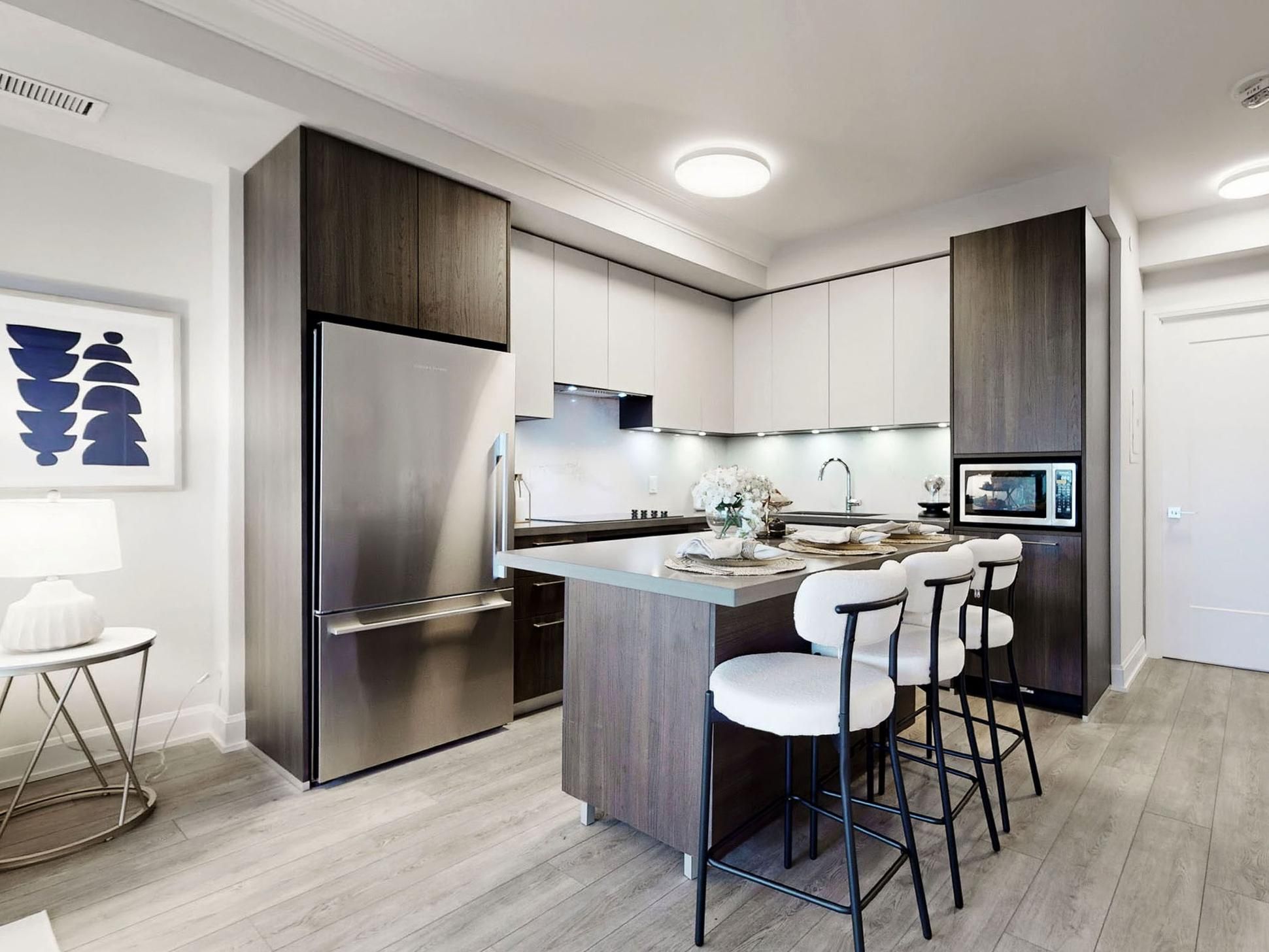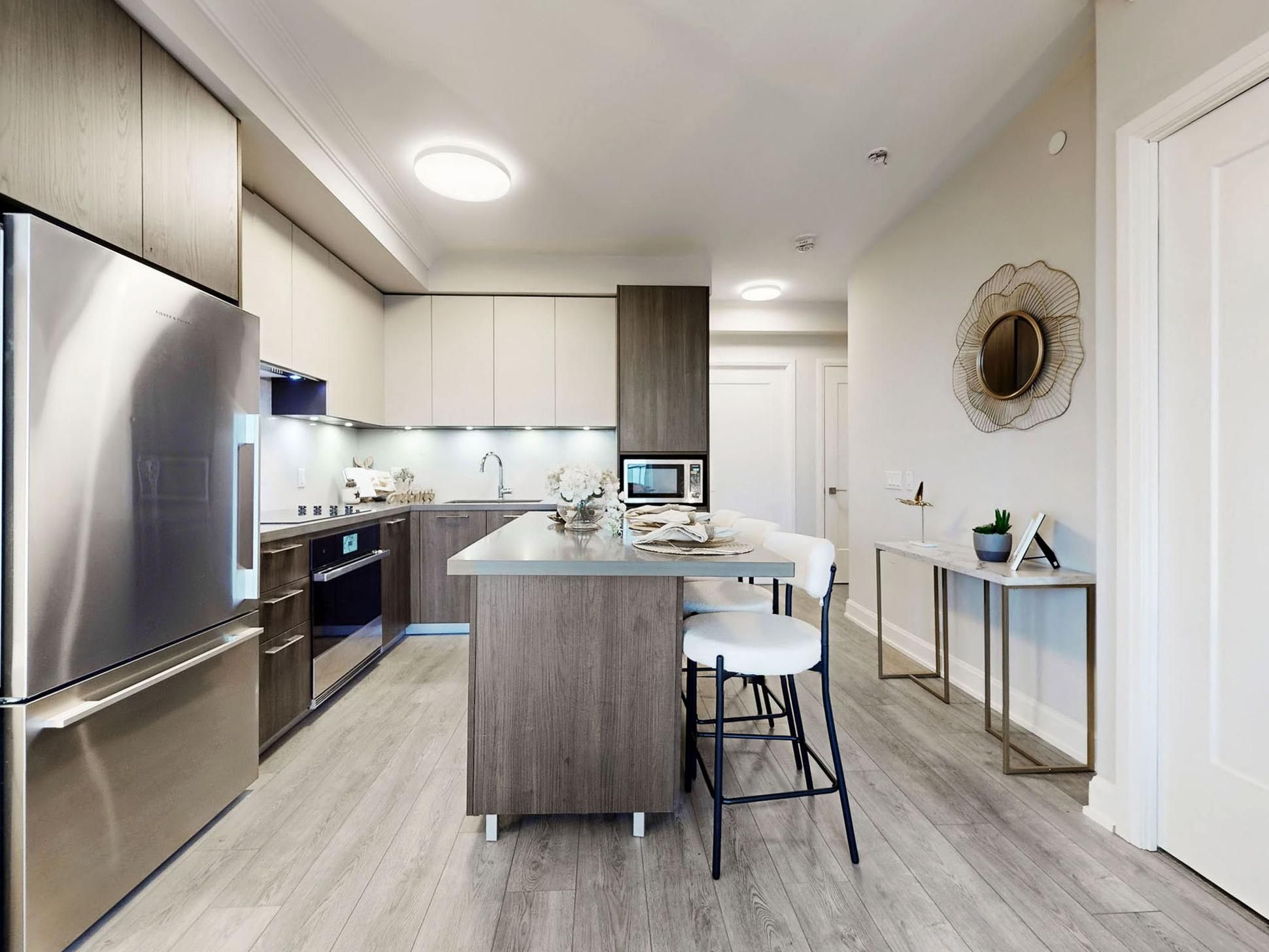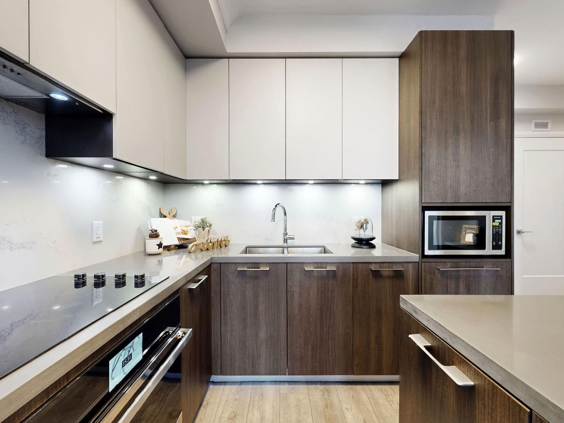 • Modern kitchen featuring high-end appliances and stylish quartz finishing.