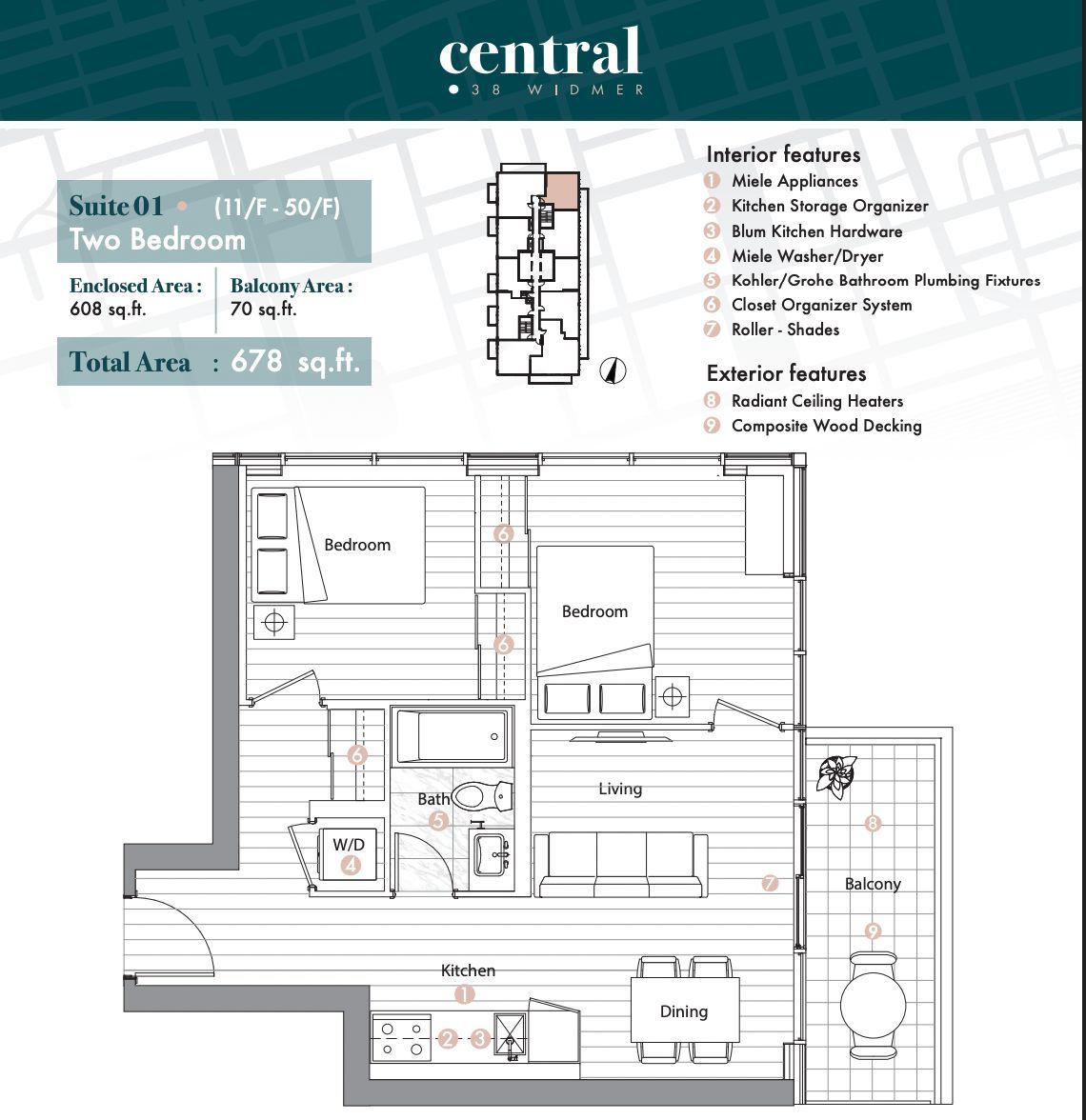 • Heated balcony and built-in closet organizers for extra comfort and convenience.