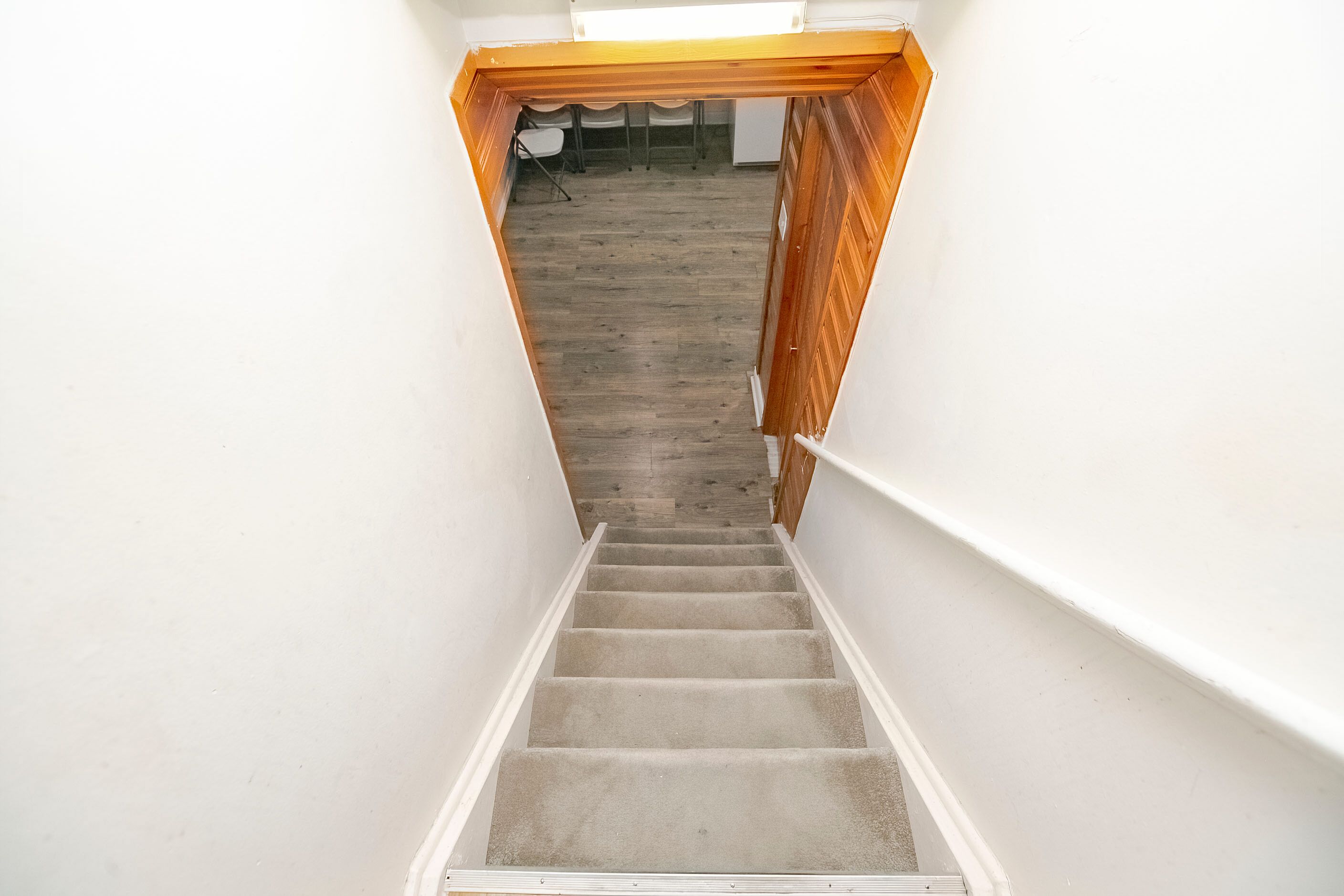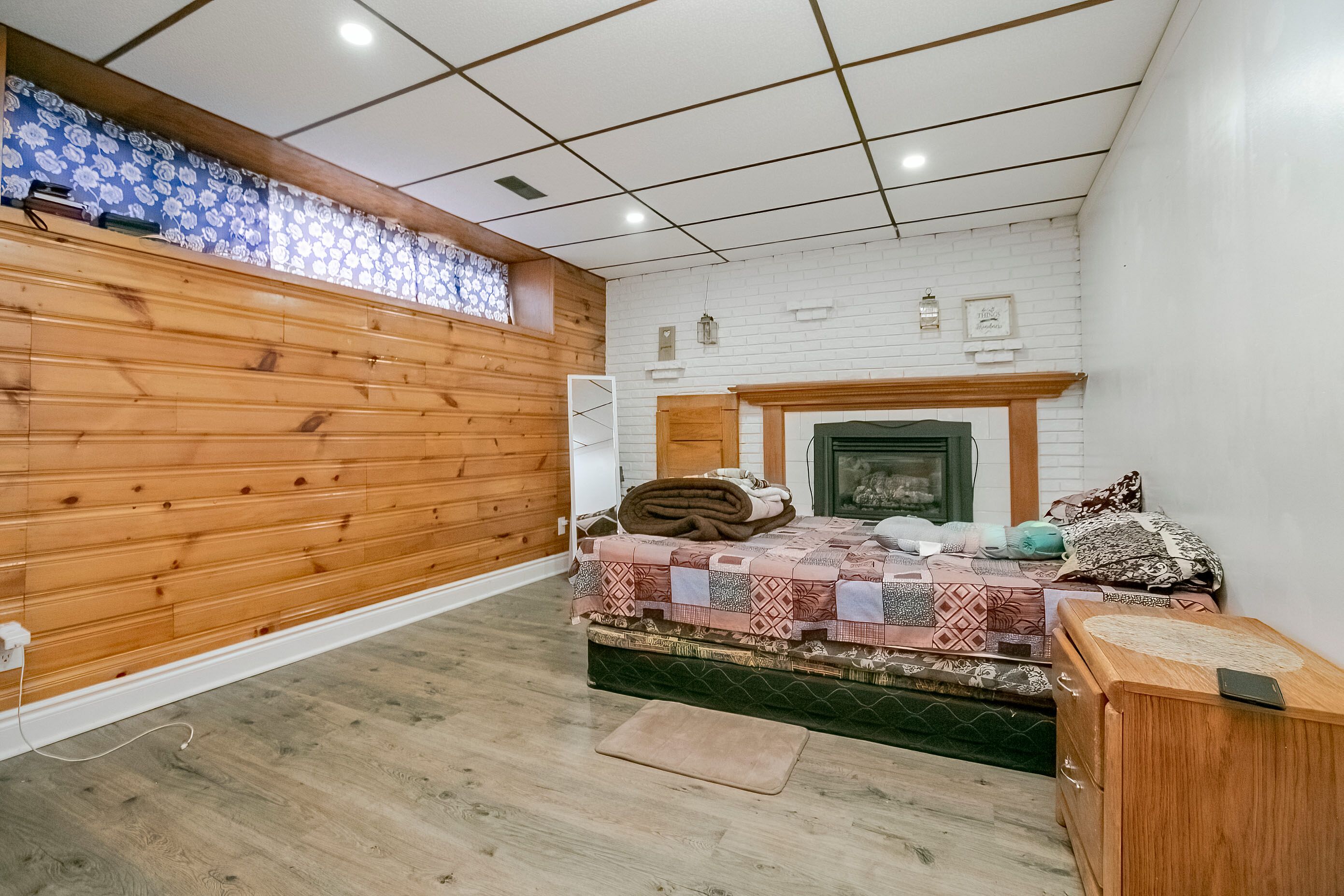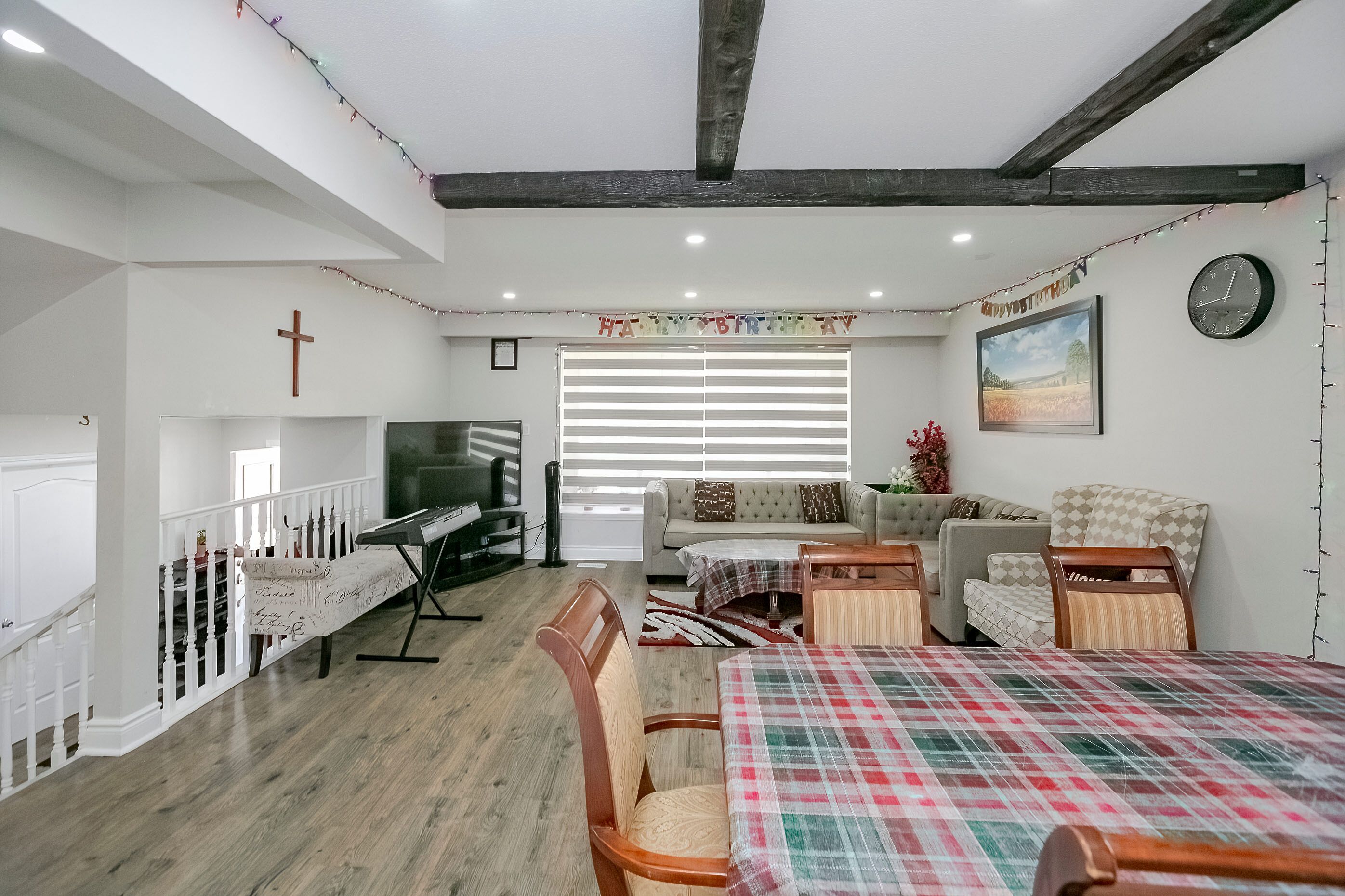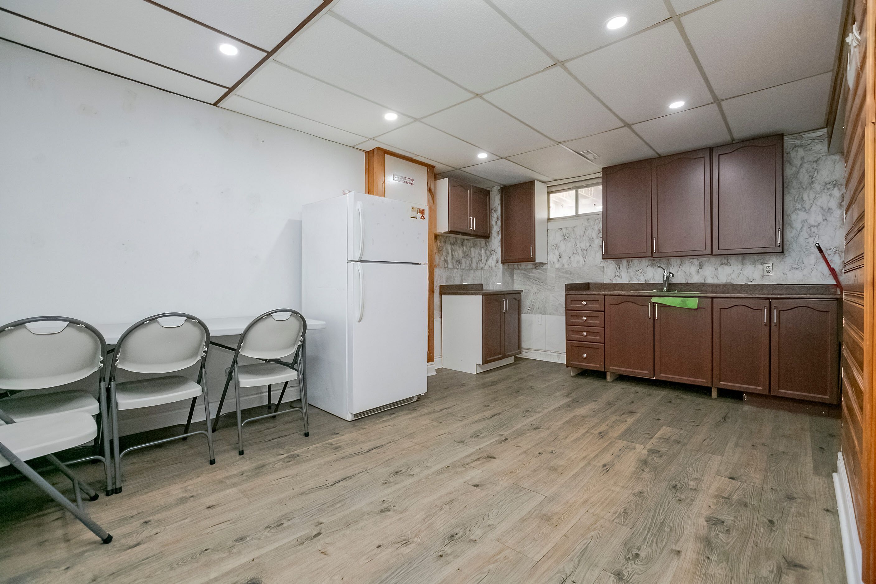 • Open concept family room with natural light from above-grade windows.