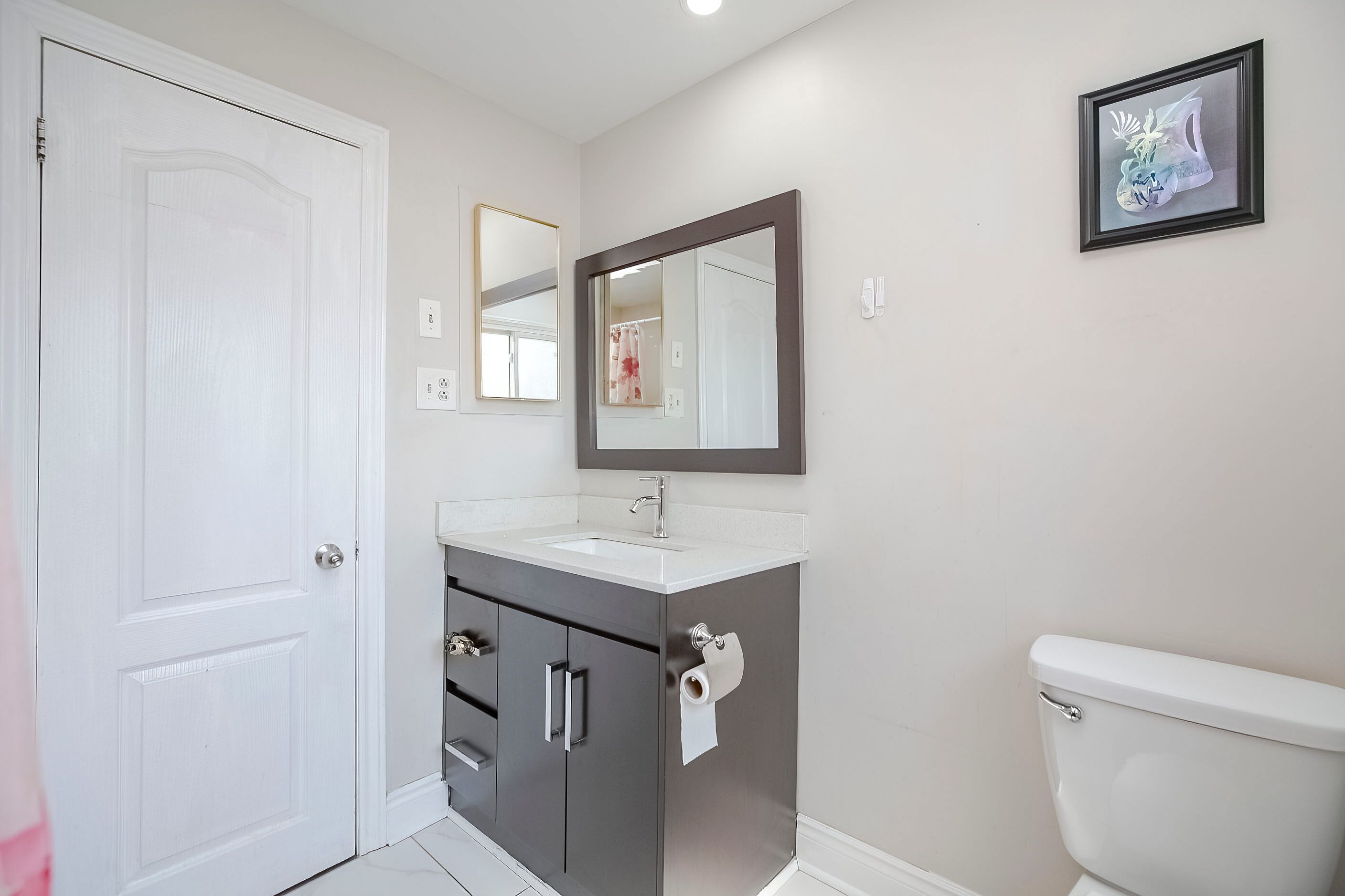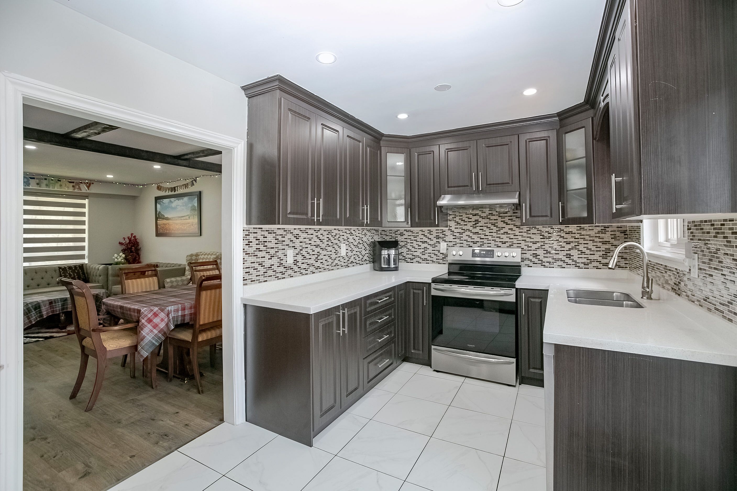 • Renovated kitchen featuring stainless steel appliances and quartz countertops.